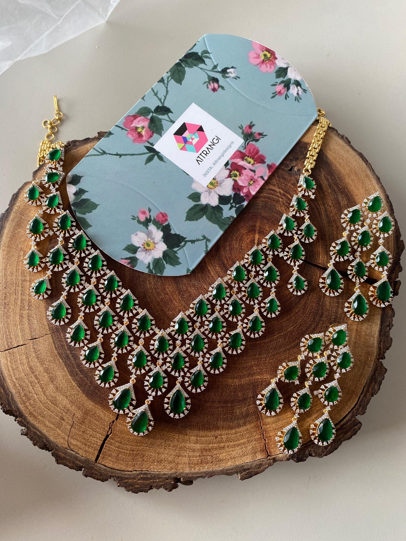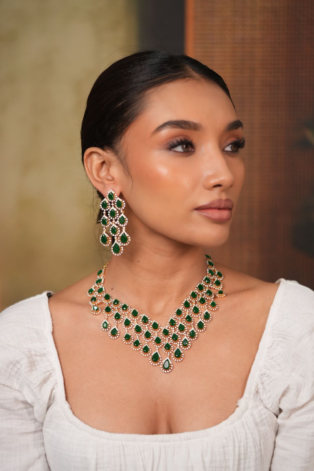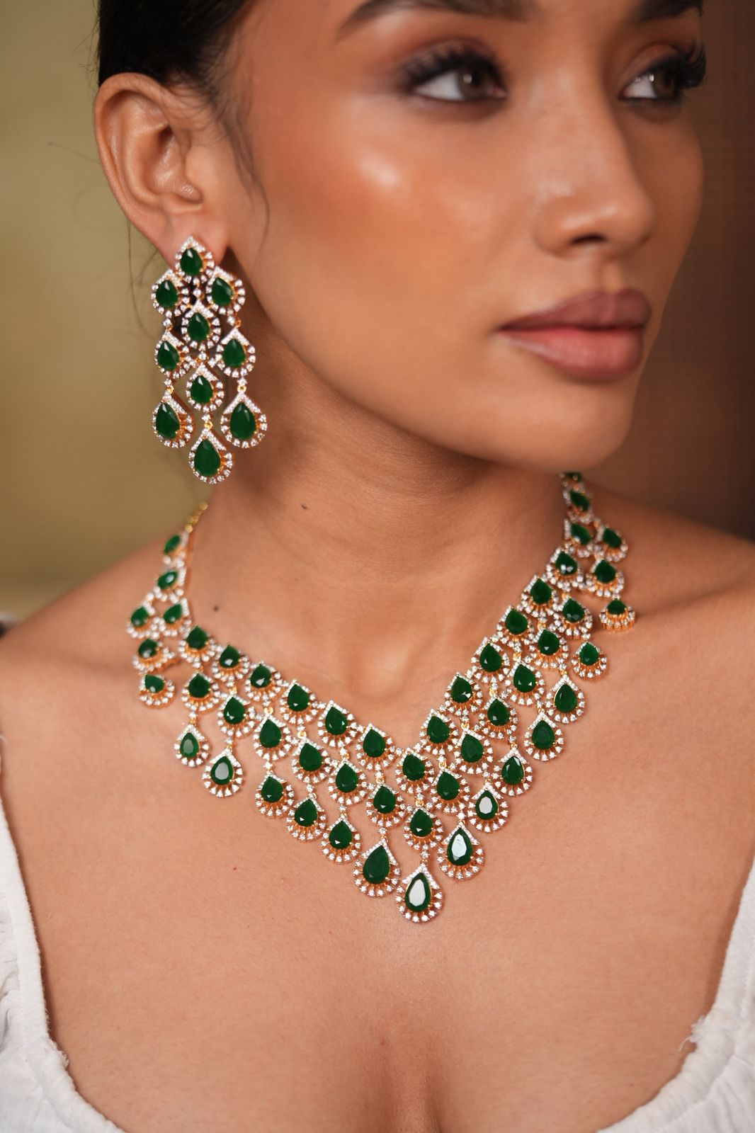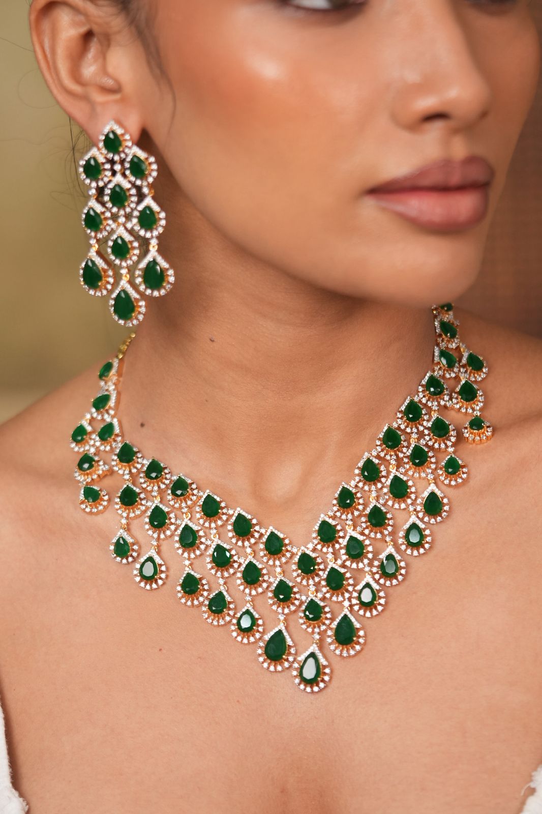 A huge bridal diamond set which has a gold polish, cascading emeralds with a row of diamonds around. It’s huge but gorgeous, comes with the best earrings too.