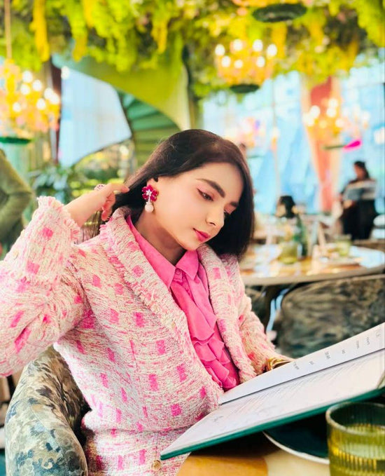 Ruby pink floral earrings with a hint of diamonds in the Center and rose Quartz at the bottom. Perfect for western wear.