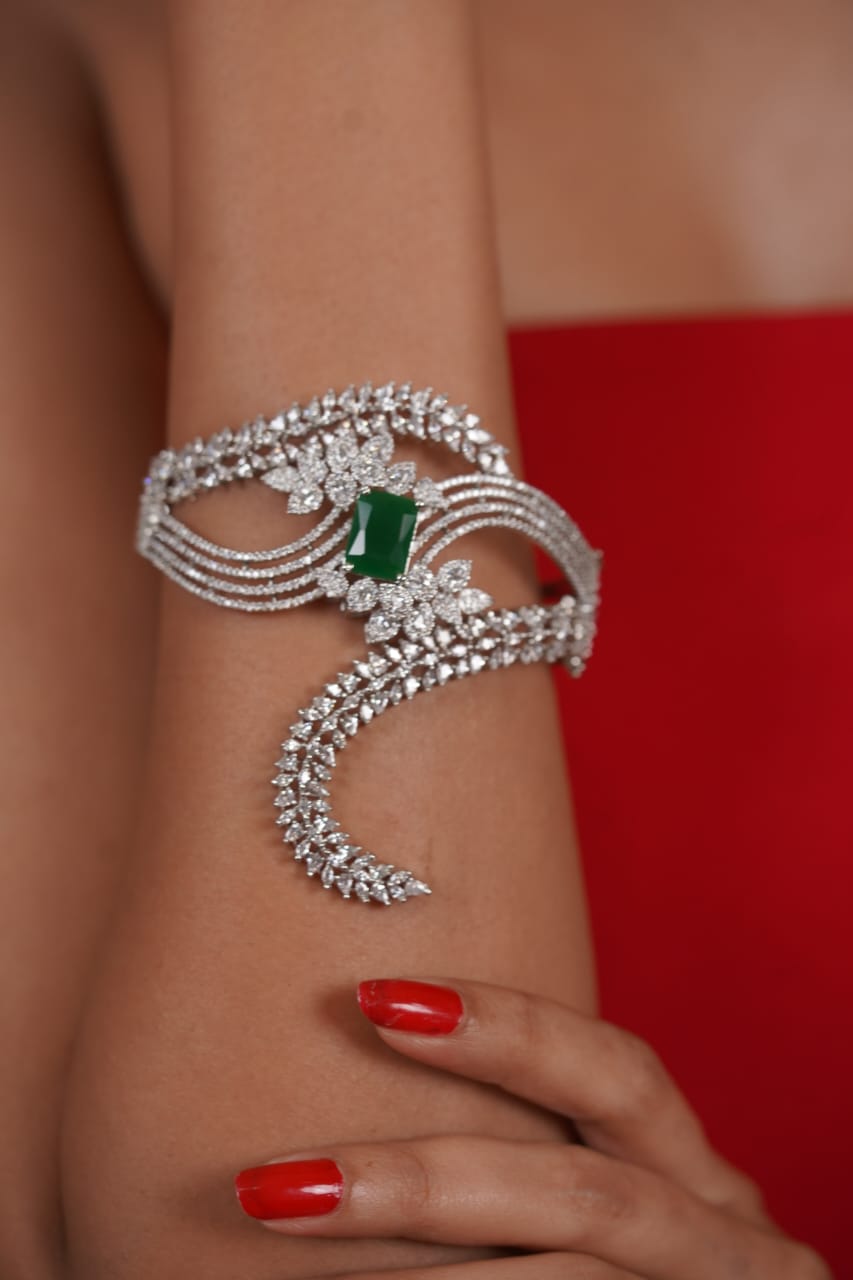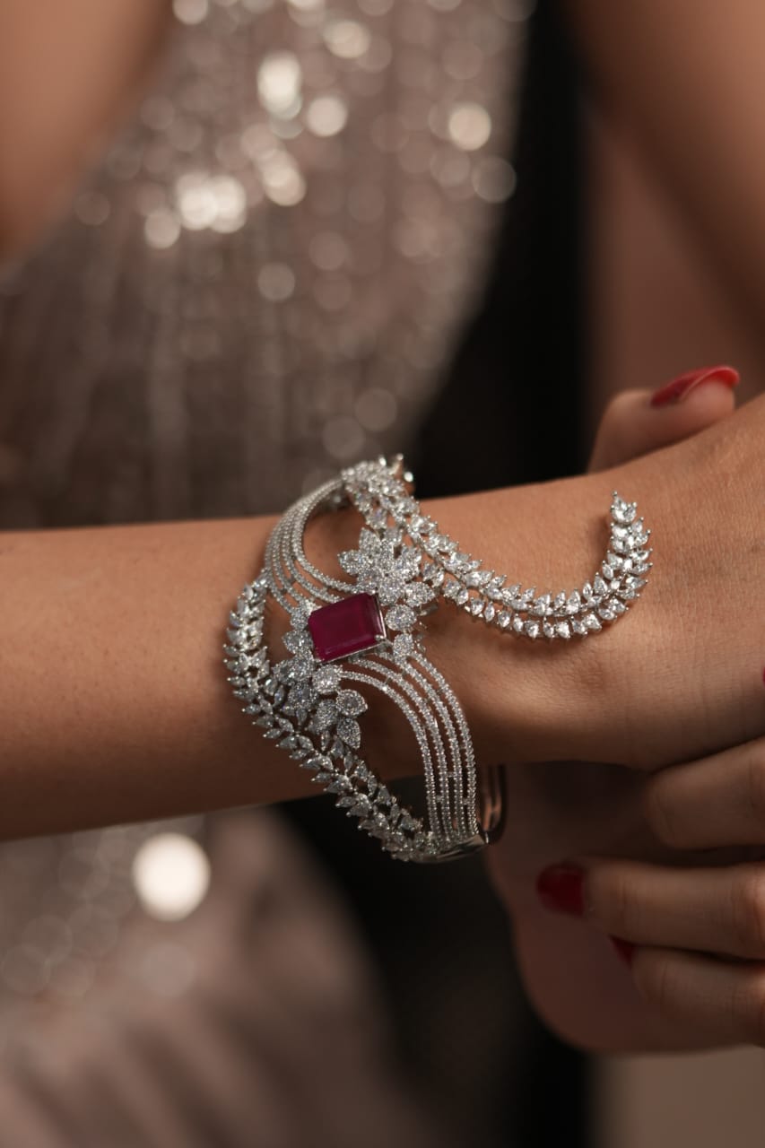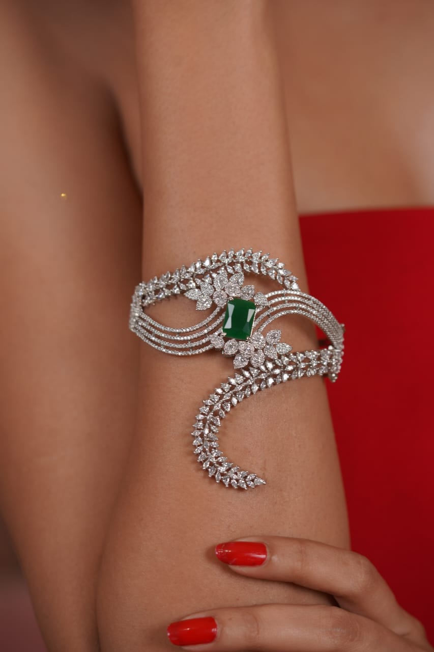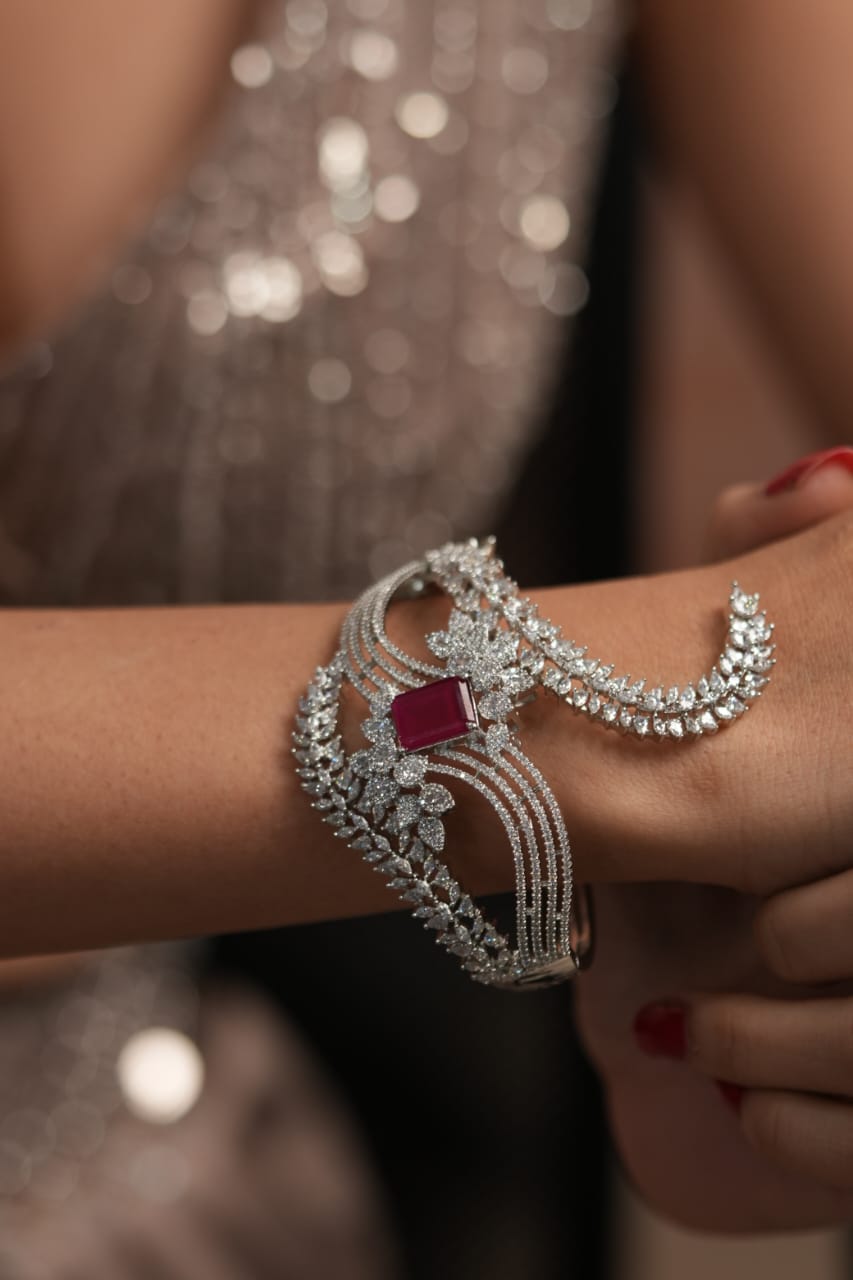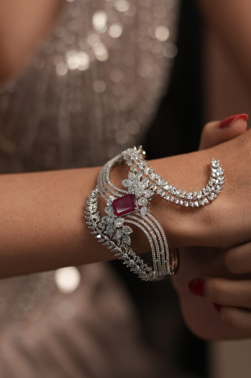 An Arcade oversized dramatic diamond designer bracelet featuring striking ruby or emerald center stones that add a bold pop of colour.