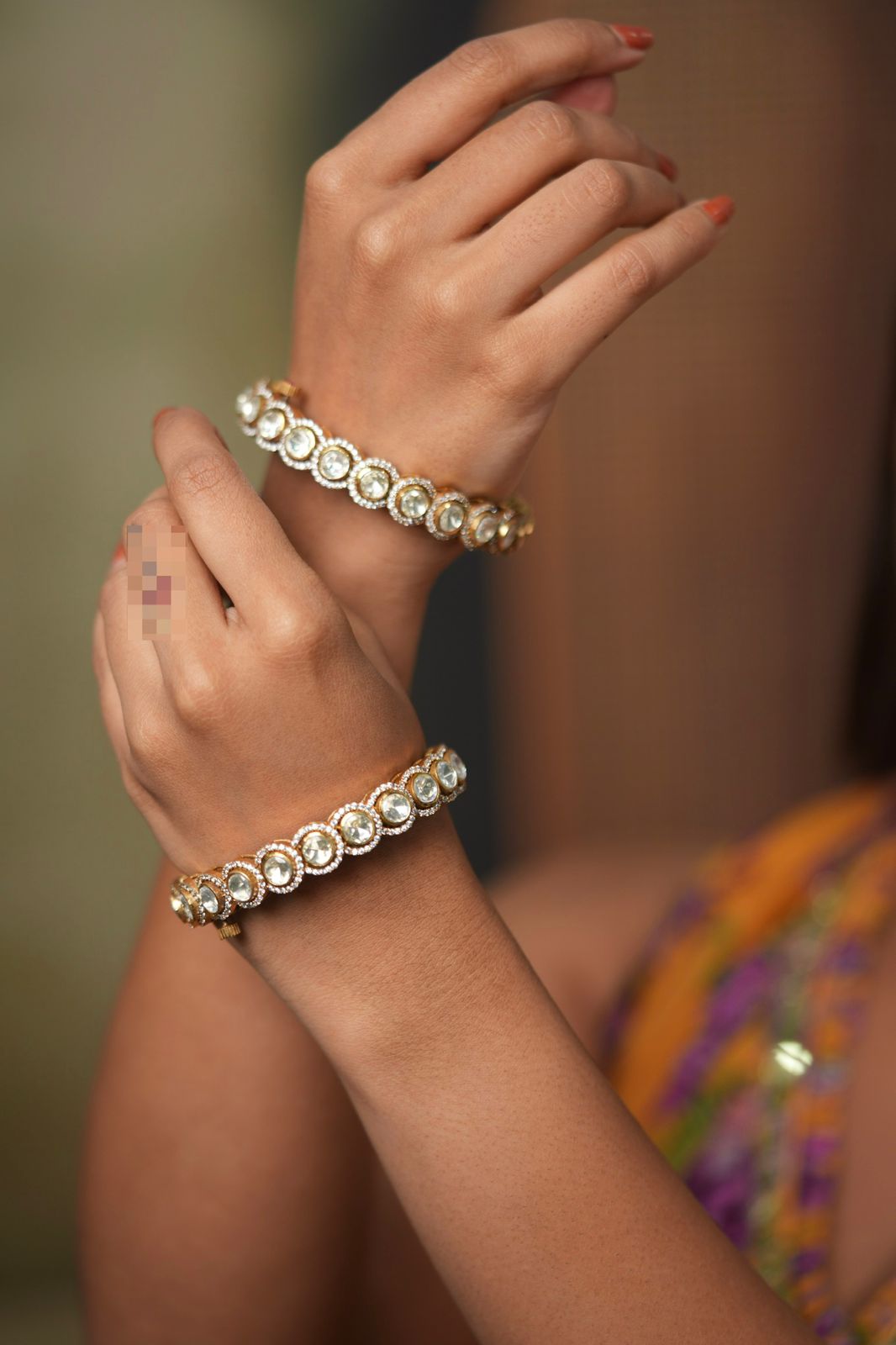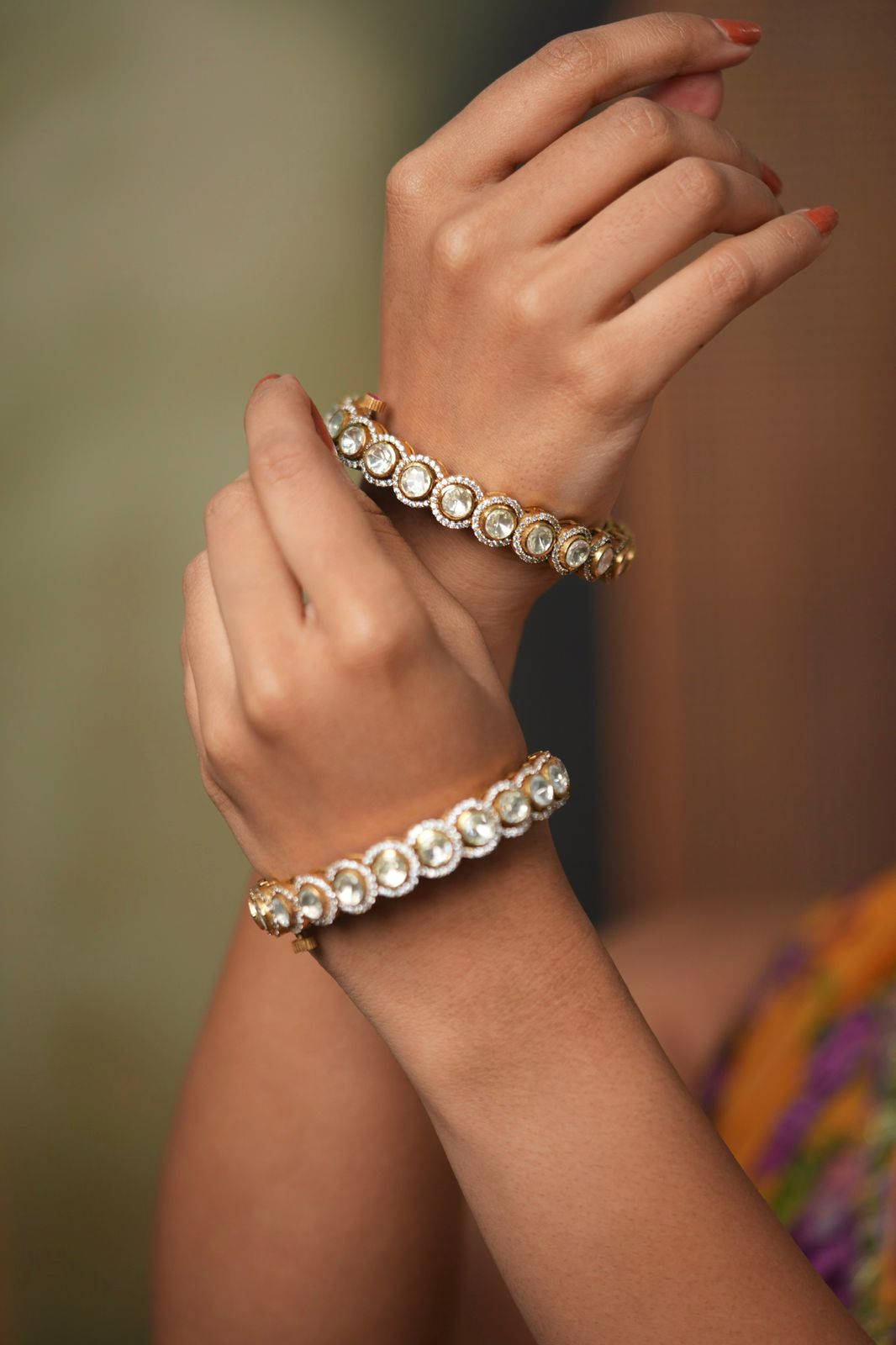A classic Moissanite Polki bangle set featuring round uncut diamonds  that exude timeless elegance. Versatile and refined, it effortlessly complements any outfit, from festive to everyday wear.