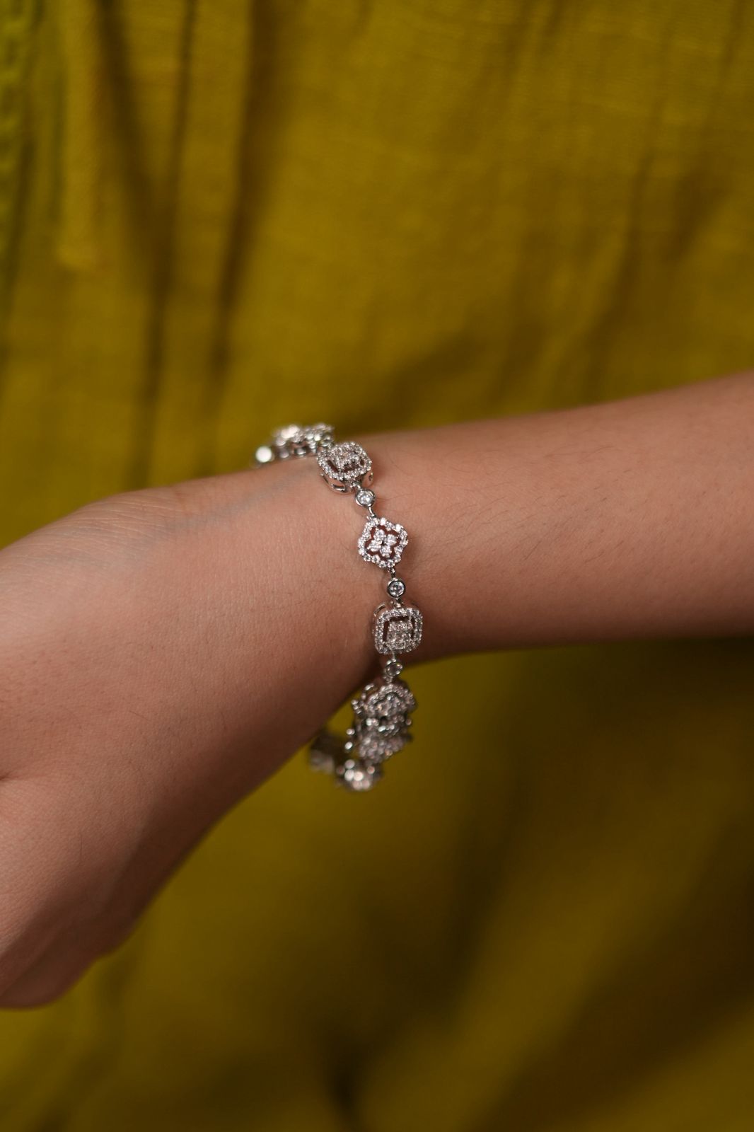 An elegant tennis bracelet featuring a pressure-set emerald-shaped diamond at the center, followed by a seamless flow of clover-shaped pressure settings around the wrist.