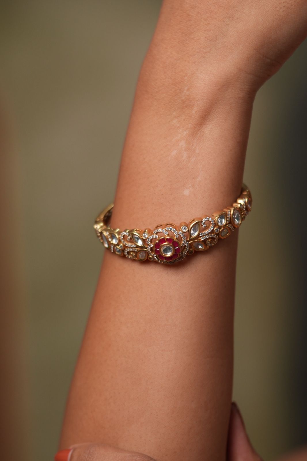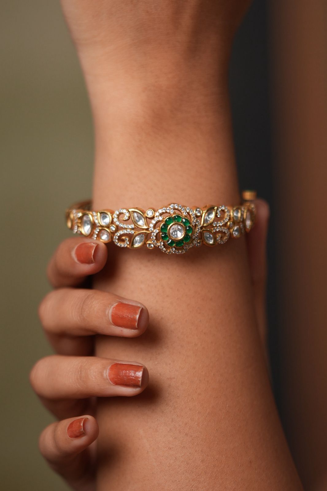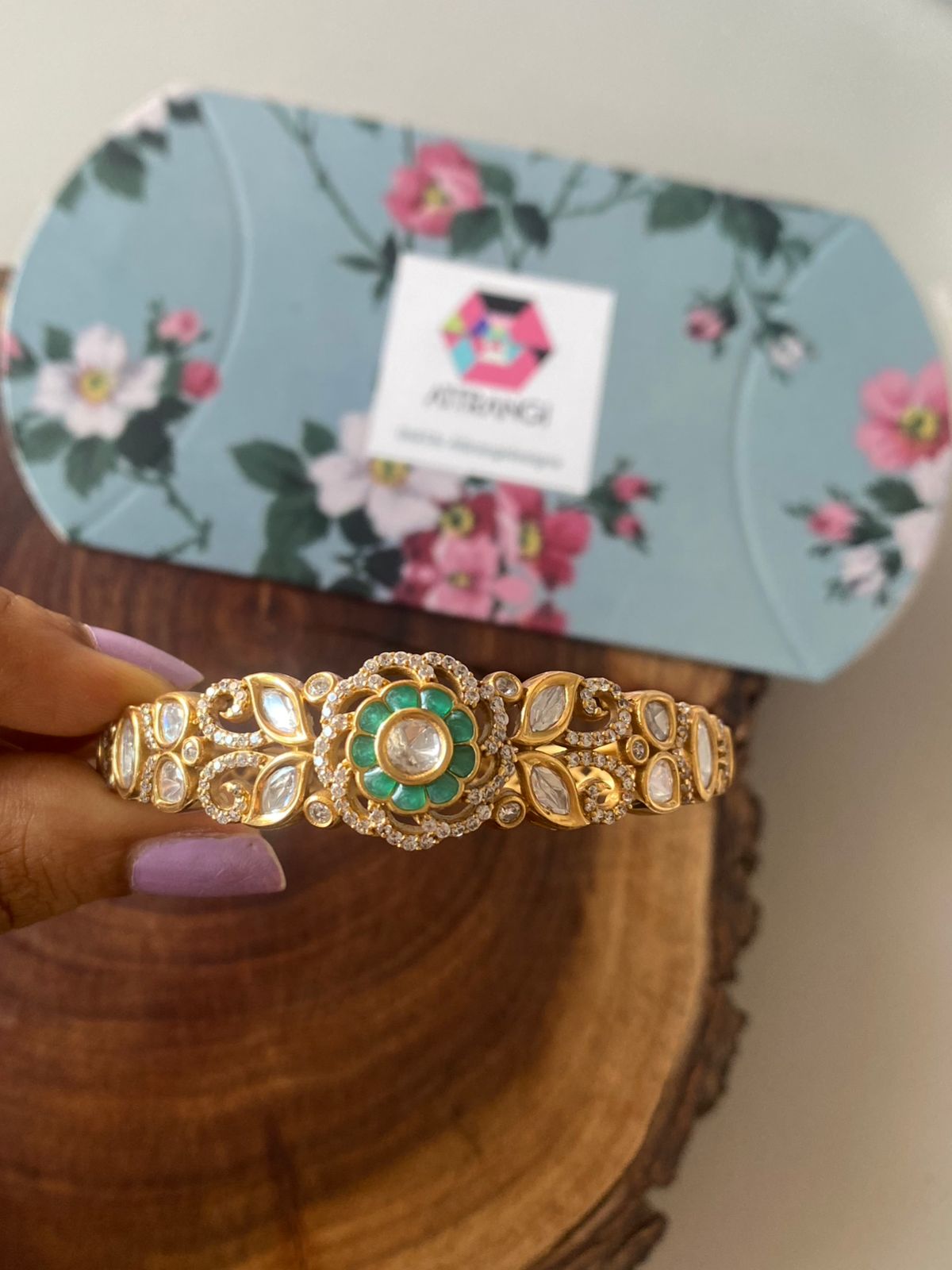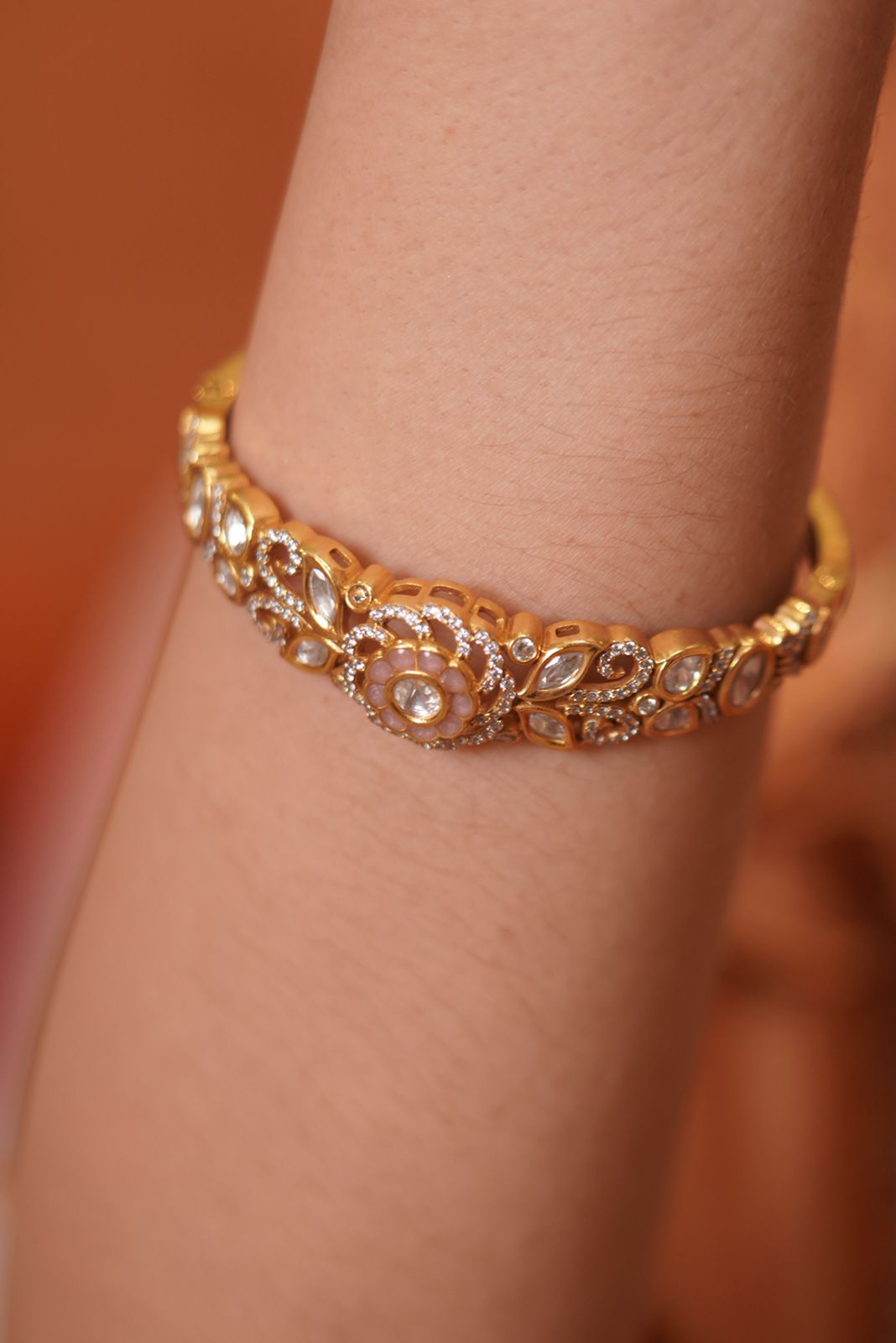 A minimal Polki bracelet featuring a floral motif in colourful epoxy Meenakari, surrounded by delicately set moissanites.