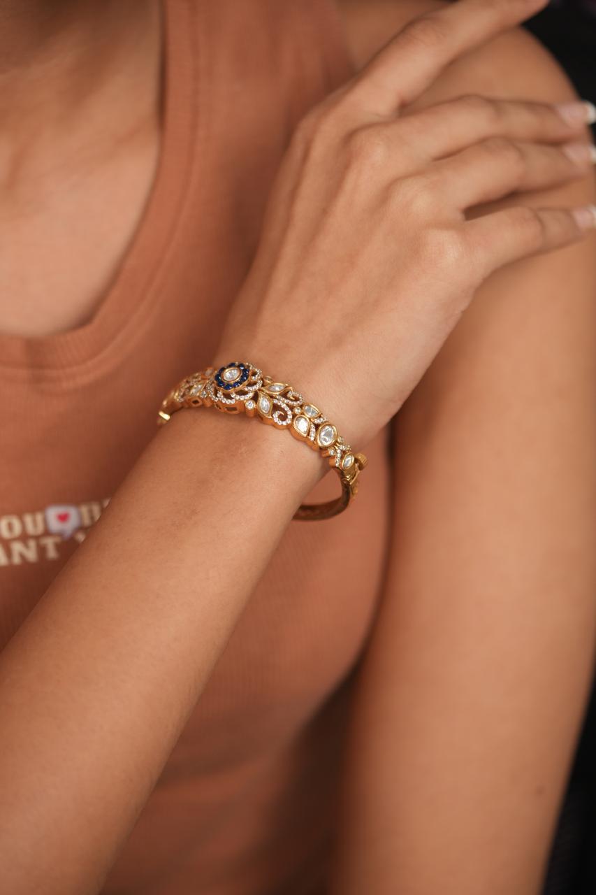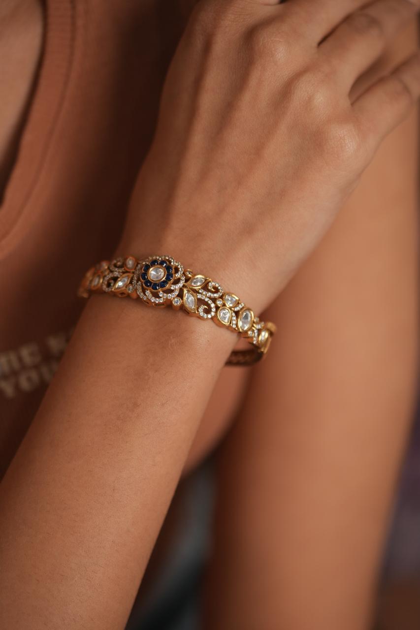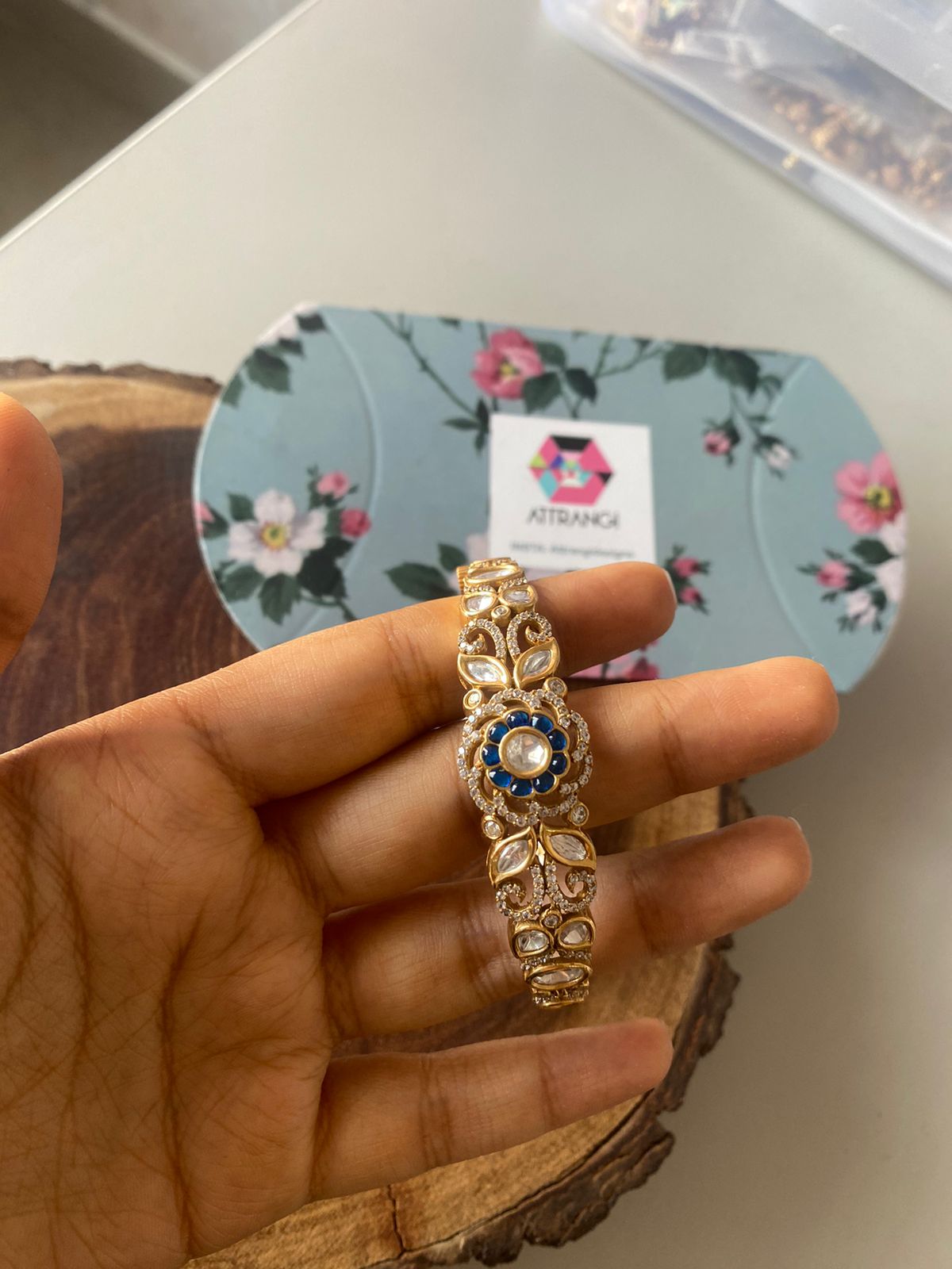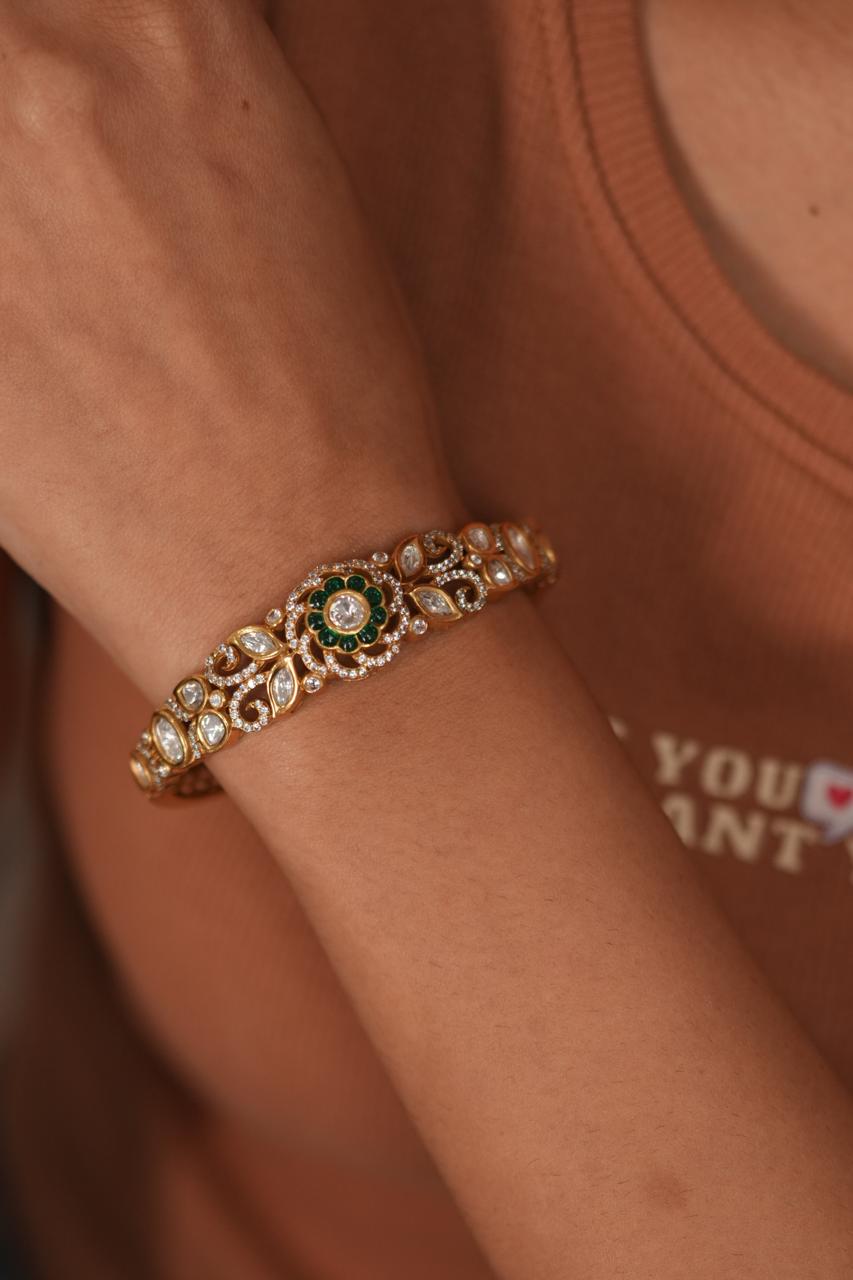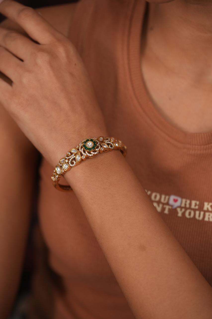 A minimal Polki bracelet featuring a floral motif in colourful epoxy Meenakari, surrounded by delicately set moissanites.