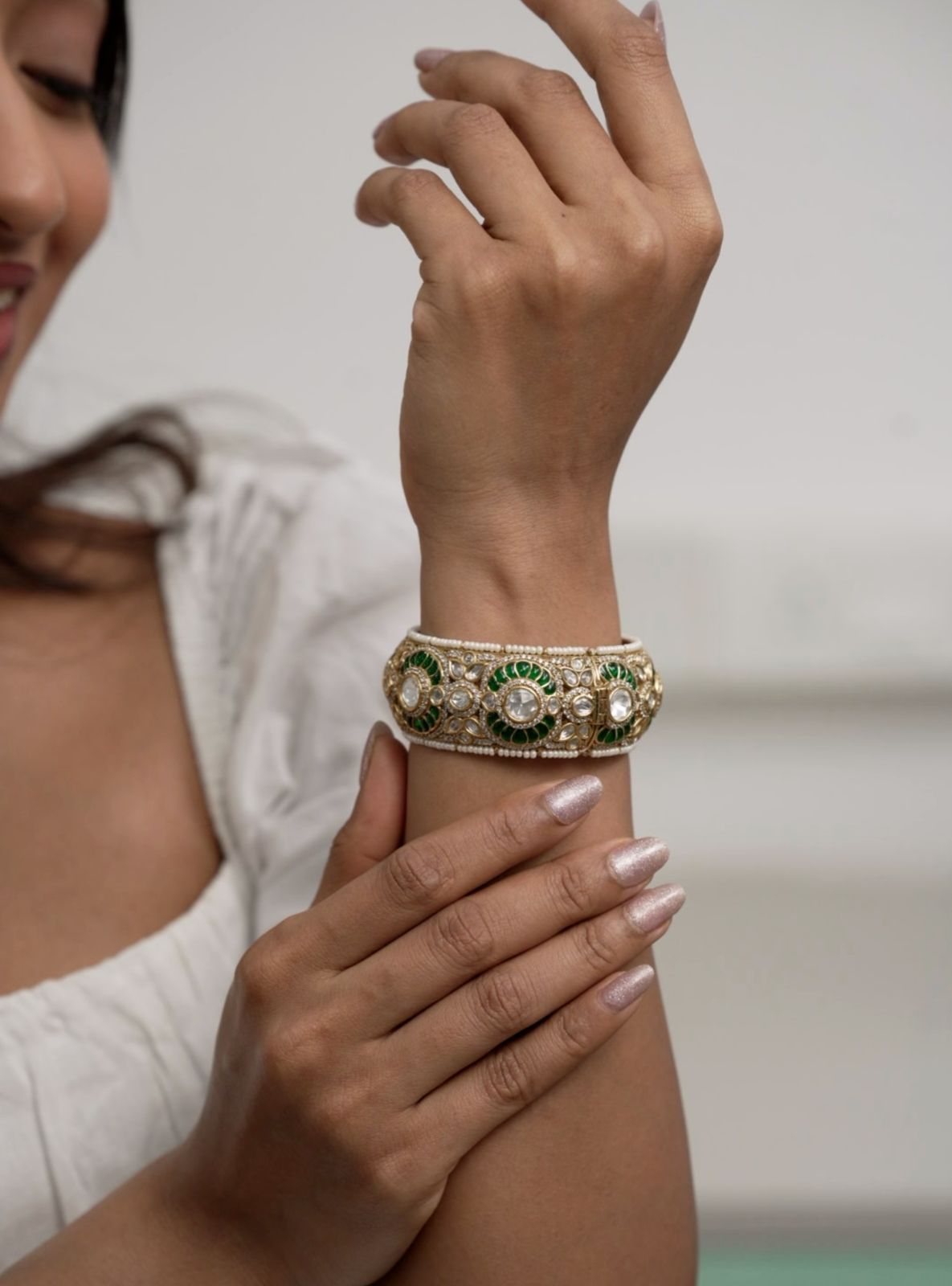 A thick solid kada with uncut diamond moissanites and epoxy Meenakari work that’s openable and gorgeous. Just one Runjun kada and you’ll be sorted for the biggest to the smallest events