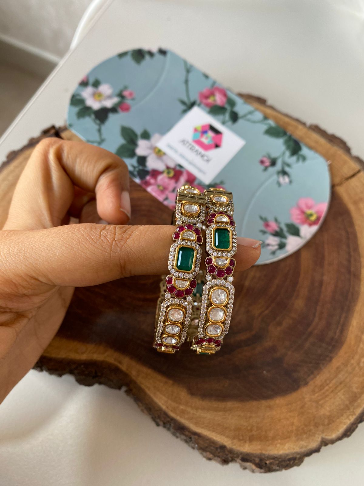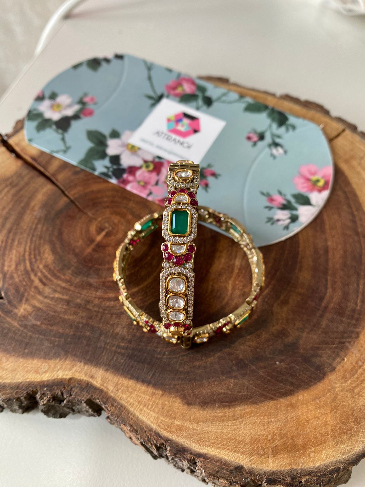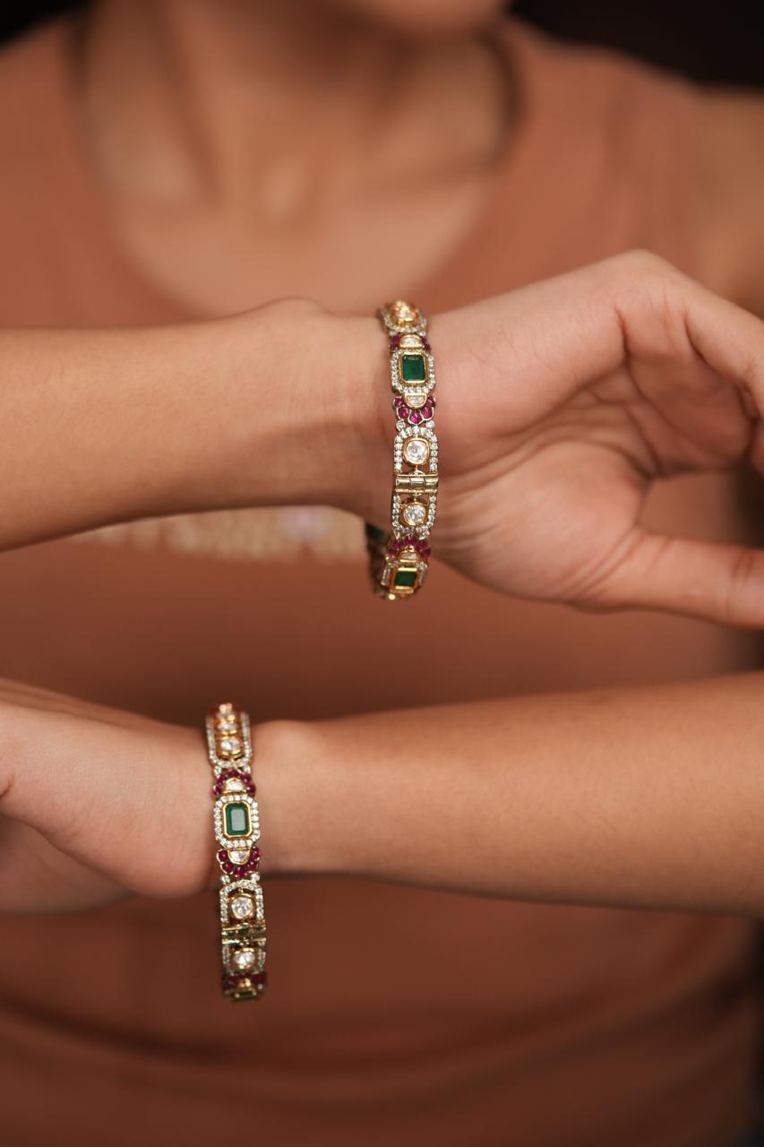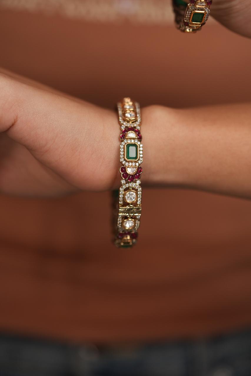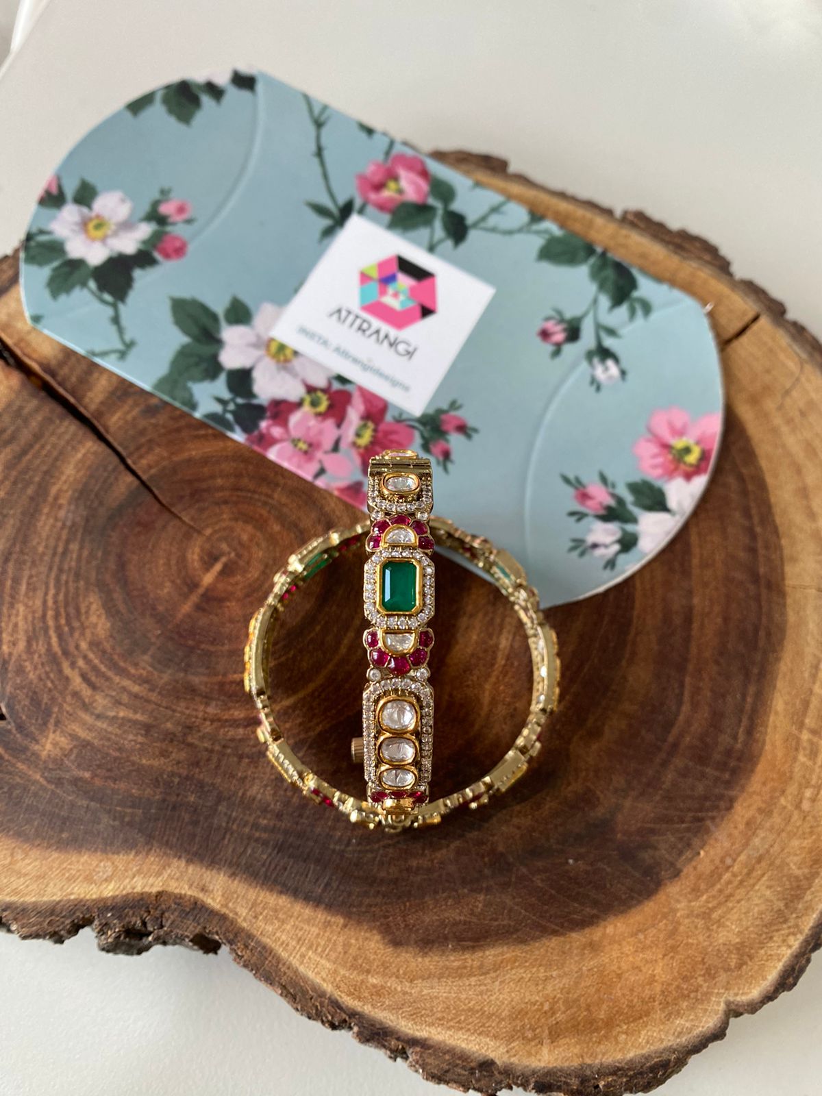 A classic uncut diamond Moissanite bangle set with rubies emeralds and polkis that outshine. The perfect blend of rubies and emeralds makes this bangle not only very easy to match but also super wearable.