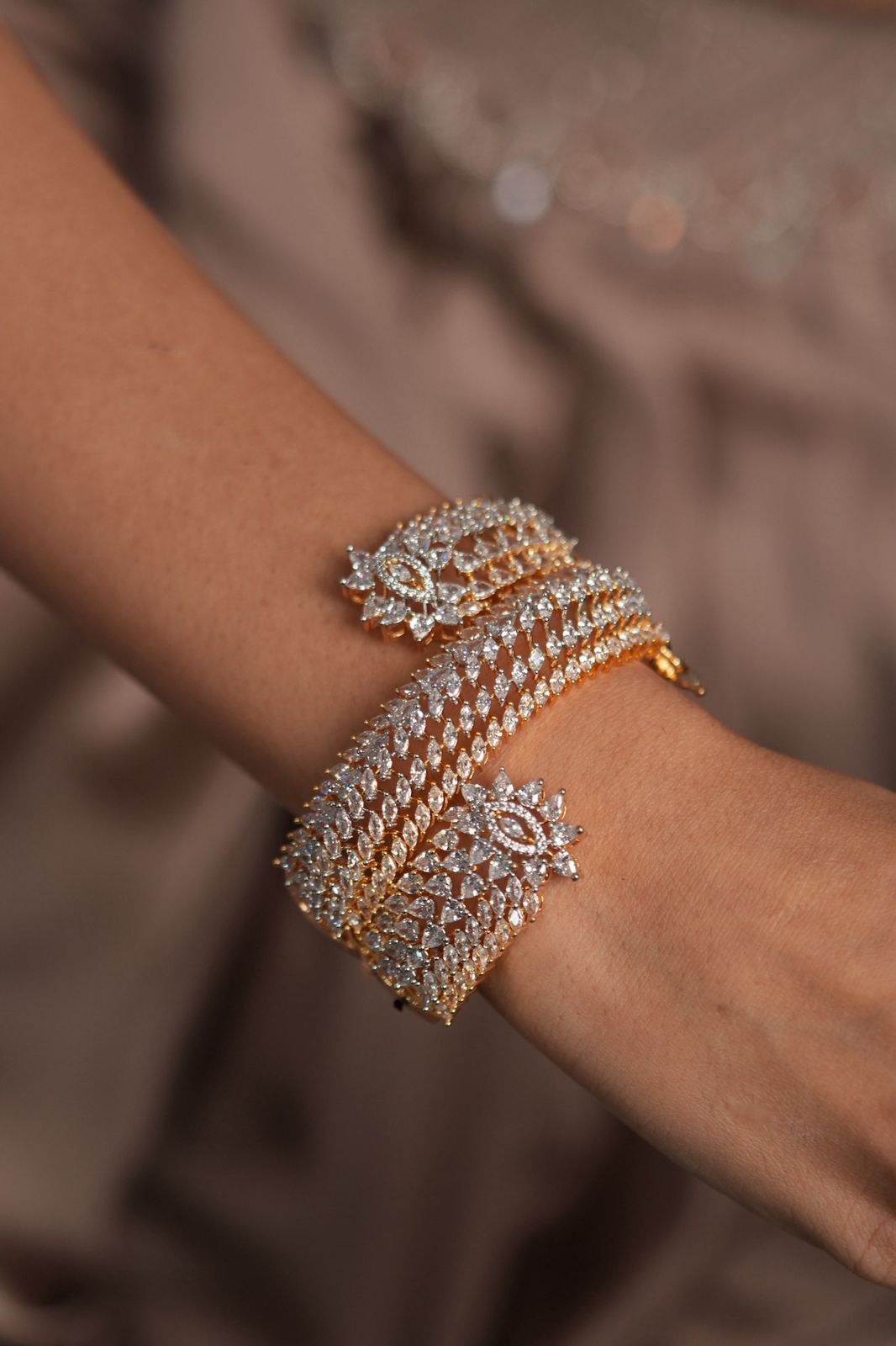 A gorgeous 3 leveled wrap around gold bracelet that looks grand and glamorous. Perfect for sangeet and cocktail nights, or simply to make heads turn
