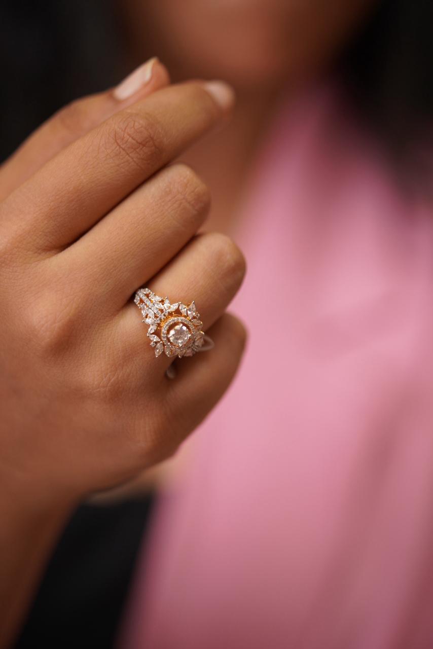 A small diamond solitaire surrounded by a jacket of marquise diamond band that expands through the ring finger. A daily wear ring, that makes a statement