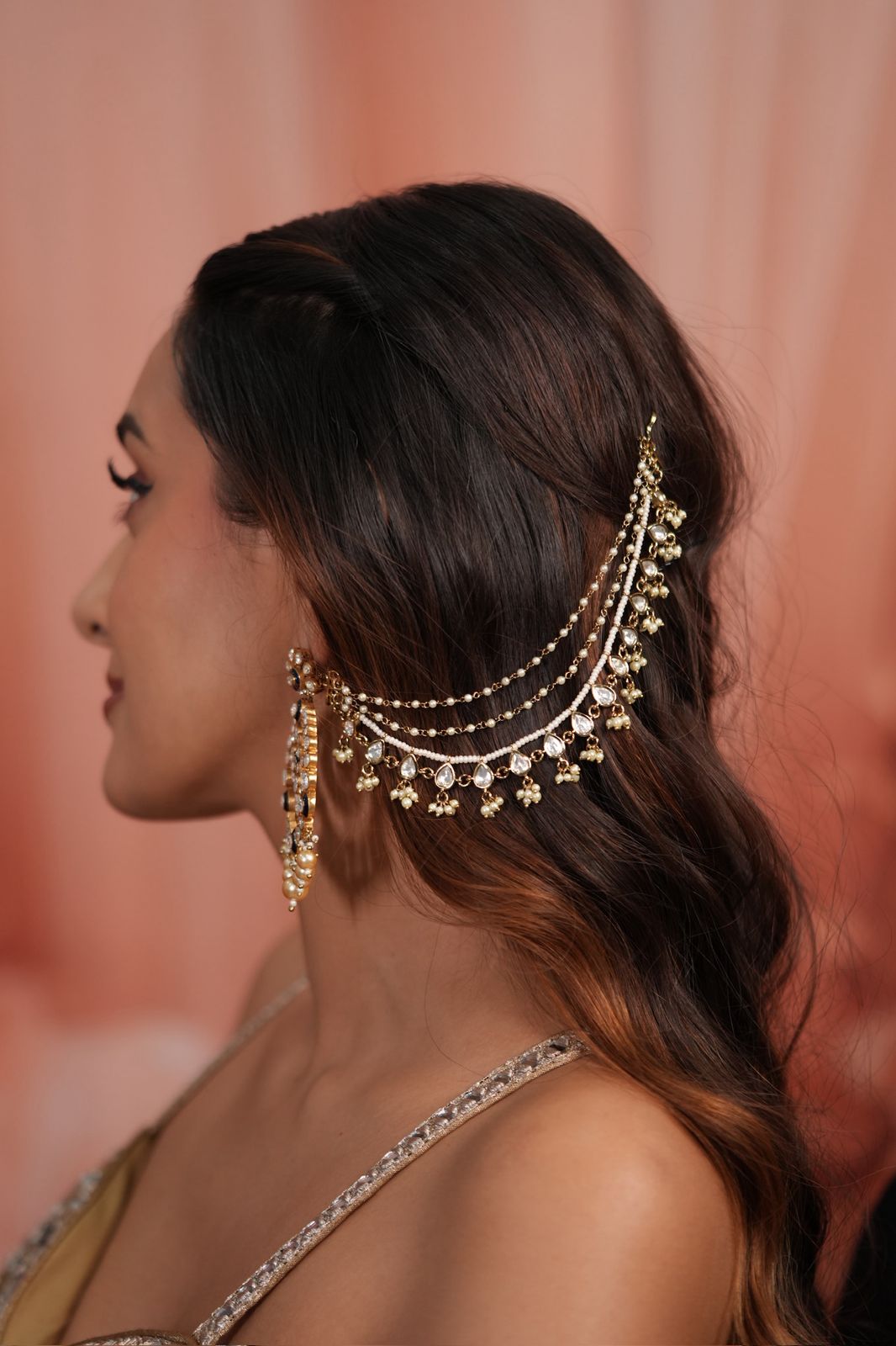 A three-layer uncut diamond hair chain has two layers of thin pearl chain, with the third layer adorned with a dense sequence of pearls and polki droppings, making it perfect for slaying your Indian outfit!