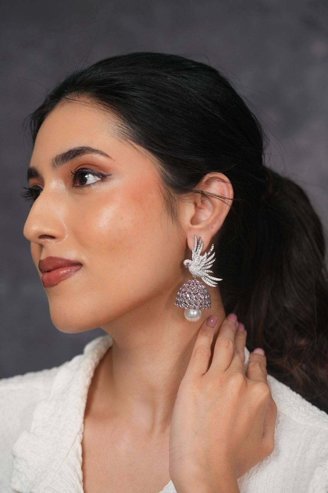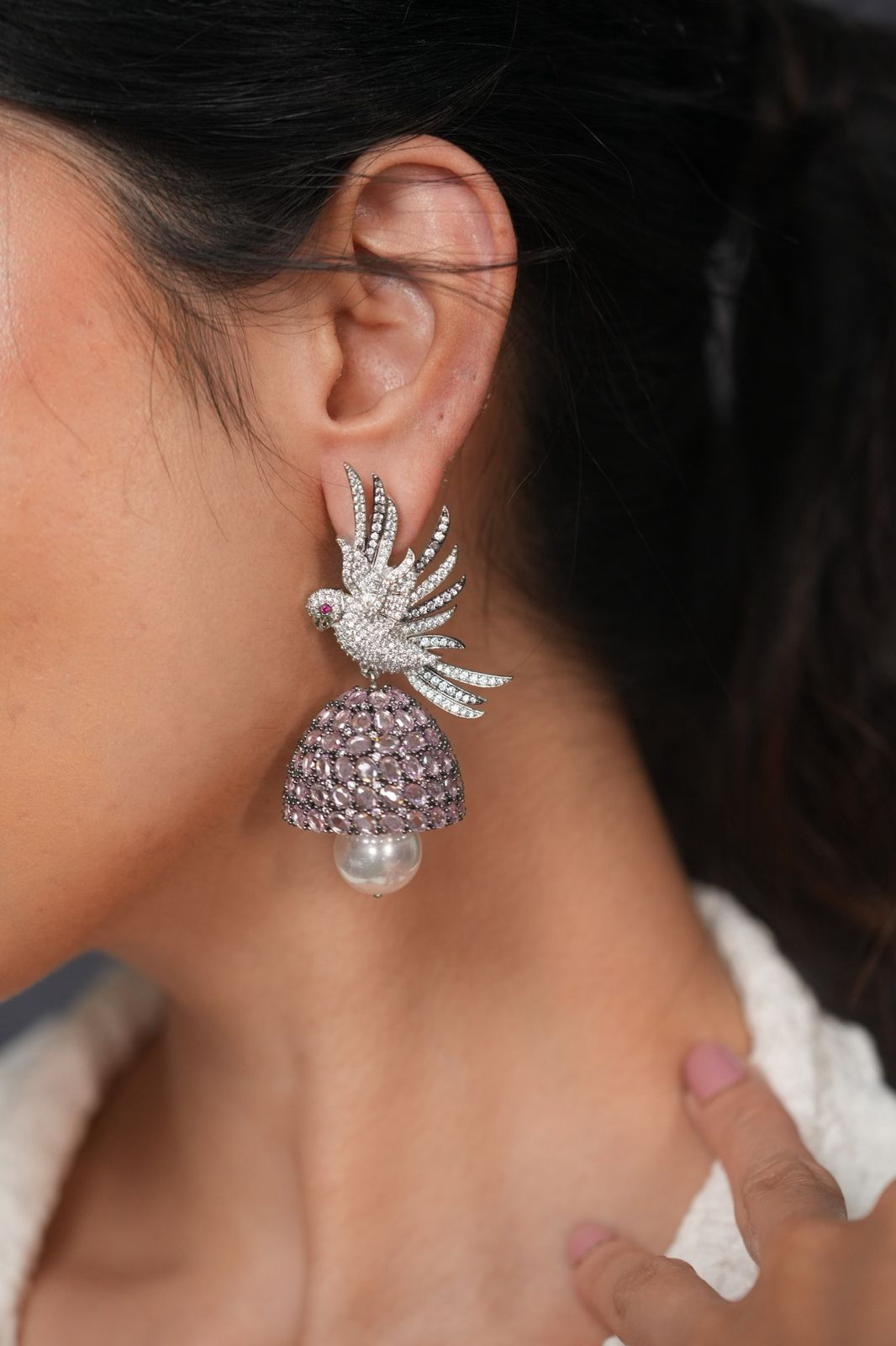 An offbeat diamond earring with an emerald jhumki in pave setting with an oversized pearl drop, the unique design is not even the best part, the most striking feature of the earring is the flying diamond studded bird on top. So tie up your hair and let our earrings do the talking.