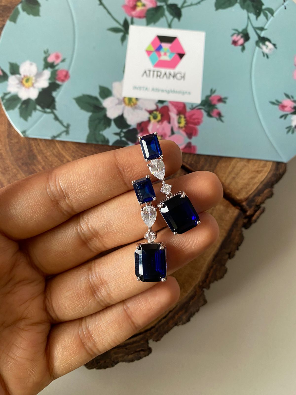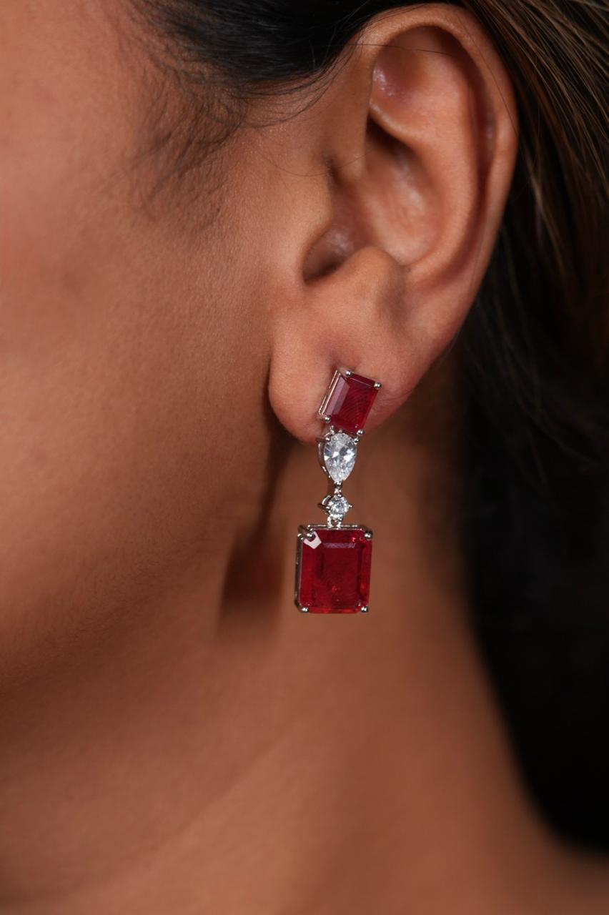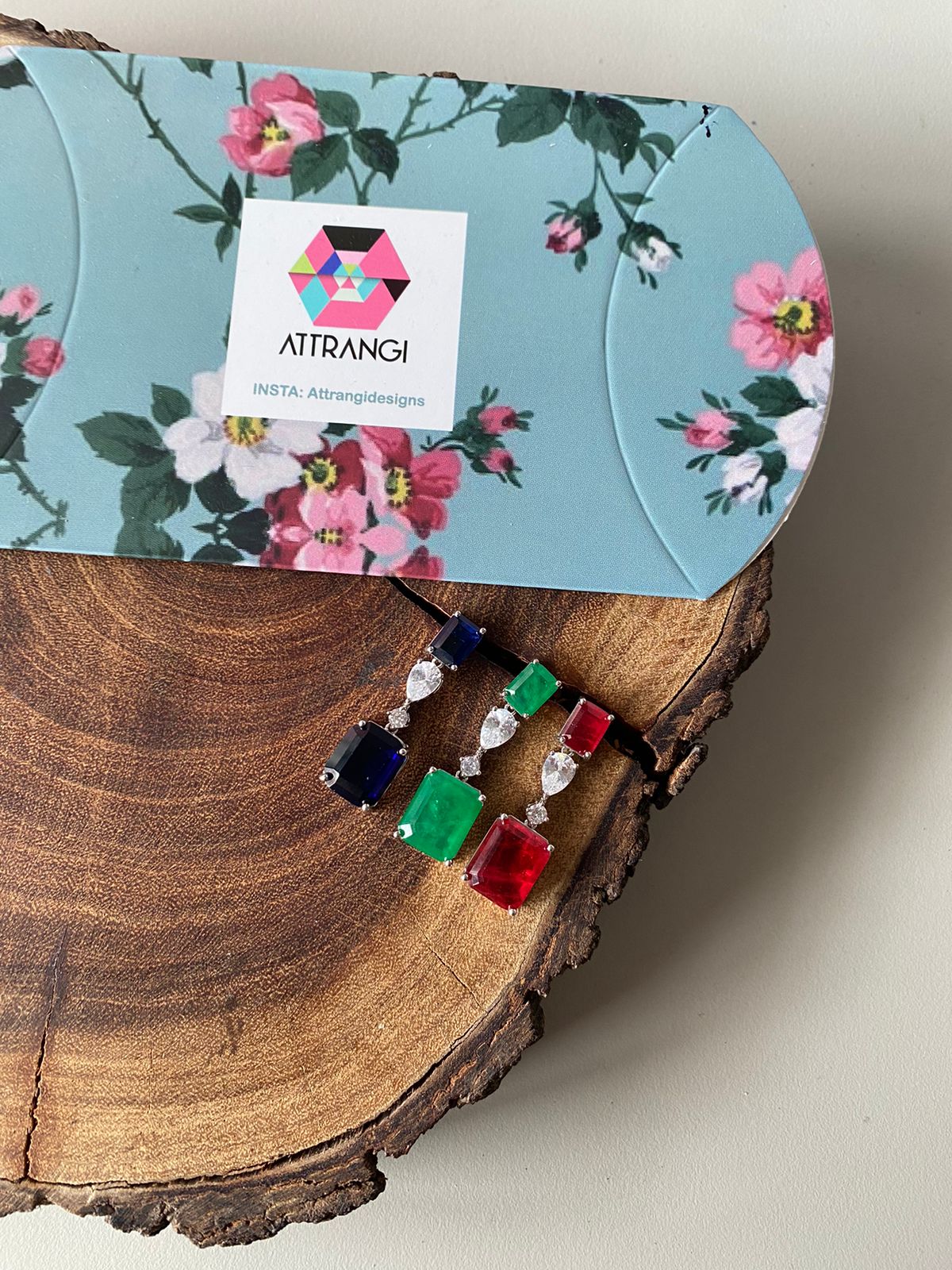 Diamond earrings with iconic coloured stones on top and below put together by pear and round shaped diamond soltiaire in between.