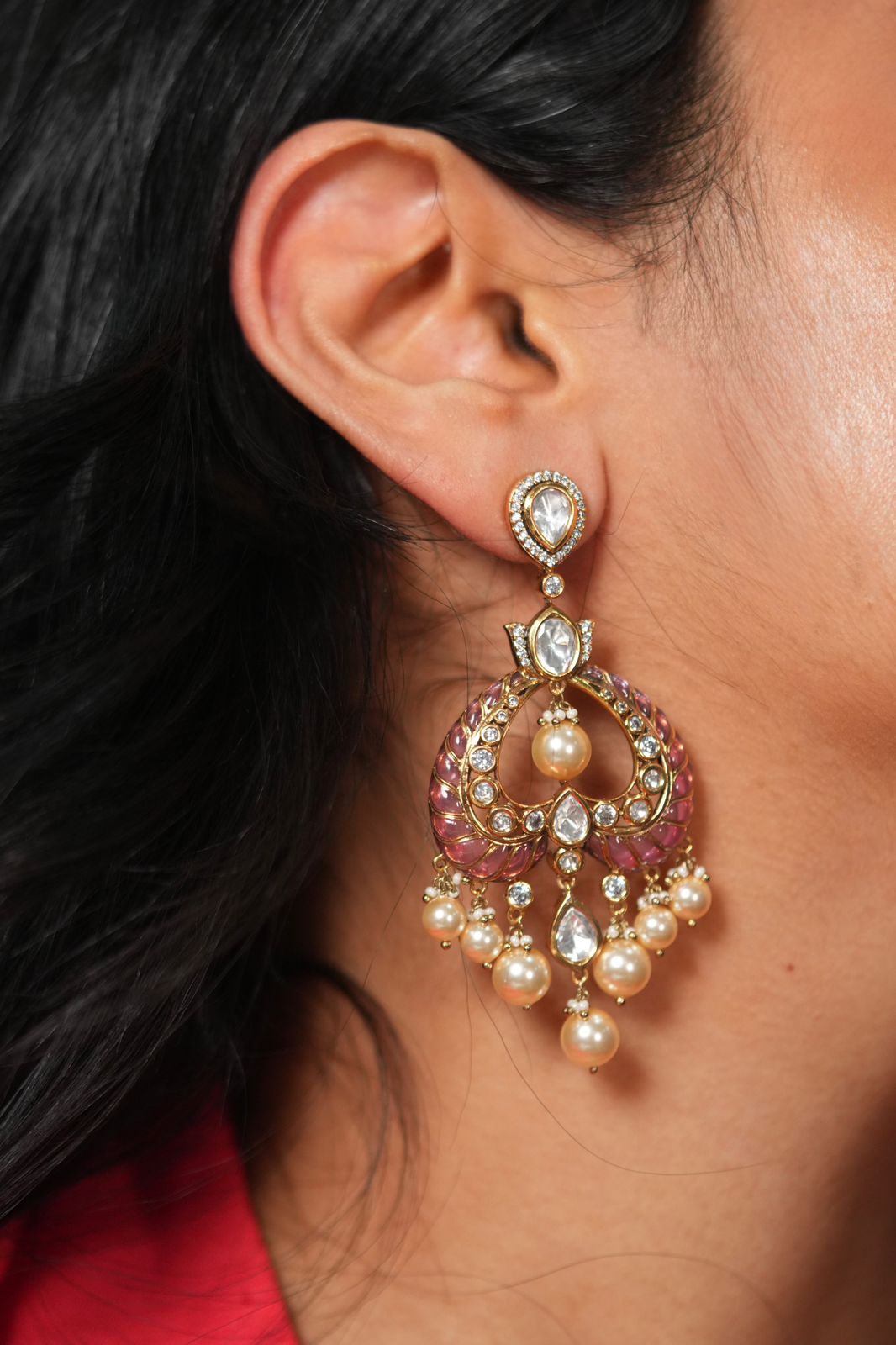 A regal Moissanite Polki Chandbali adorned with vibrant handcrafted meenakari detailing, reflecting timeless Indian artistry.
