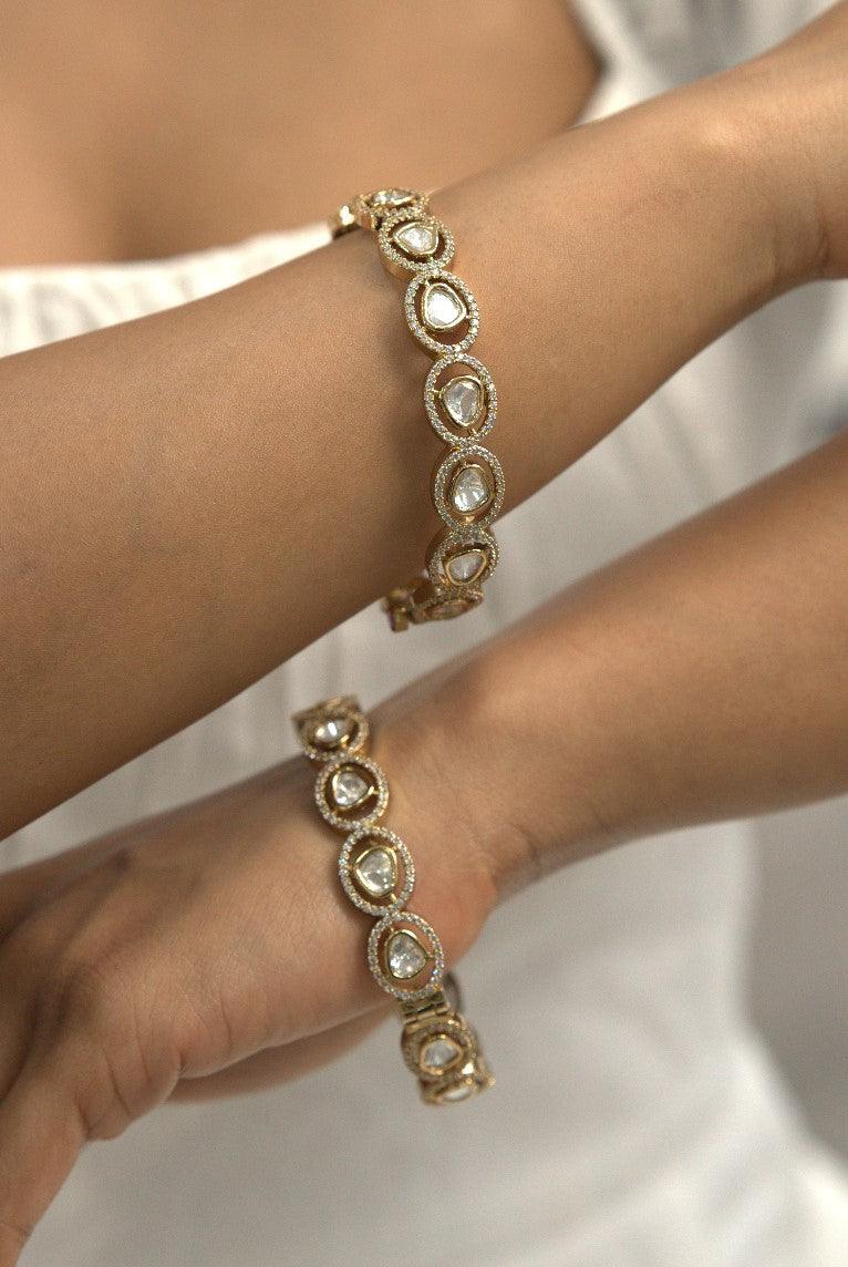 Timeless heritage reimagined in these exquisite Adbhut bangles, where uncut diamond polki and brilliant moissanite stones shimmer together in antique gold settings. Each meticulously crafted piece marries royal influences with contemporary elegance, creating an heirloom-worthy adornment that captures light's poetry at every angle.