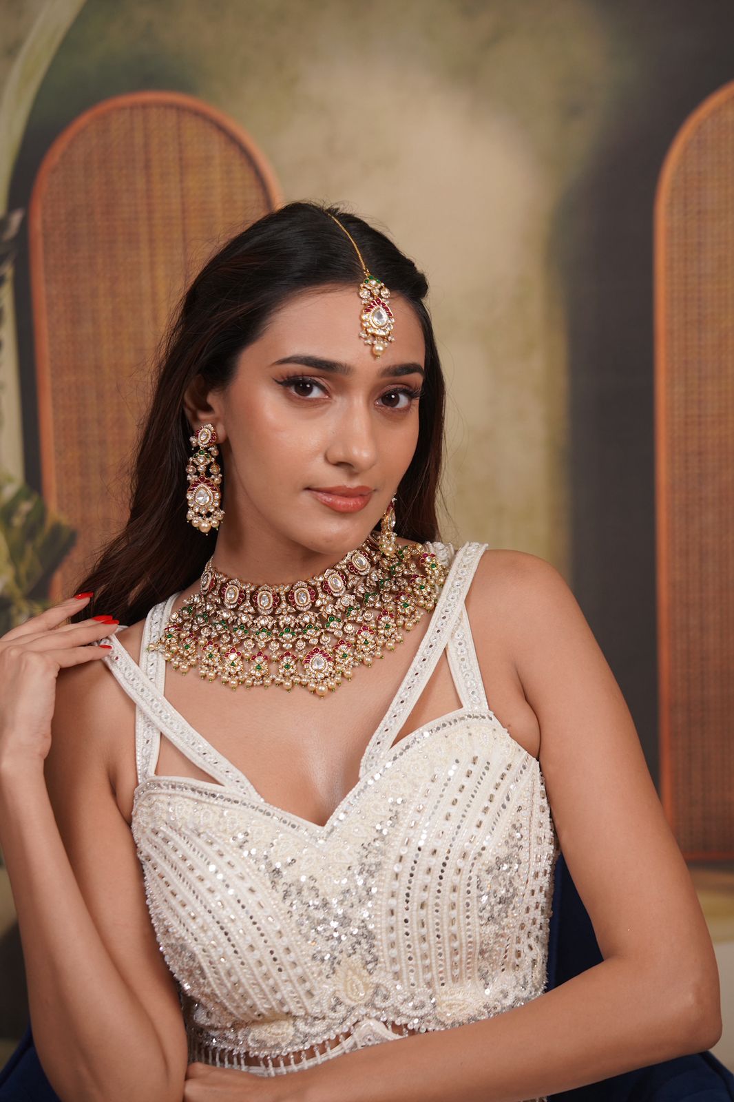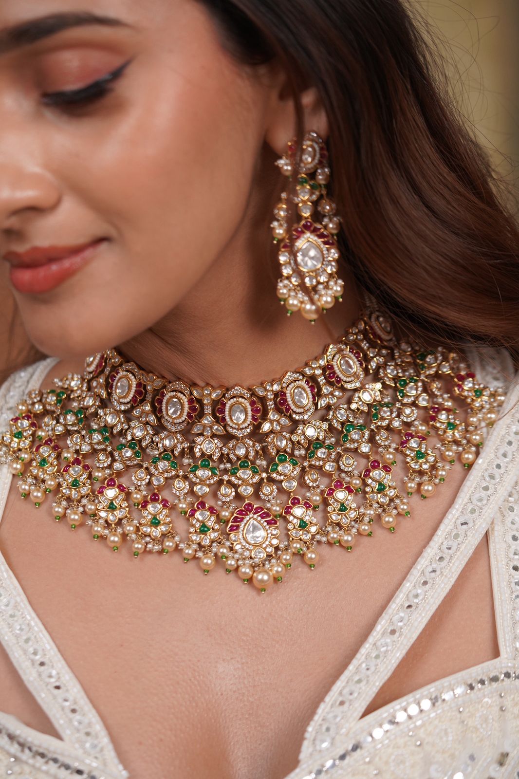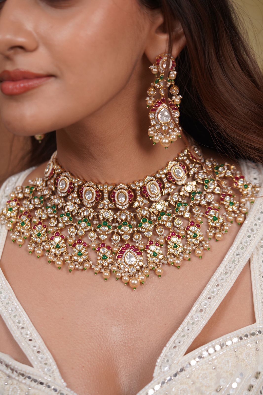 A bridal heavy Polki choker set with fused polkis and uncut diamonds along with emerald Meenakari work and off white pearls that give the look you can only dream of.