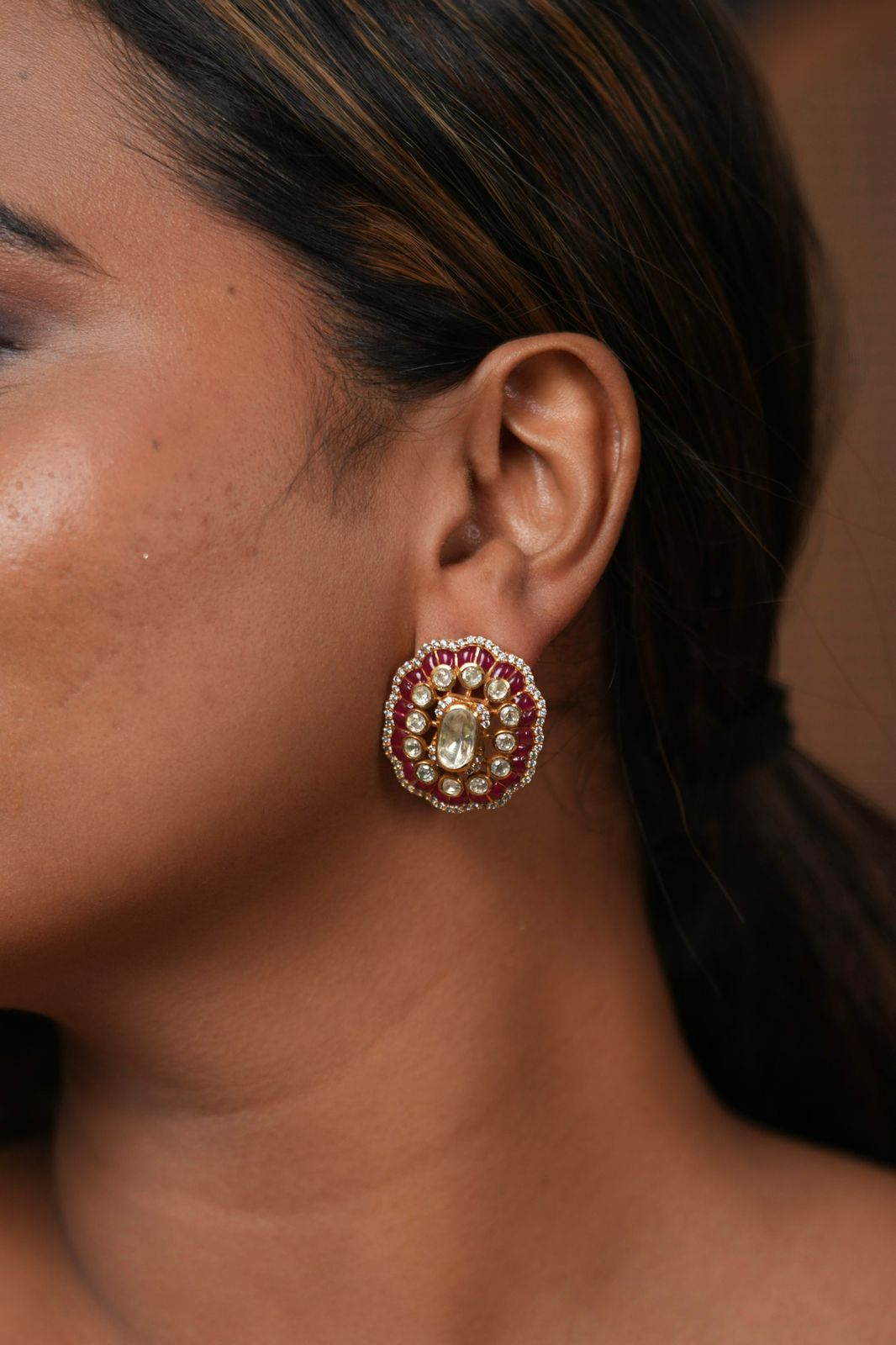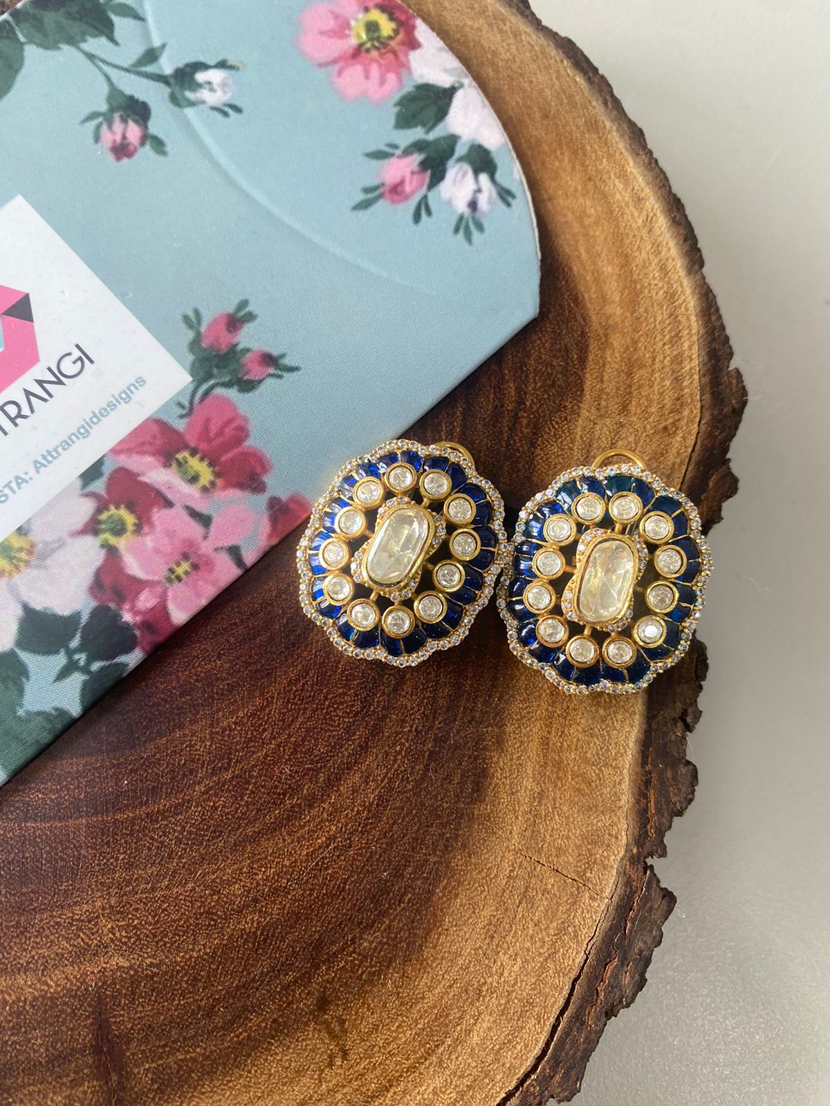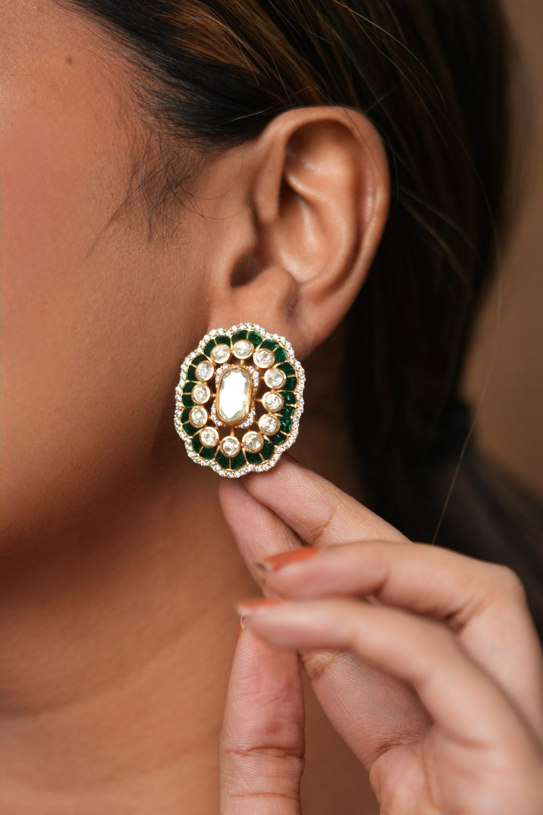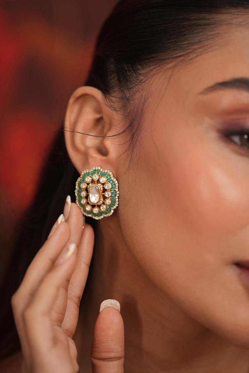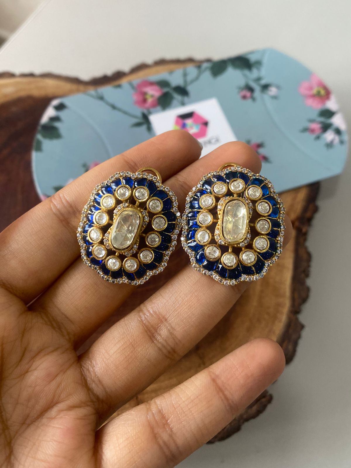 Moissanite studs that sparkle like real polkis and fine uncut diamonds. It comes with an epoxy framing on the edges with a row of moissanites around. This spectaculars design is meant for your Indo western, Indian or even western looks.