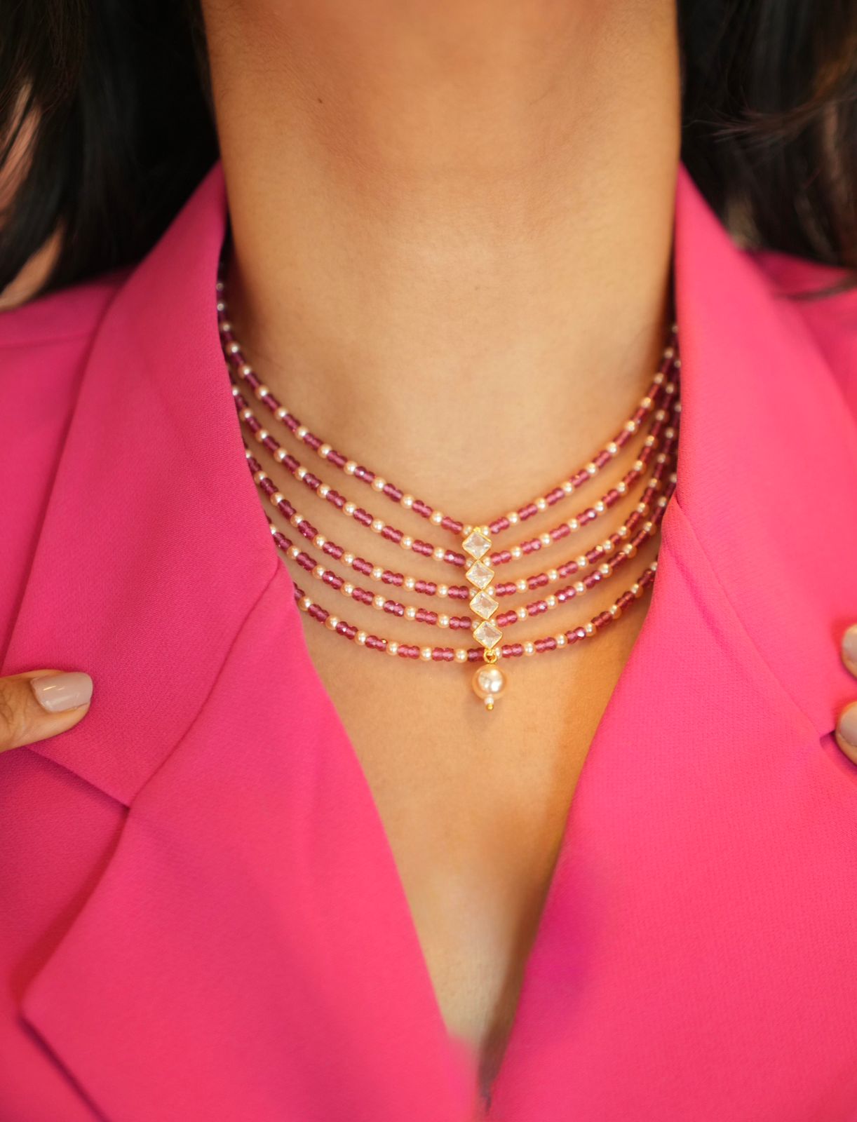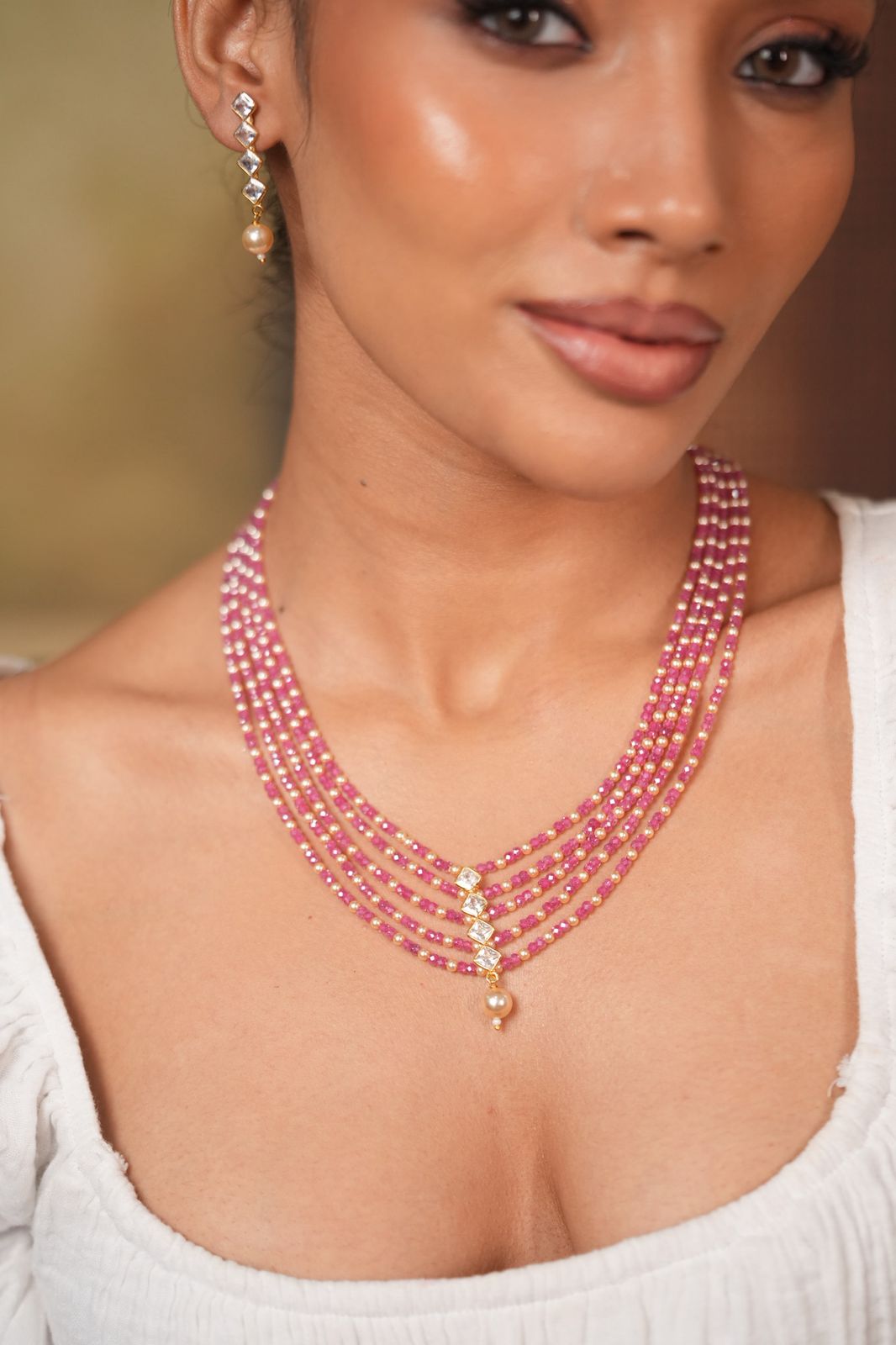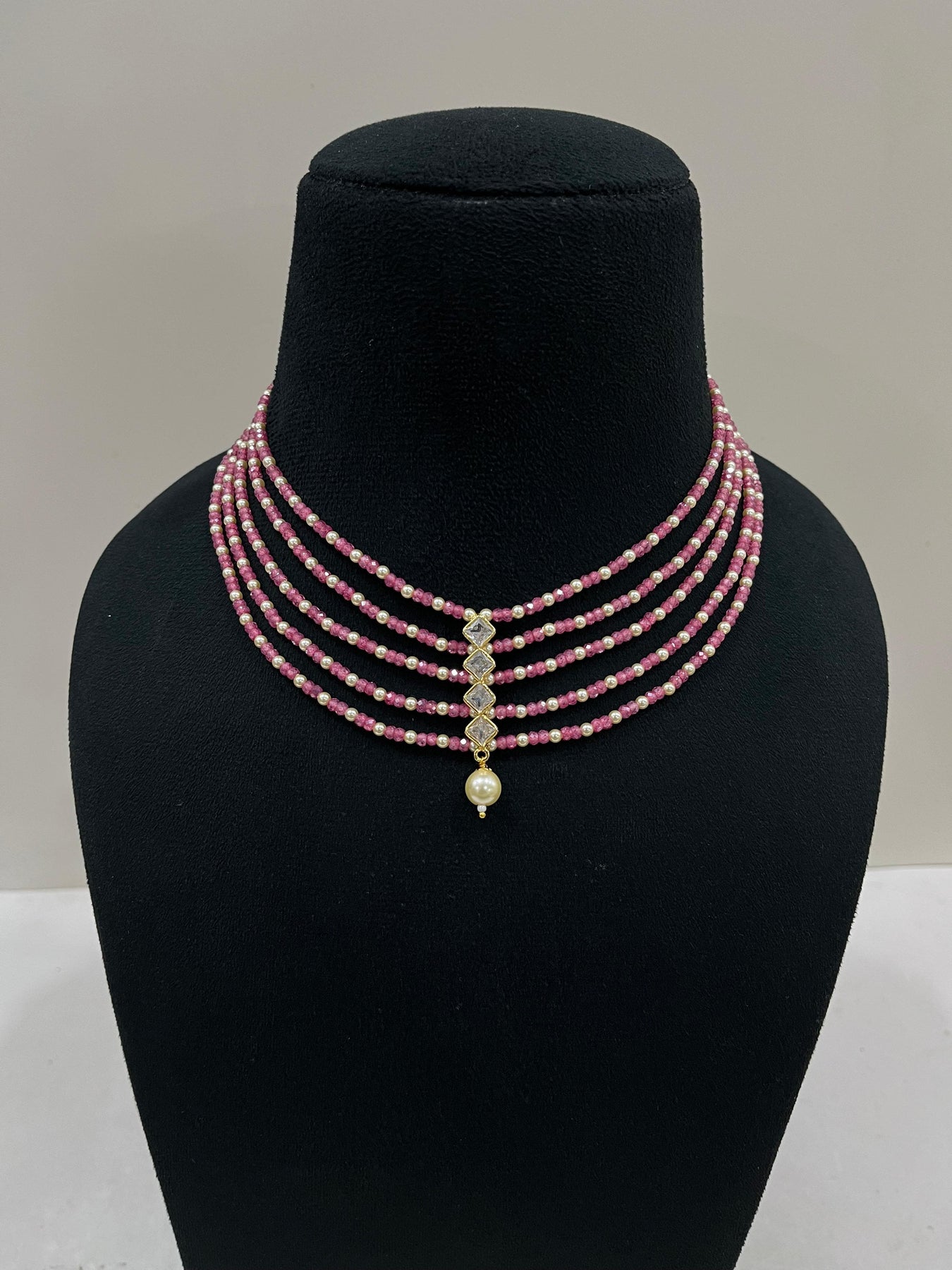 A 5 layer empress set with  Moissanite single Line in the center and pearl drop. Gorgeous effortless and wearable, this one is a heartthrob.