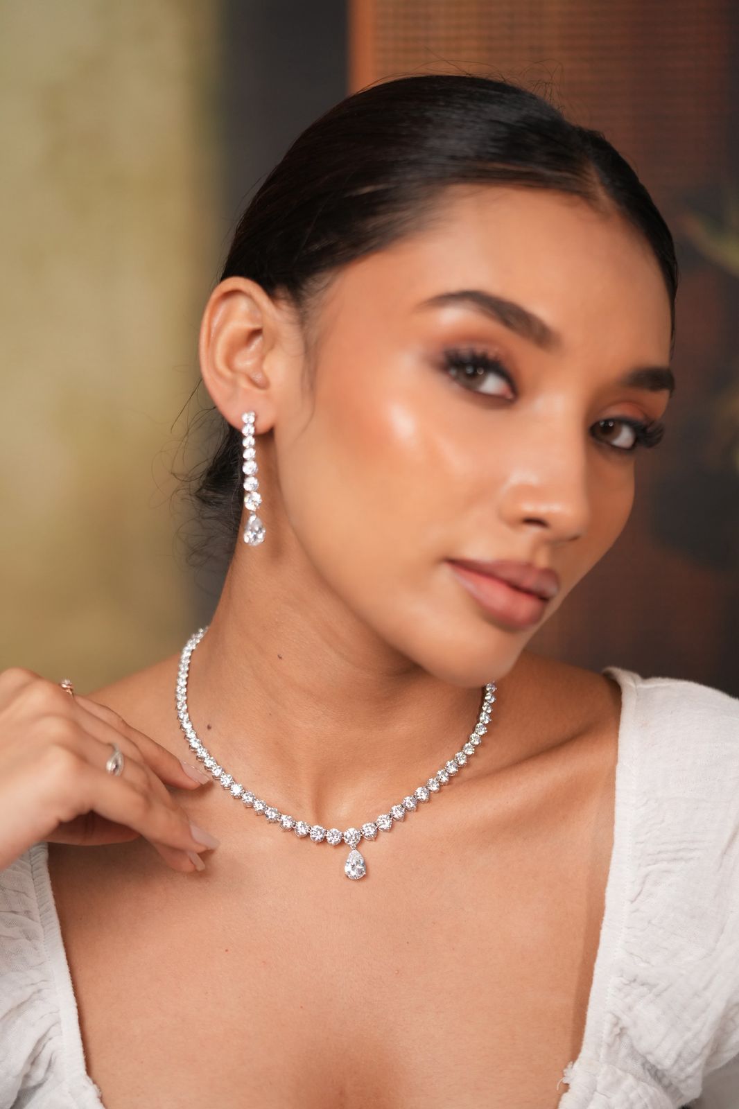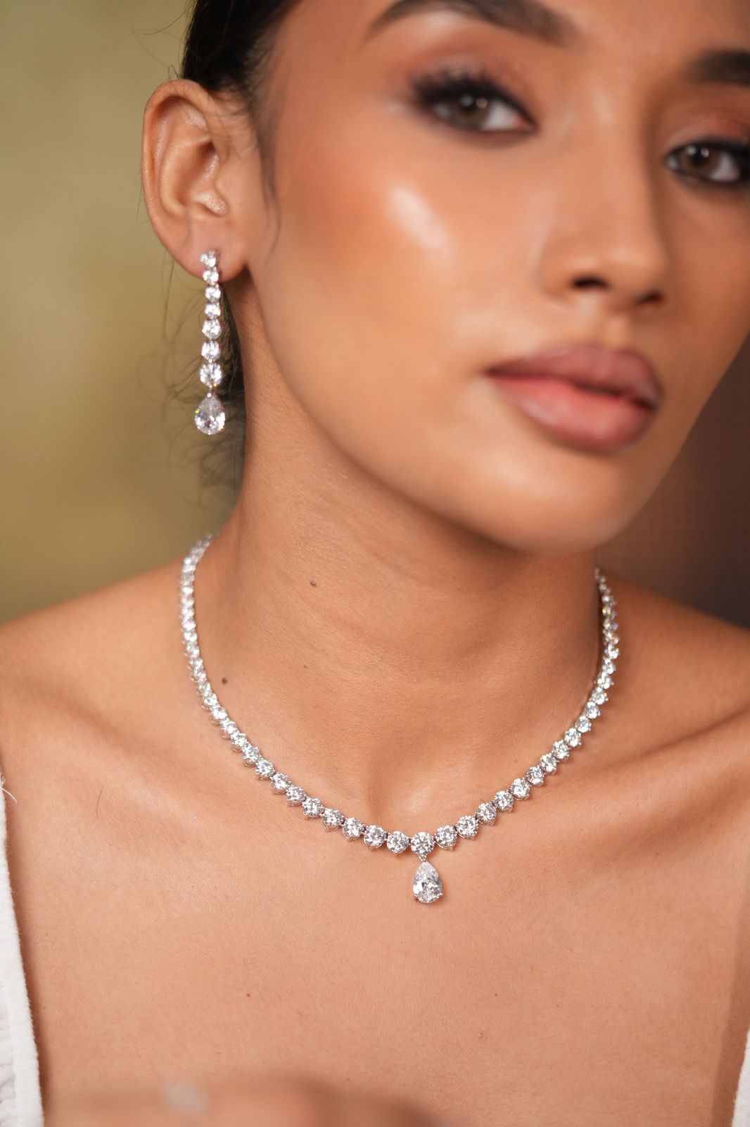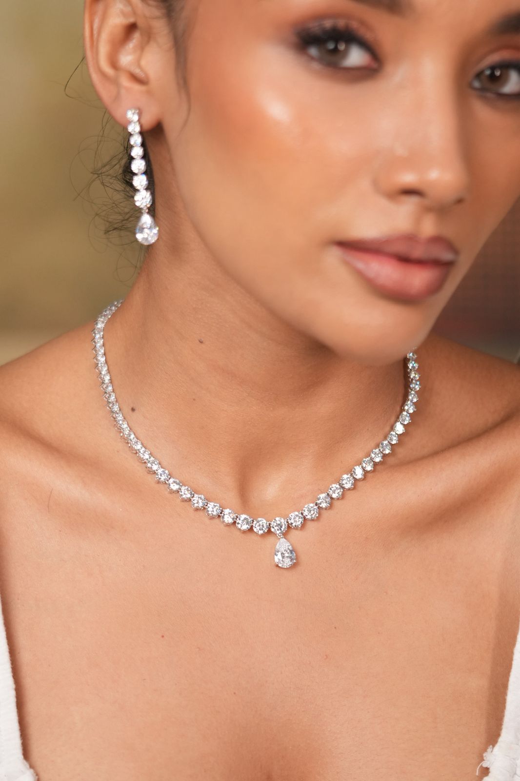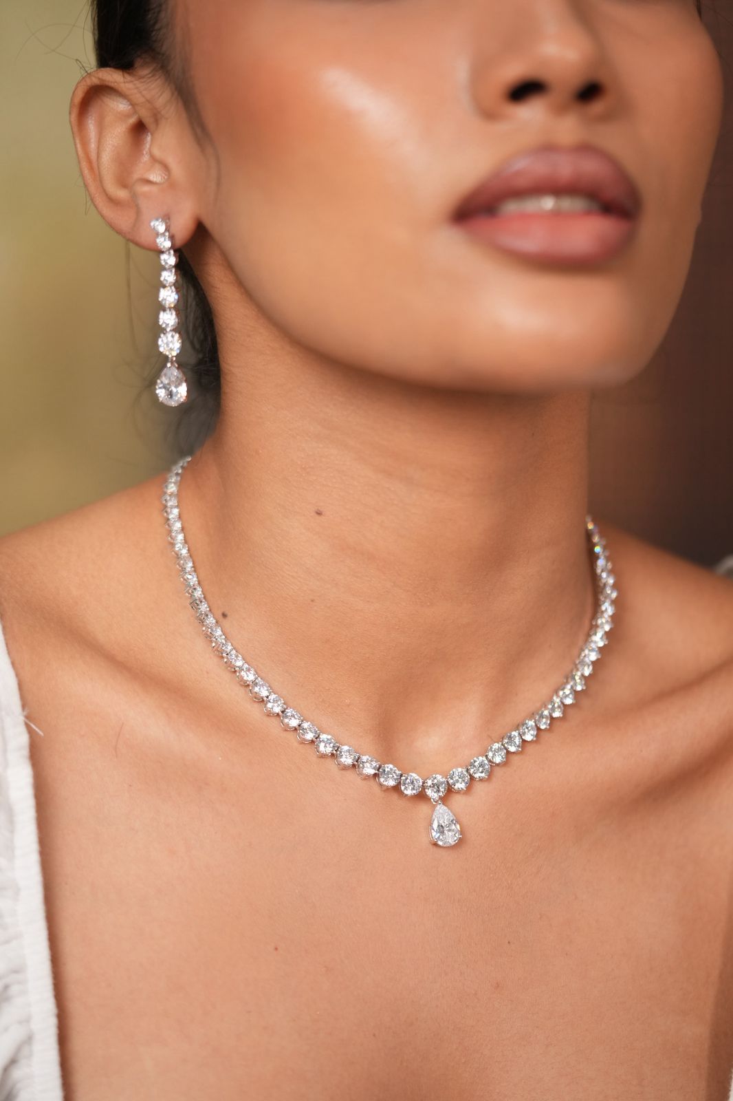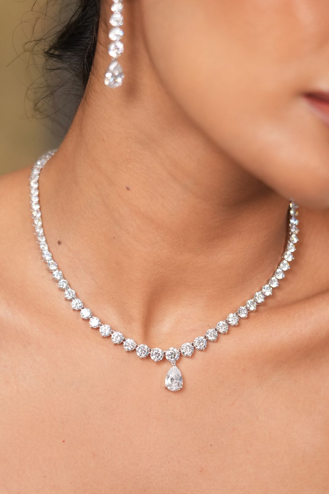 The most classic design of graduating solitaire round diamonds increasing in size and leading to a gorgeous pear drop soltiaire pendant in the center.