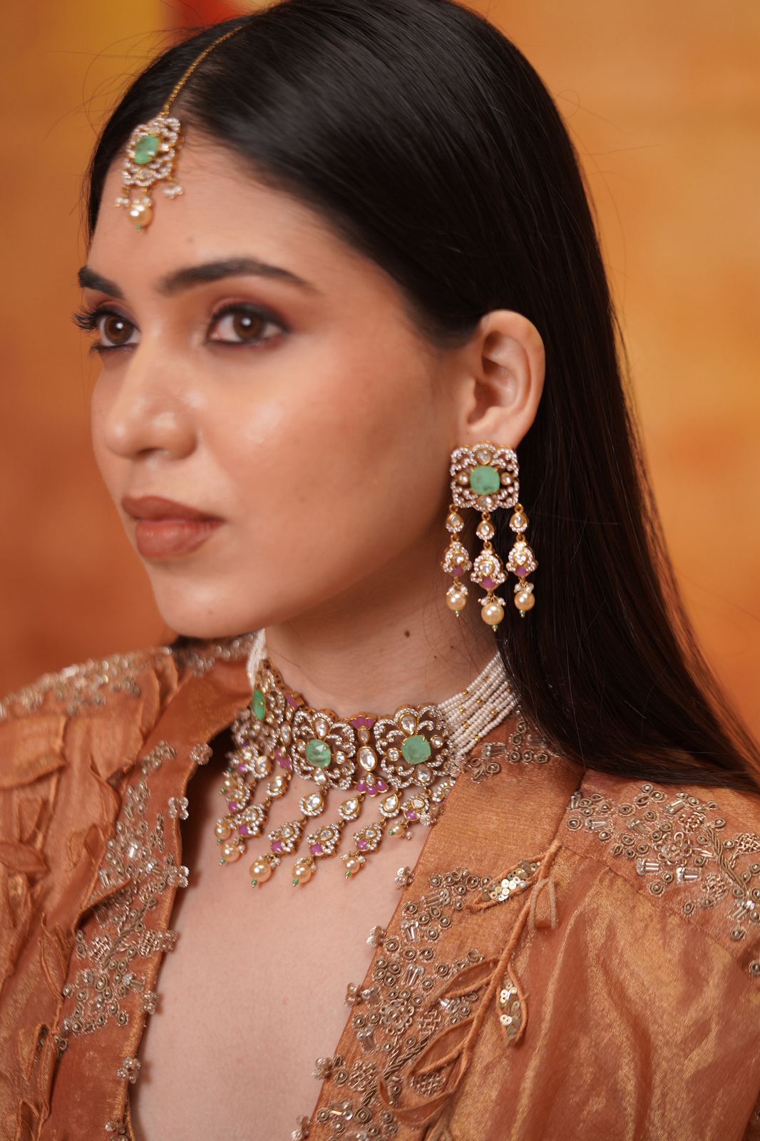 Mint Pink Polki Moissanite Russian Emerald Choker Set