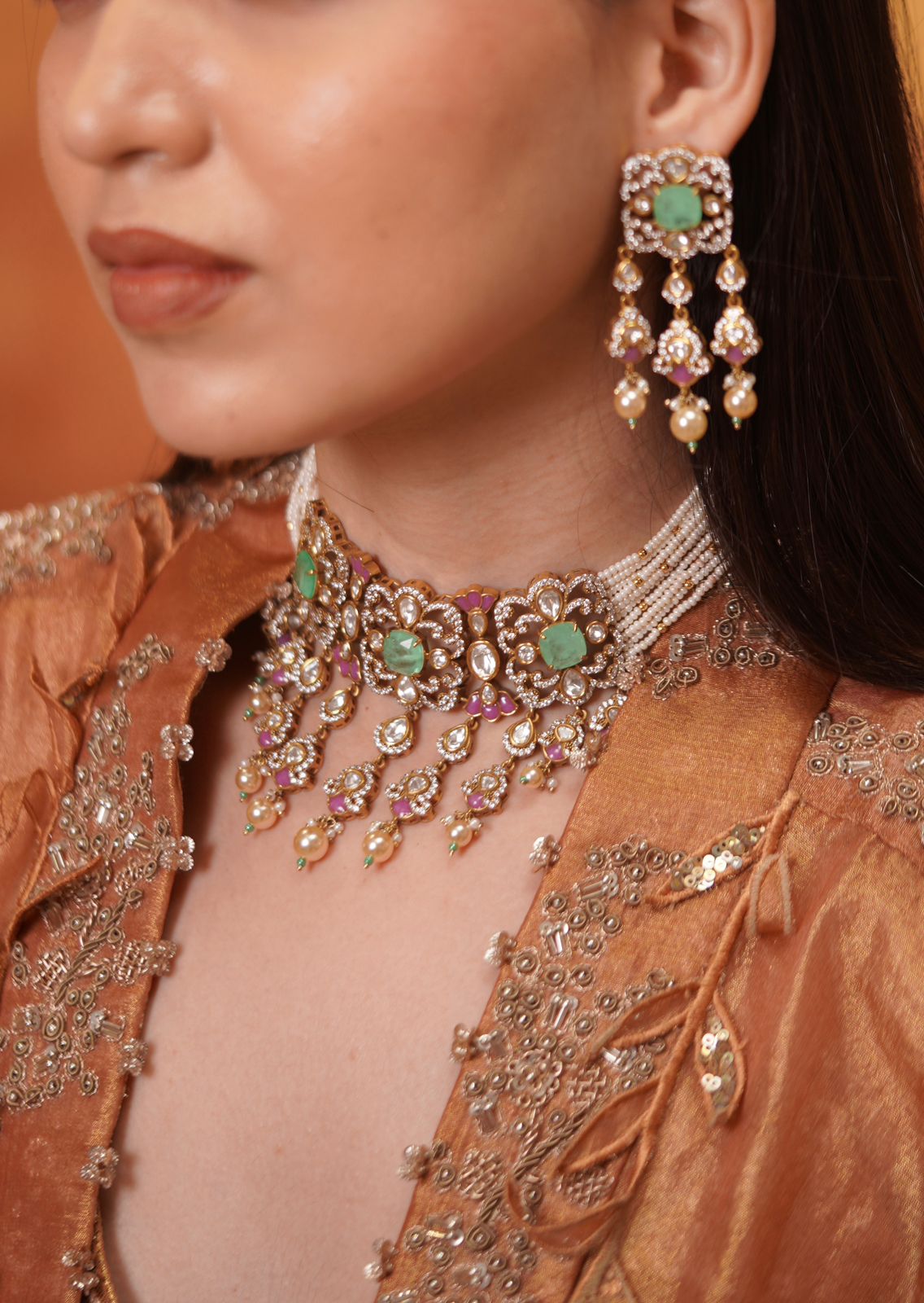 A choker that blends elegance with royalty, crafted in Polki Moissanite and Russian Emeralds.