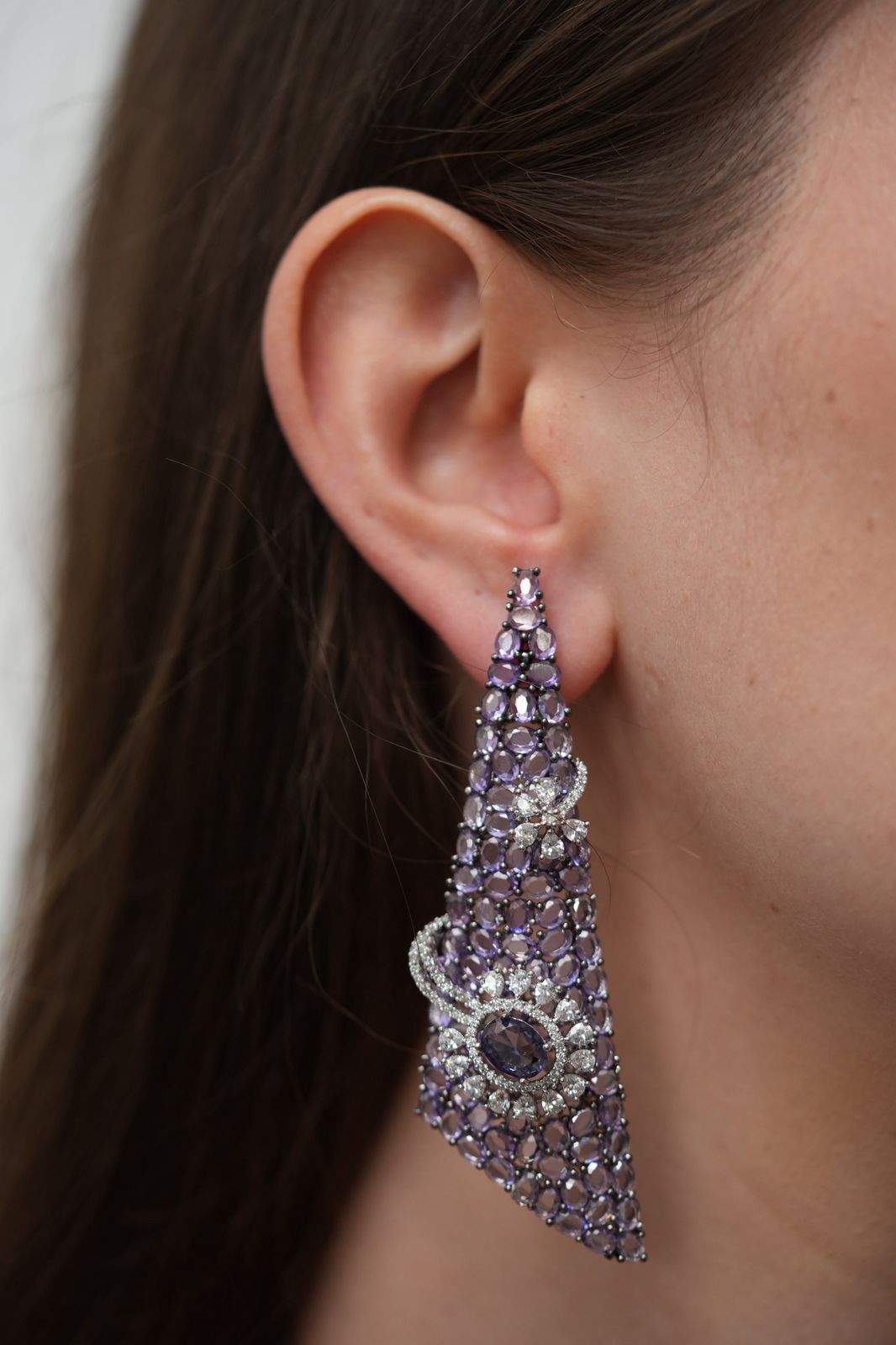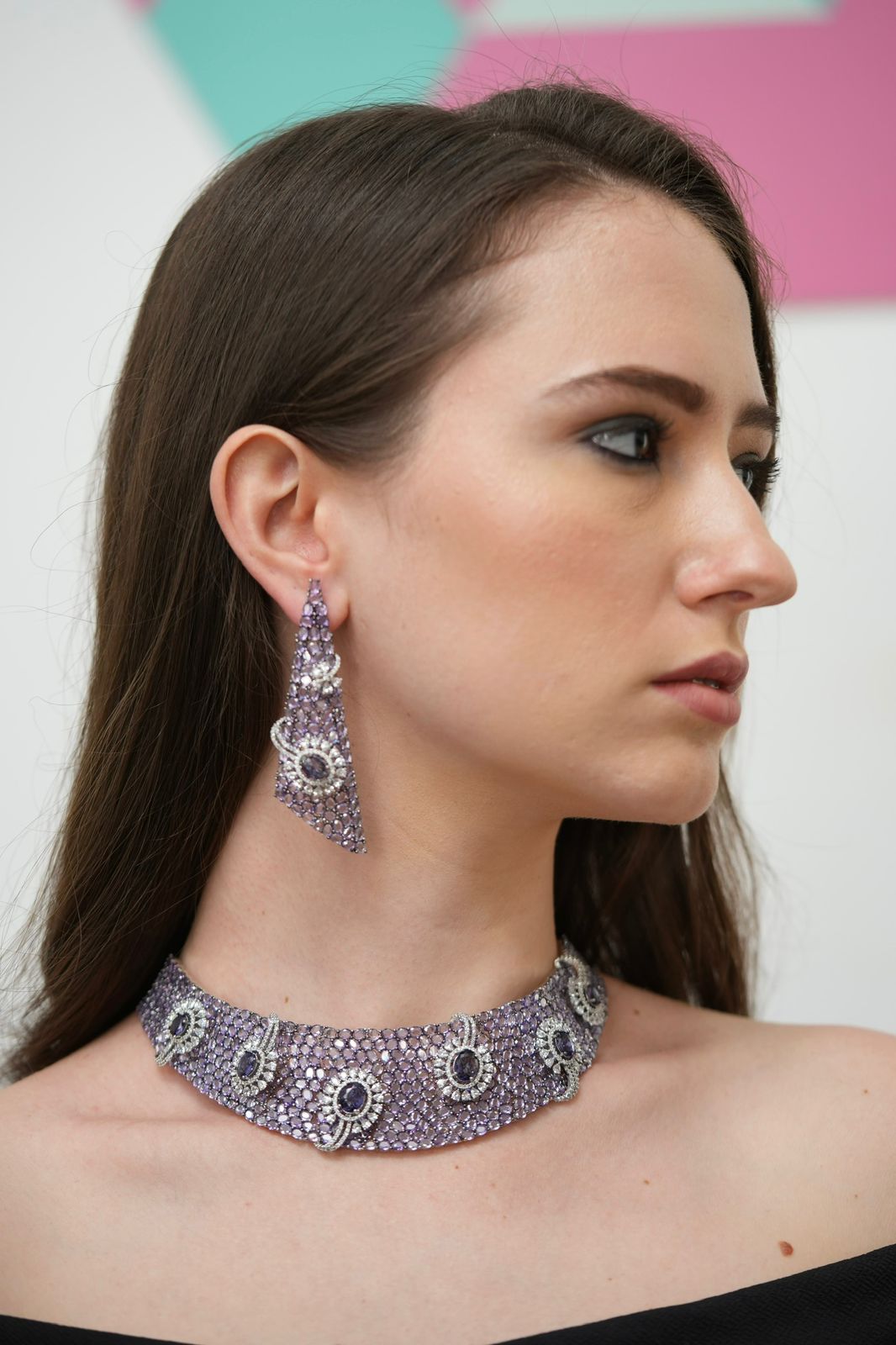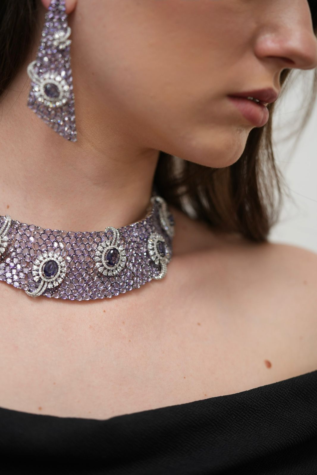 A gorgeous diamond choker set with pave setting purple stones and overlay diamond floral motifs on top. It comes with pretty earrings that sparkle and shine with the subtle hues of lavender.