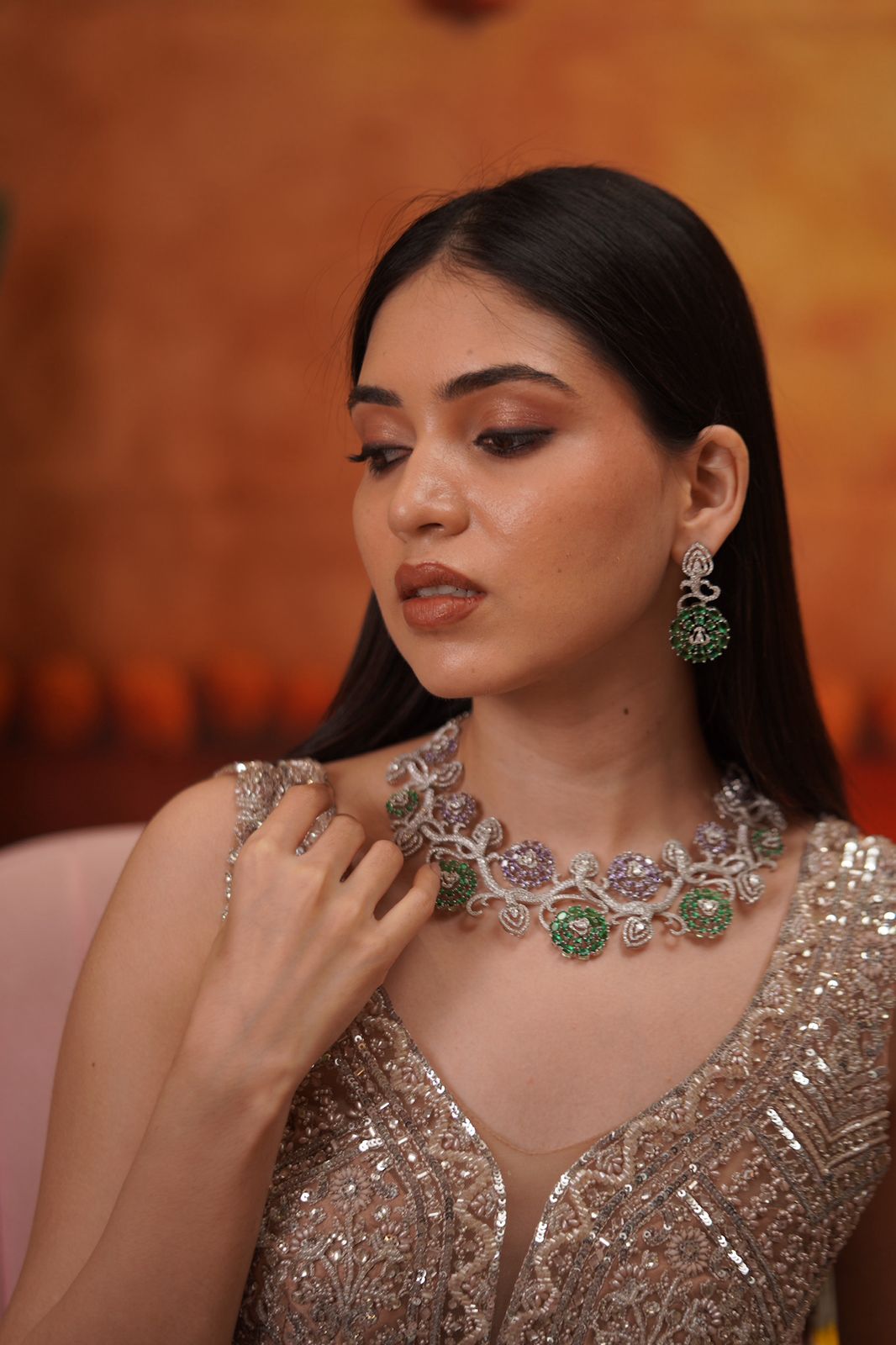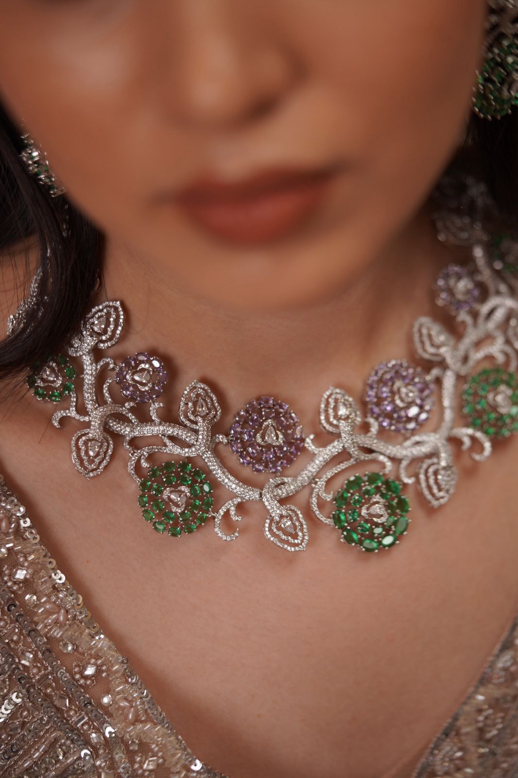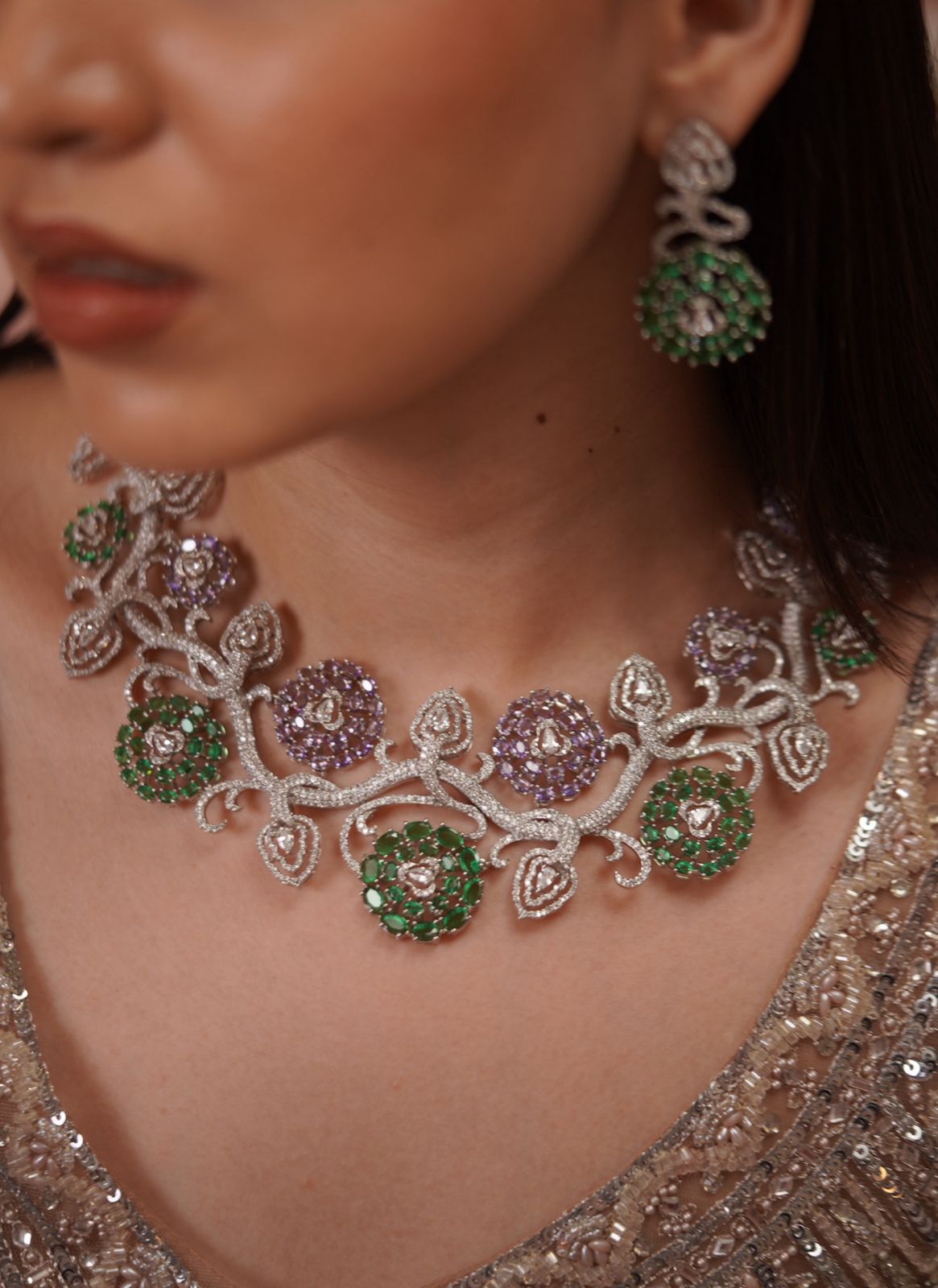 A diamond set with pave stones of emerald’s and amethyst. These put together with intricate tiny diamond detailing look just so dreamy and gorgeous.