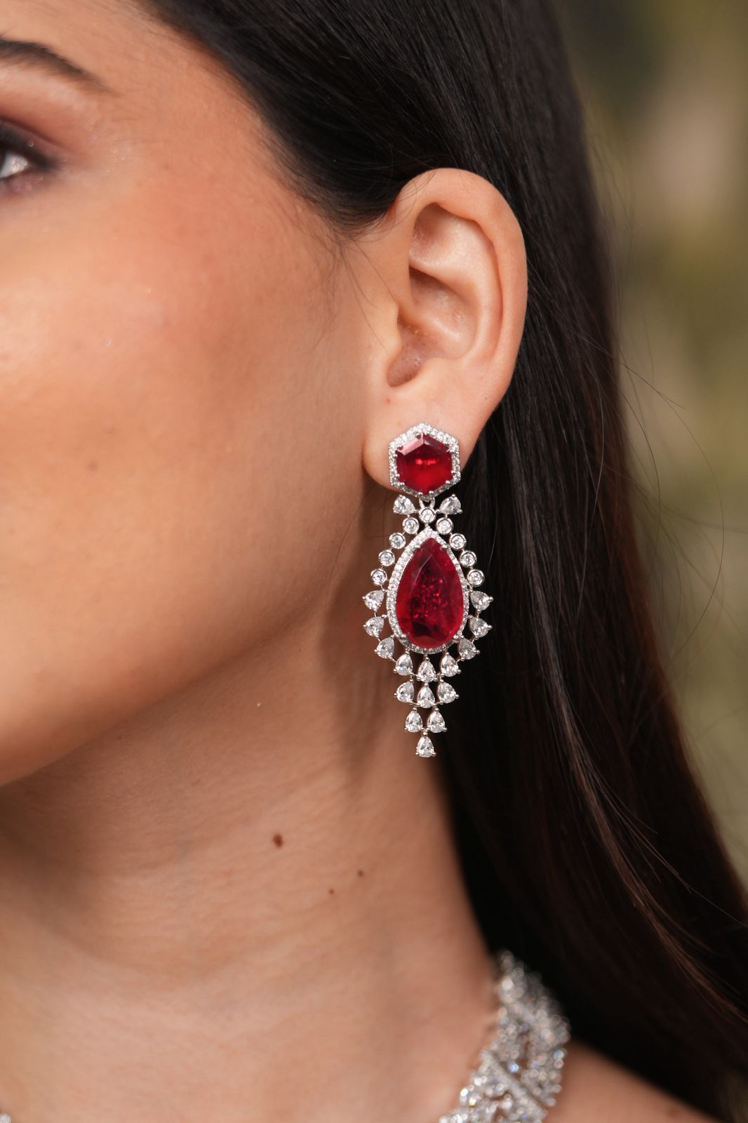A diamond set with multi soltiaires leading to a coloured hexagon shaped hydro stone and a drop with assorted diamonds below. The earrings it comes with are super pretty by themselves.