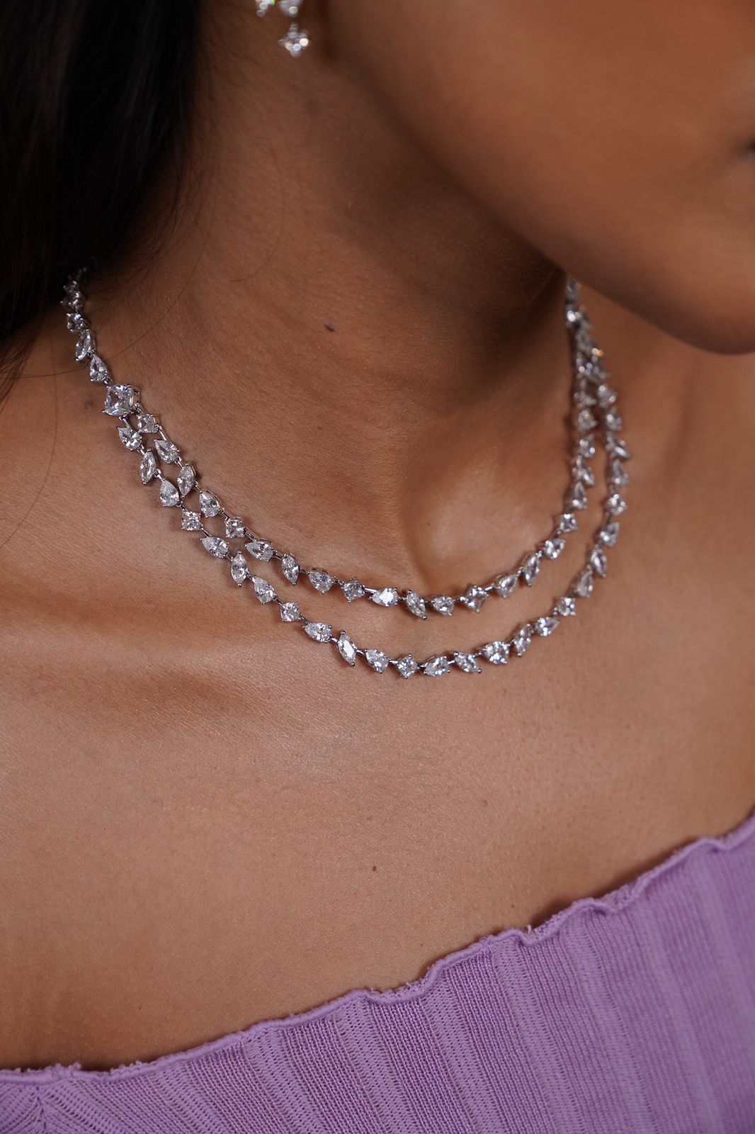 Elevate your style with these exquisite double-layered Necklace , featuring multi-solitaire shaped diamonds that sparkle with elegance and sophistication. Perfect for adding a touch of glamour to any ensemble !