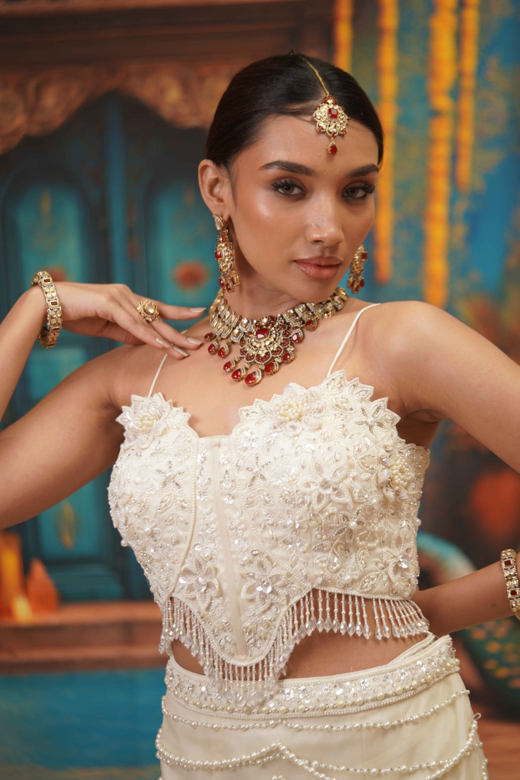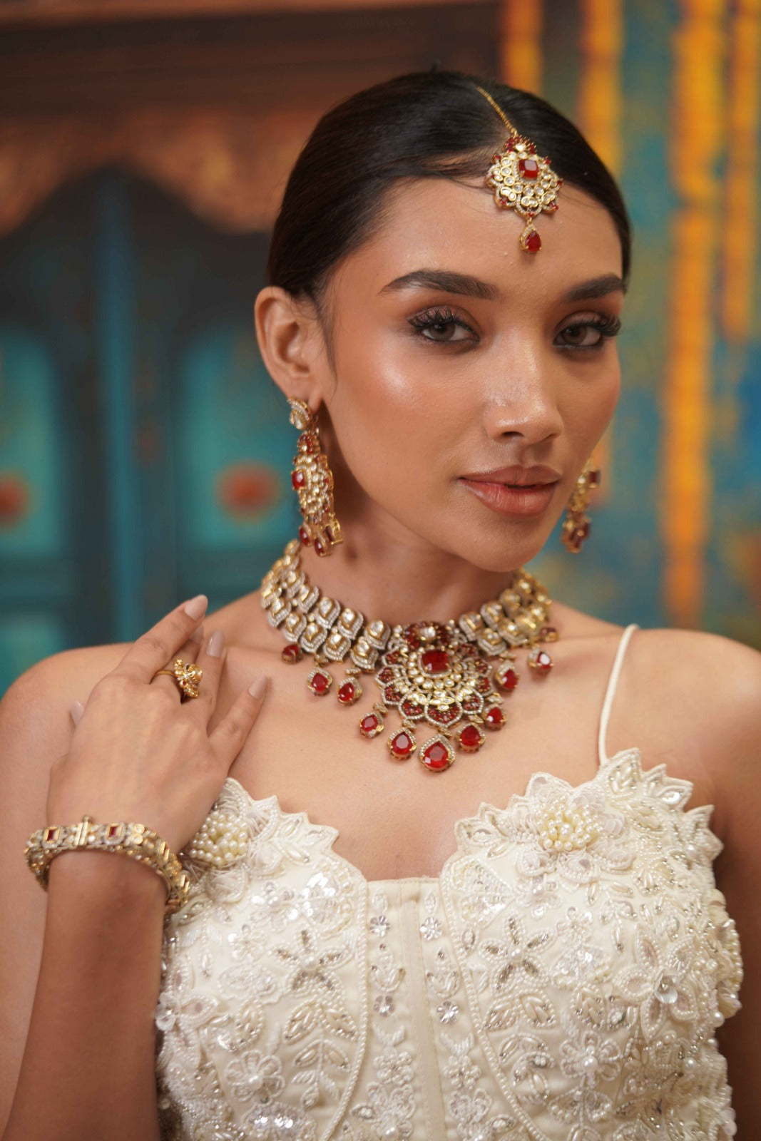 A bride cannot go wrong with red , red is fiery and desirable and this best describes our gorgeous bridal set.  This necklace set comes with a matching tika, hairchains and a dramatic ring kada set.