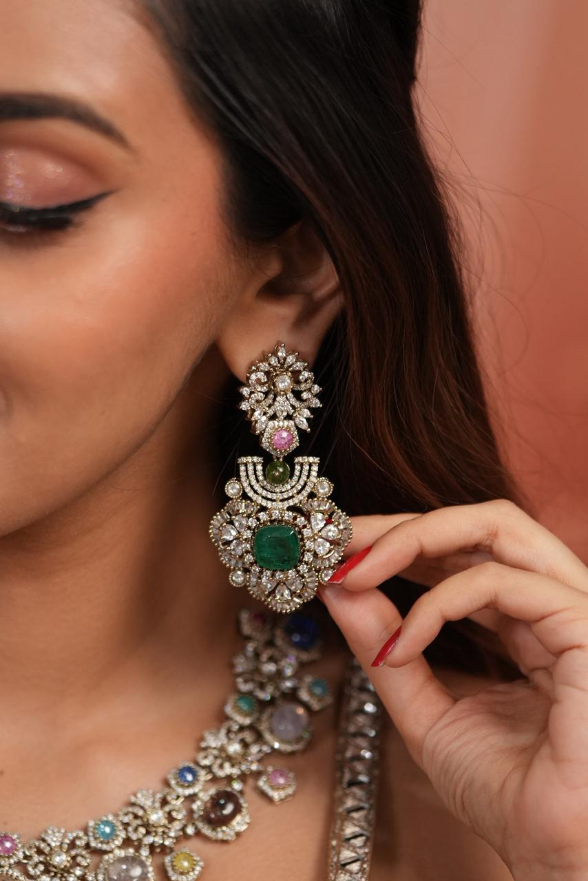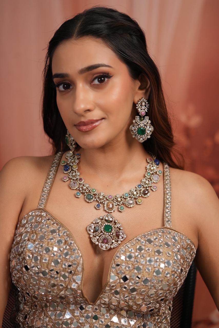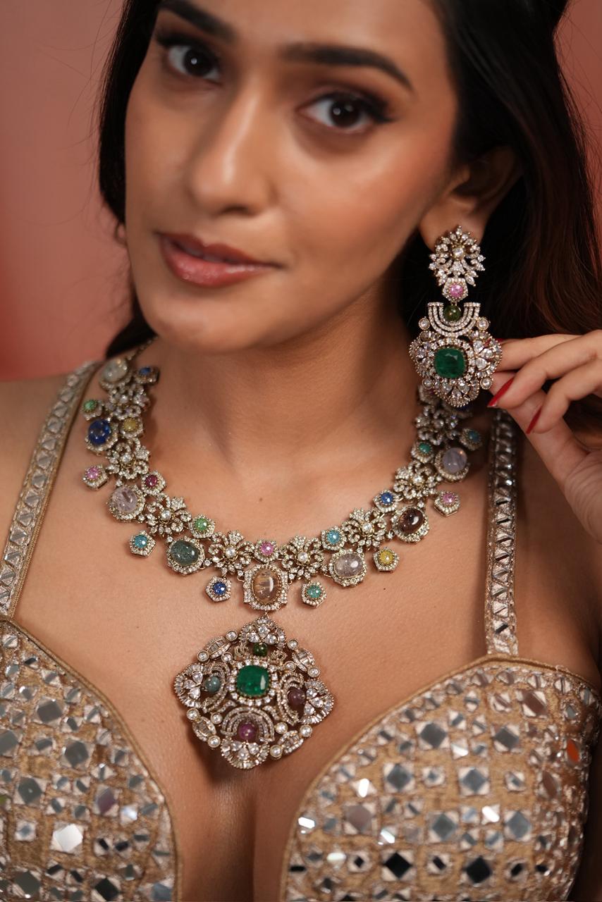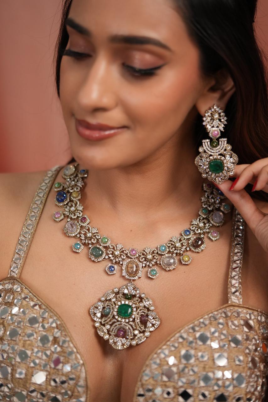 A big oversized multi gemstone set with neutral colourplay oversized earrings, and a grand necklace that has the most spectacular karigari. This set is glamour done right!
