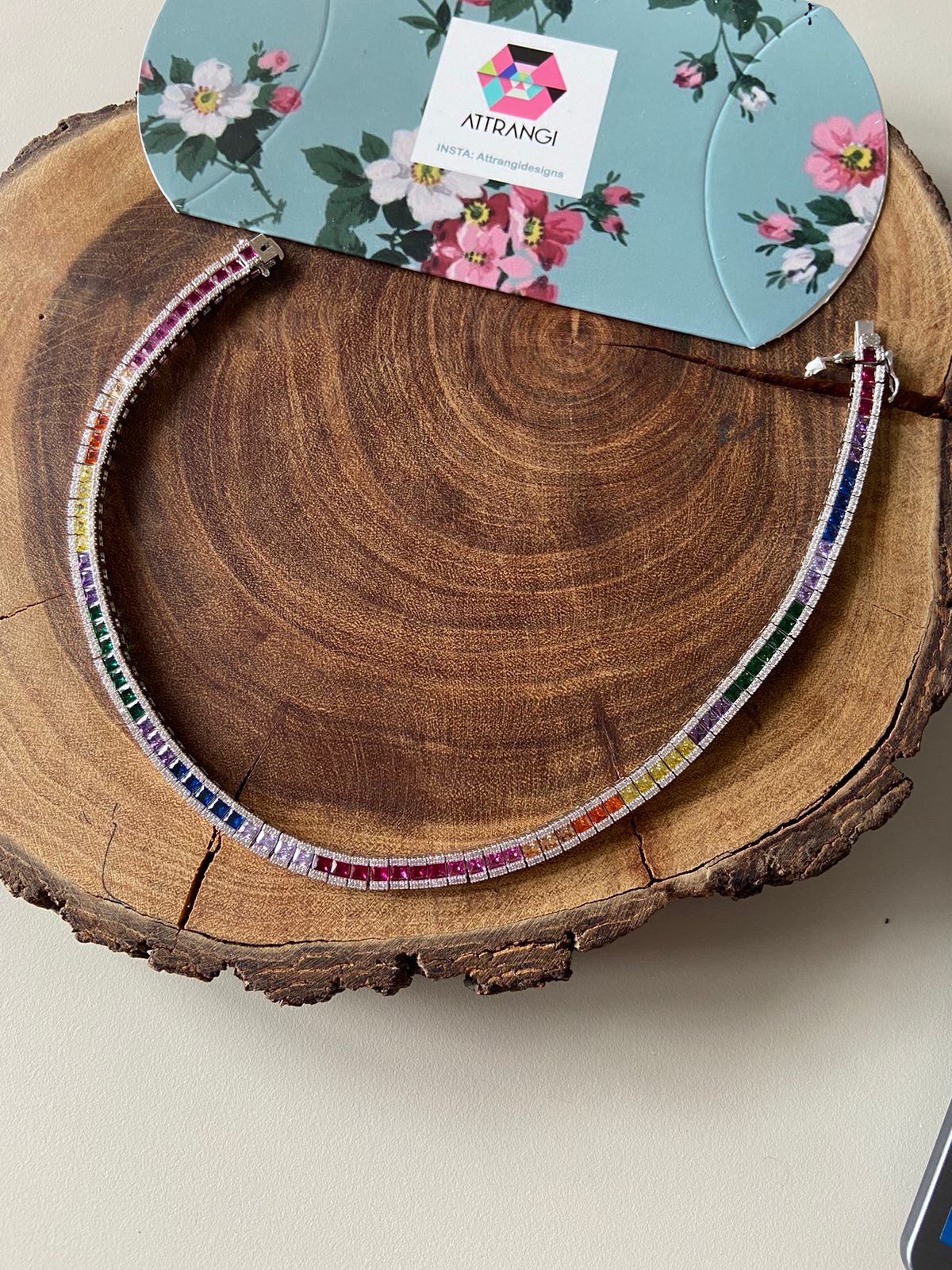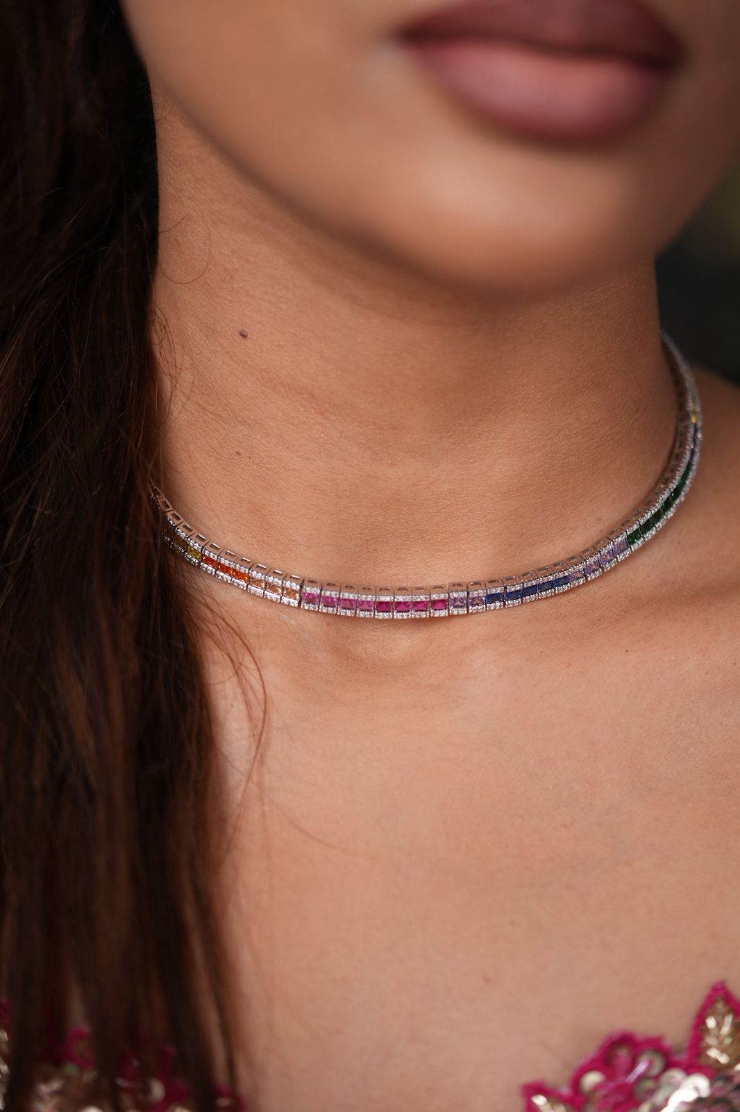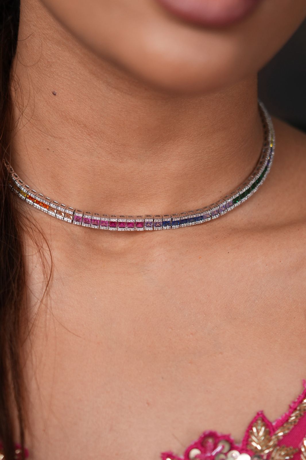 A diamond necklace with the hues of rainbow colours. This rich masterpiece fits the neck snug and looks nothing less than a dream. Style this effortlessly with anything western, and be sure to win compliments.