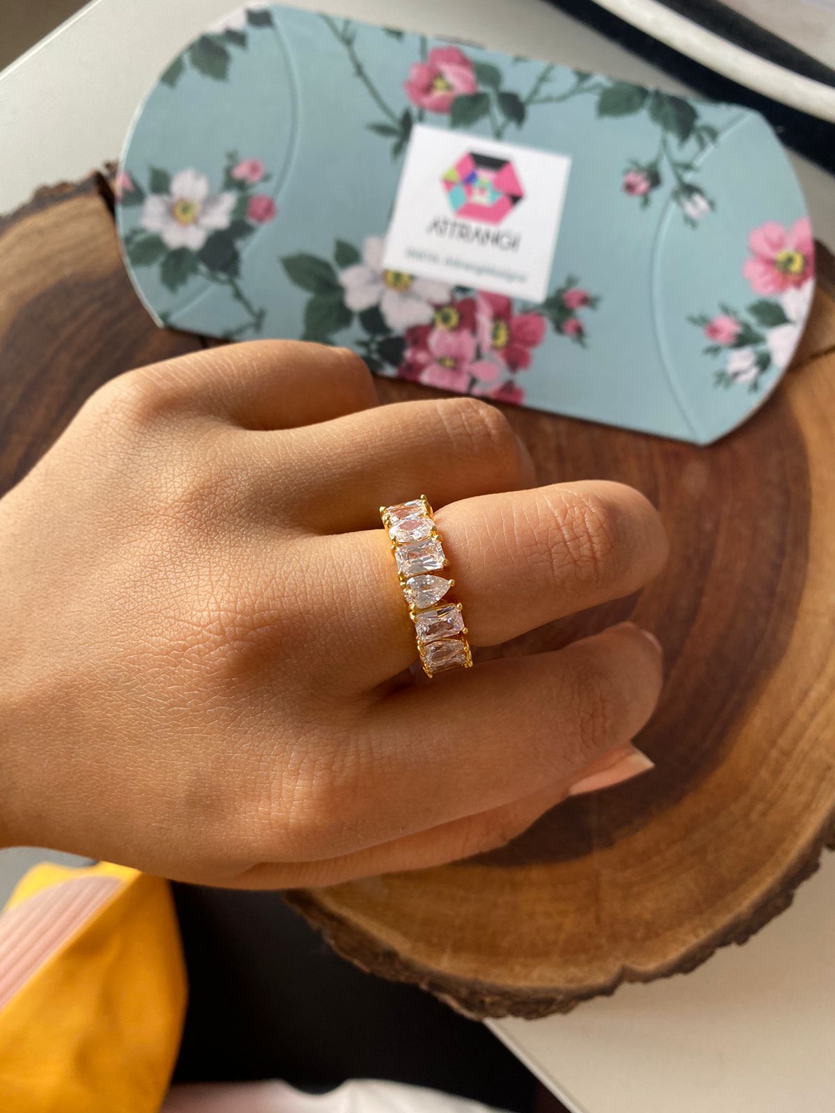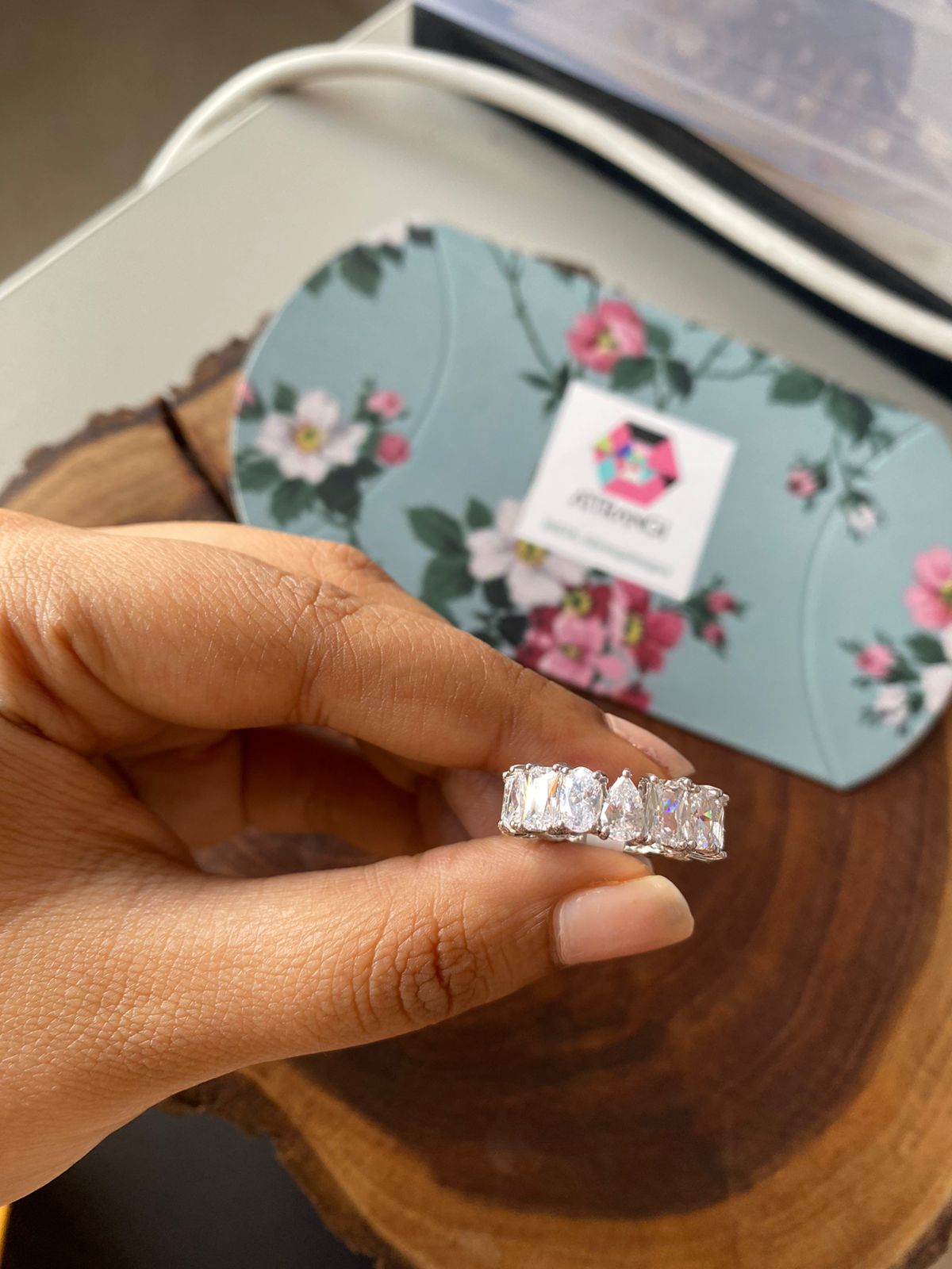 A diamond band ring with pear, emerald cut, and oval shaped diamonds going all the way 360 degree round with fire and fineness. This daily wear band ring with 35 cent diamond solitaire each is a subtle statement maker.