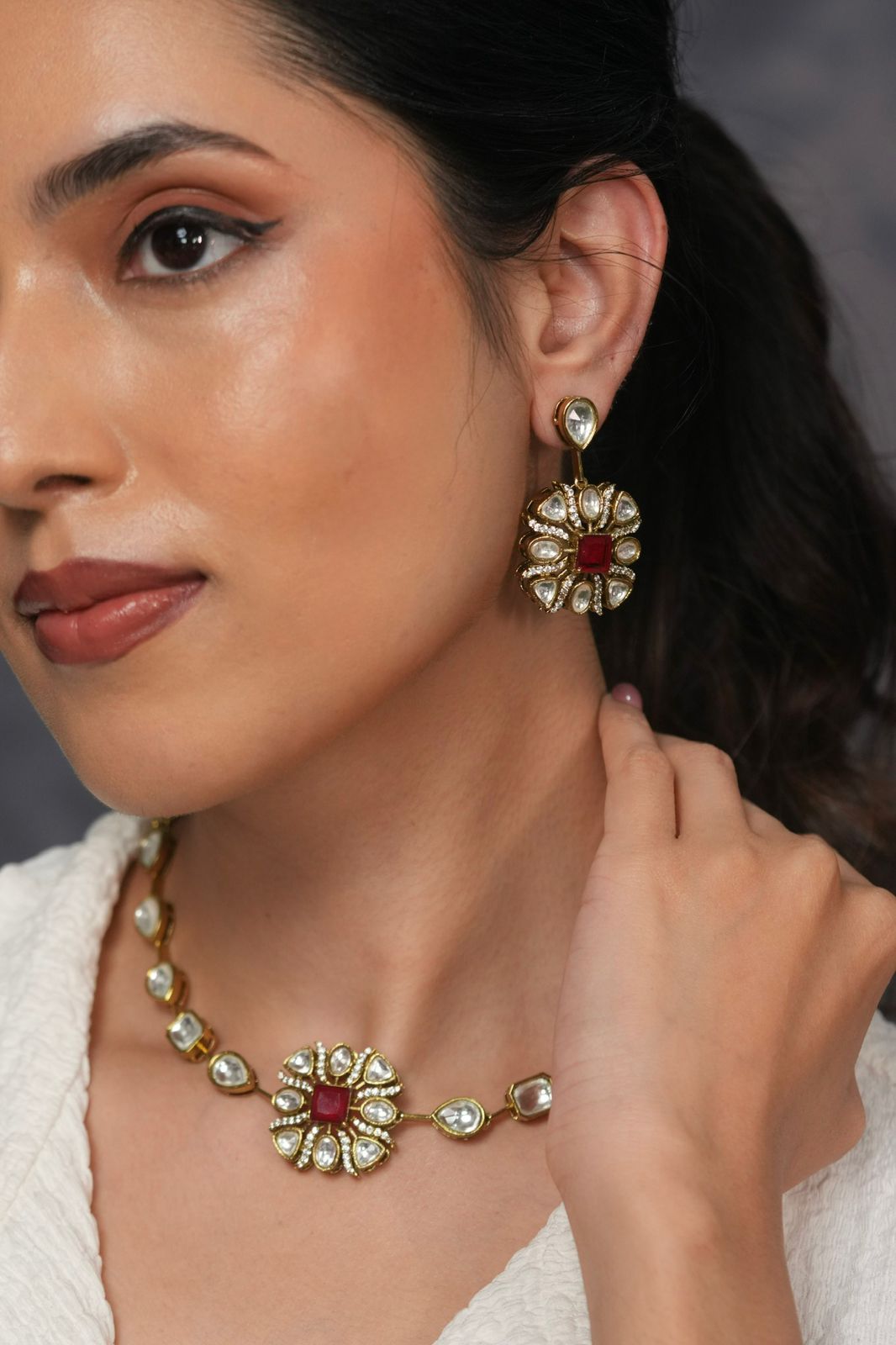 A Polki choker set with multi shaped motifs on the side leading to a solid Center piece that fits snug and looks so indo western. Easy to style, easy to wear, this one is perfect from small poojas to bridesmaid vibes.