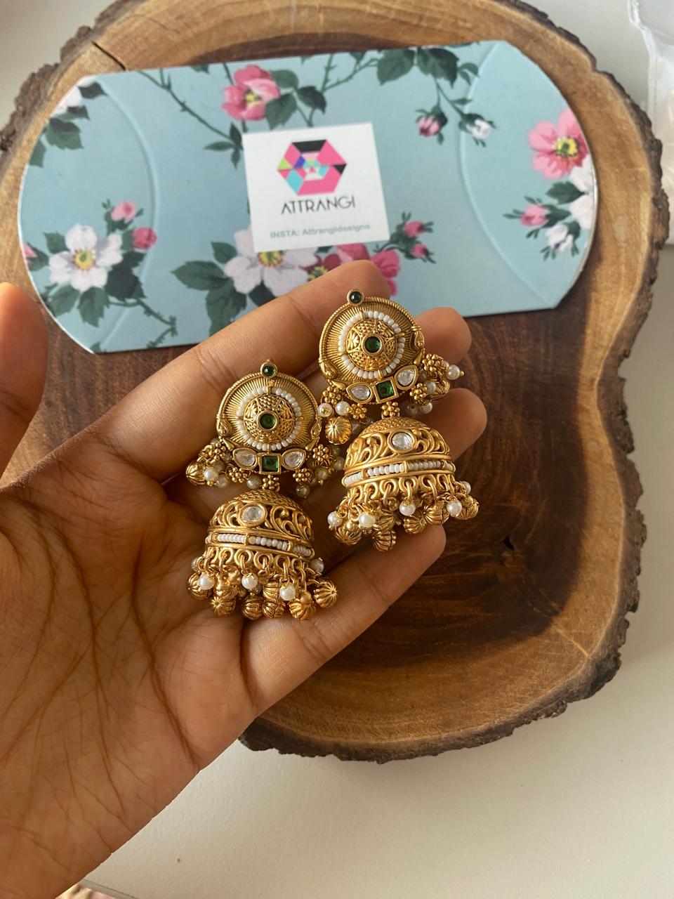 Their diamond jhumkas are such good quality. The setting is heavy and solid. The diamonds are clear and sparkly after weeks of wear. Worth every penny for statement earrings that last! Thank you Attrangi