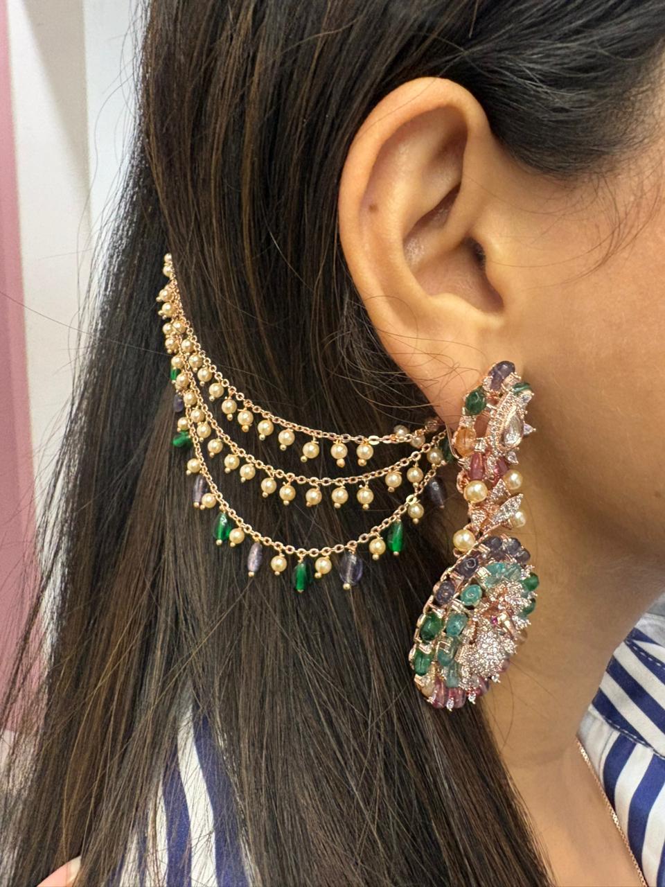 A gorgeous blend of green and purple at the bottom of a 3 layered hair chain. The pearl and bead play is stunning. You’ll love it, we are sure you will.