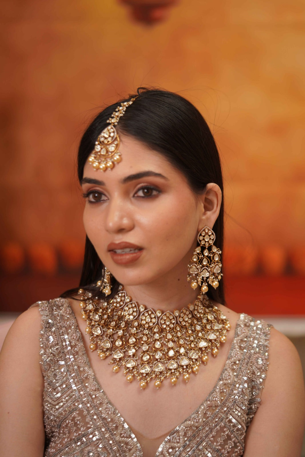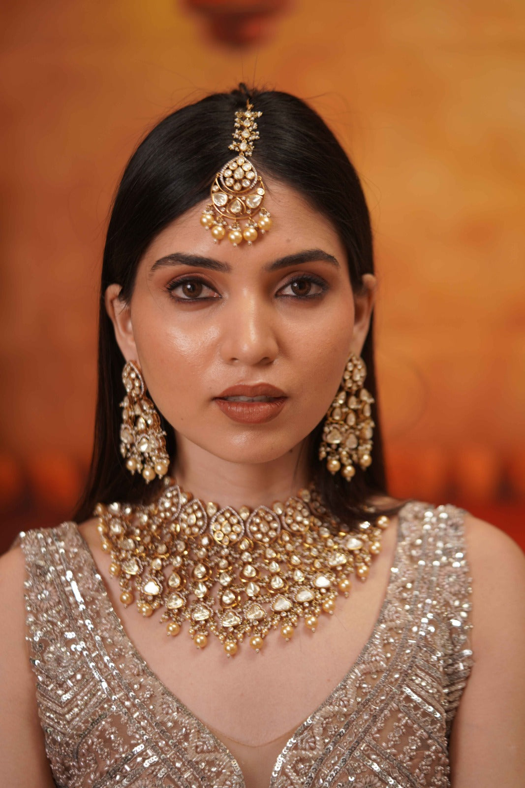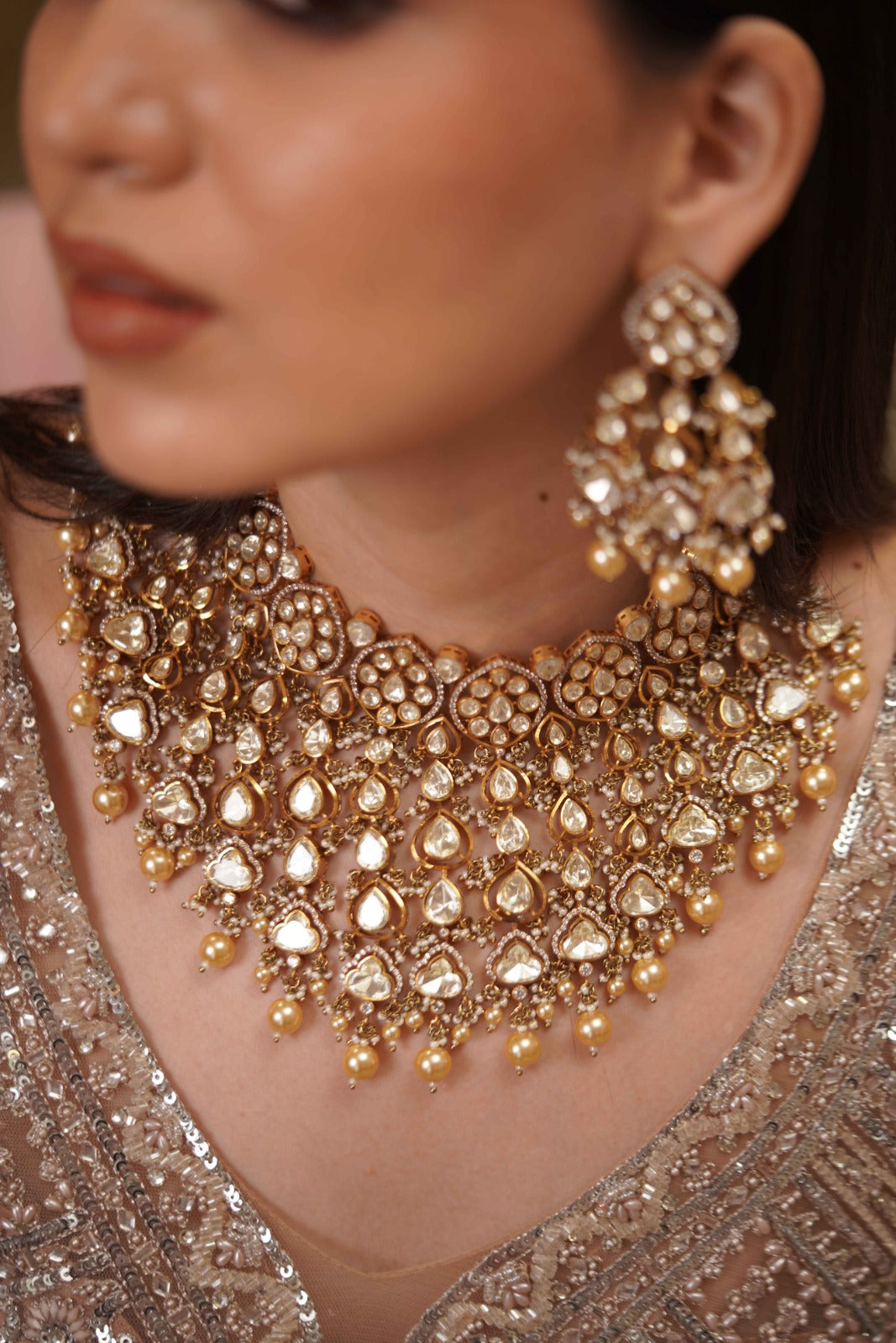 An Indian set that has great grandeur with jhaalar style polki droplets exaggerated from the choker band. This set is safe and pretty, adds drama and an oomph factor to every coloured bridal lehenga.