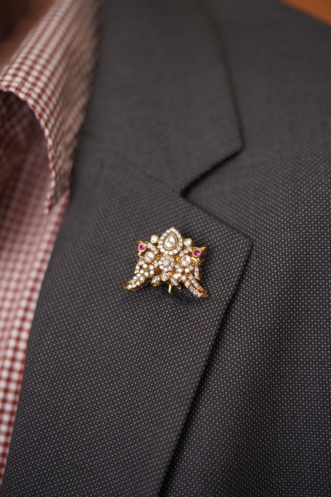 An antique gold lapel pin that looks nothing less than royalty on a suit or a shirt. This men’s accessory adds such a vibrant charm of elegance on anything basic.