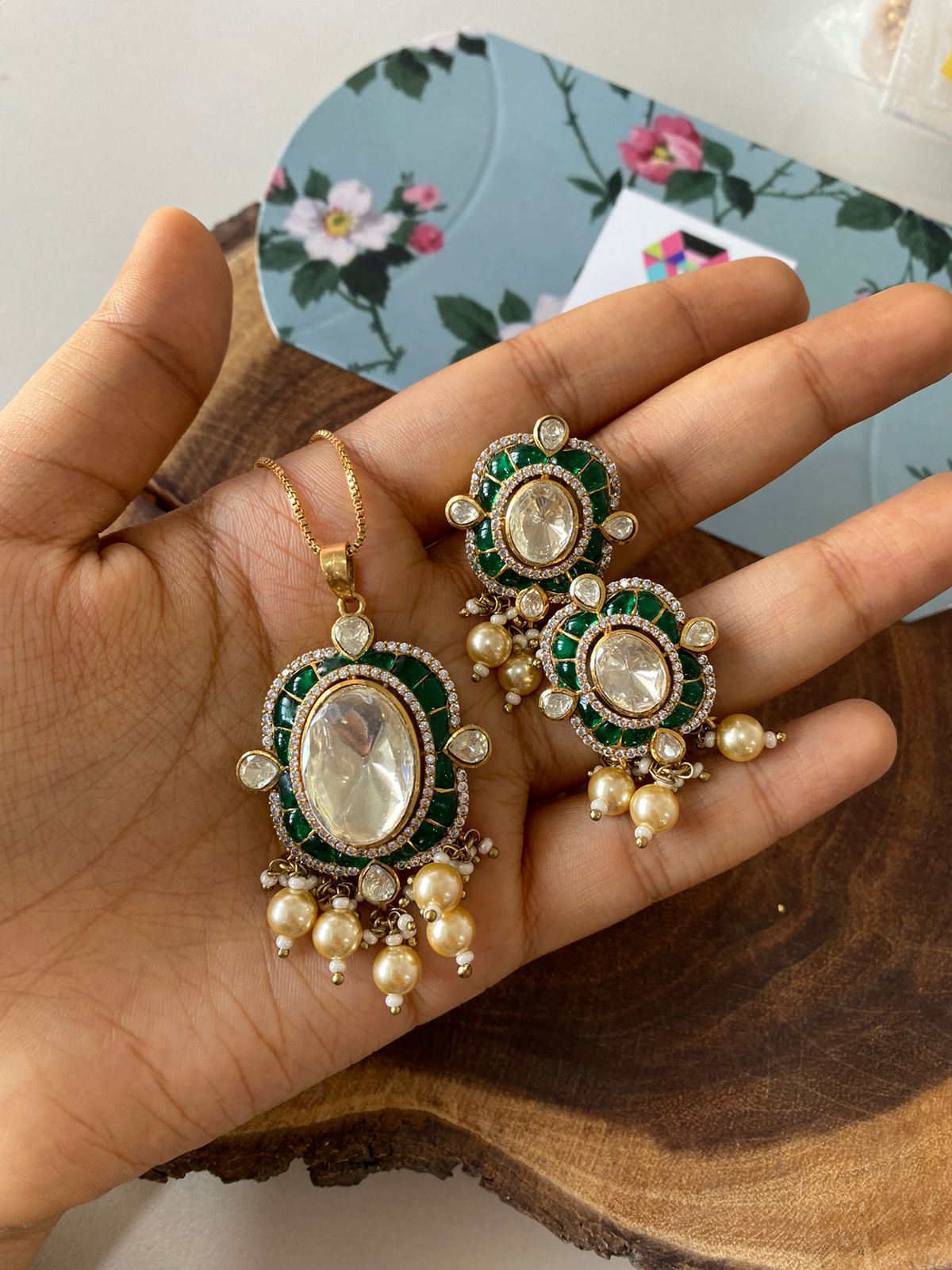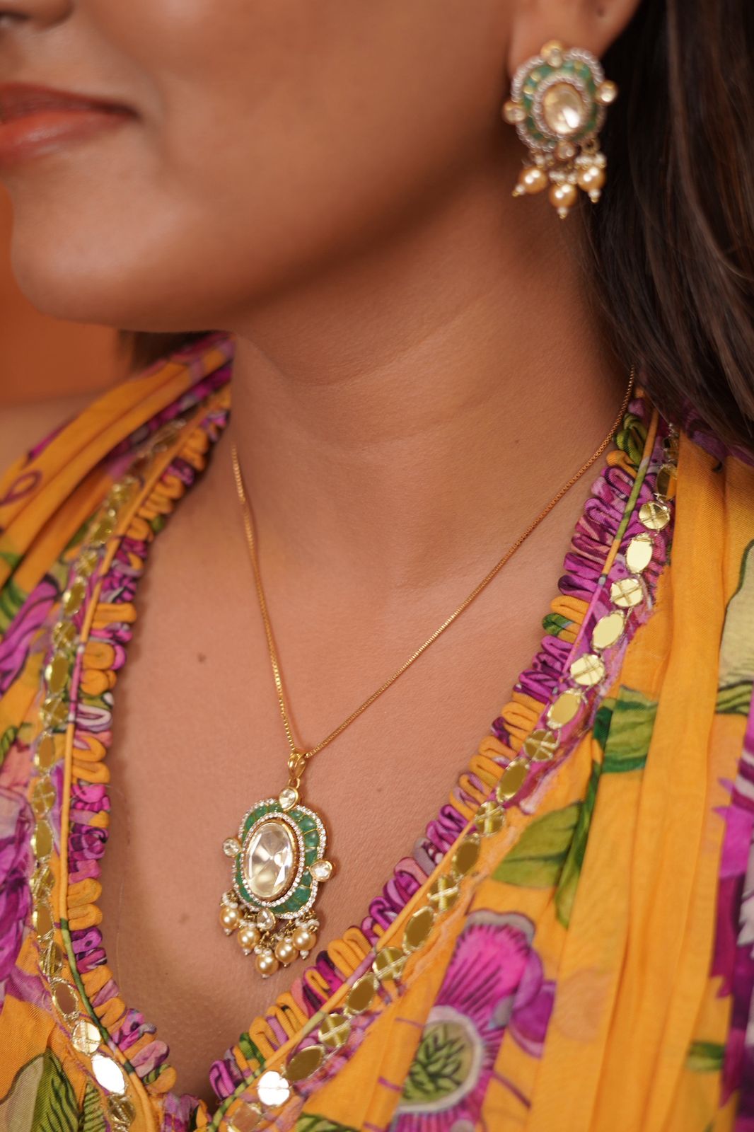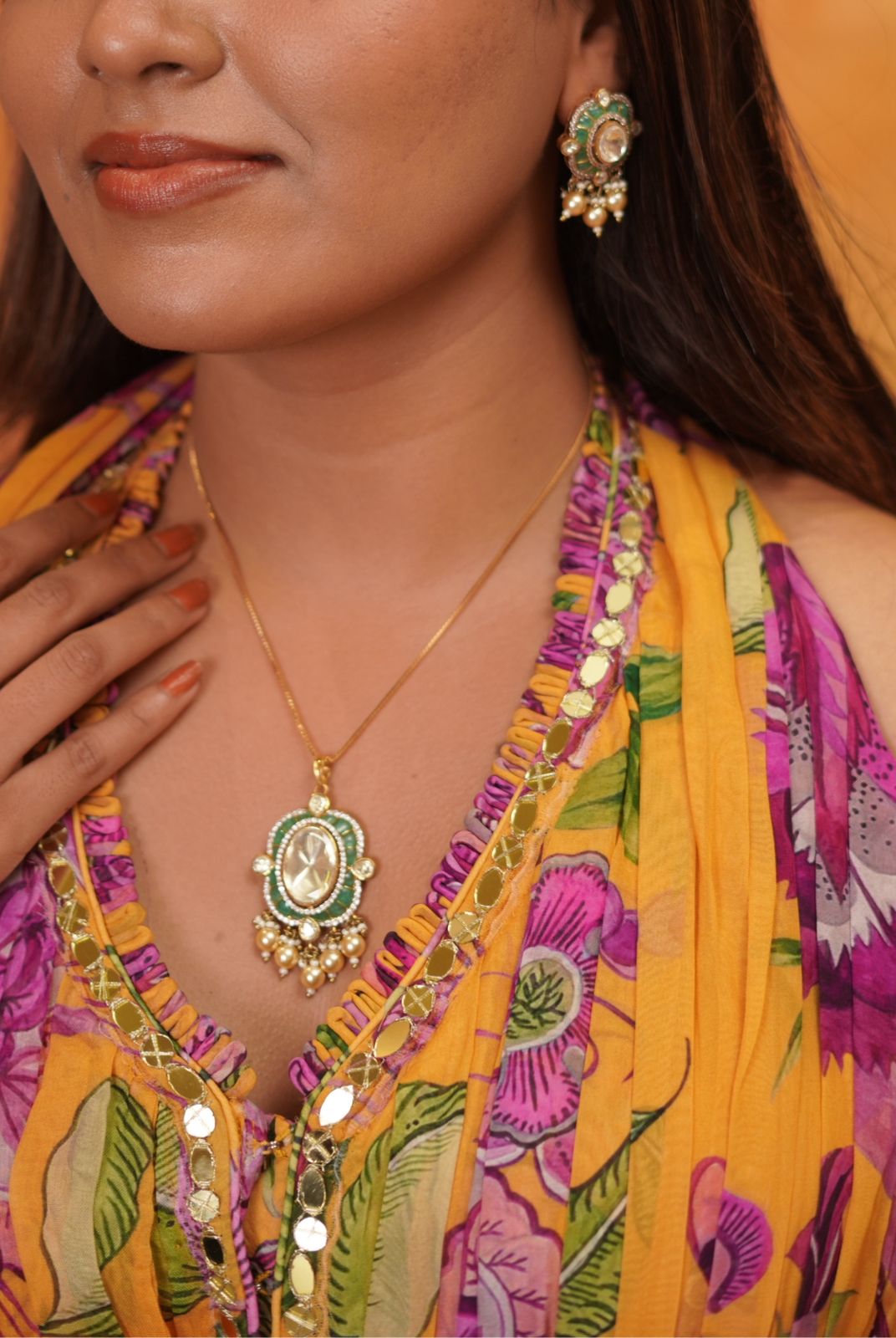 An Indian pendant set with Meenakari detailing on the corners and Polki Moissanite in the center along with a chain in gold polish and studs that look dreamy by themselves.