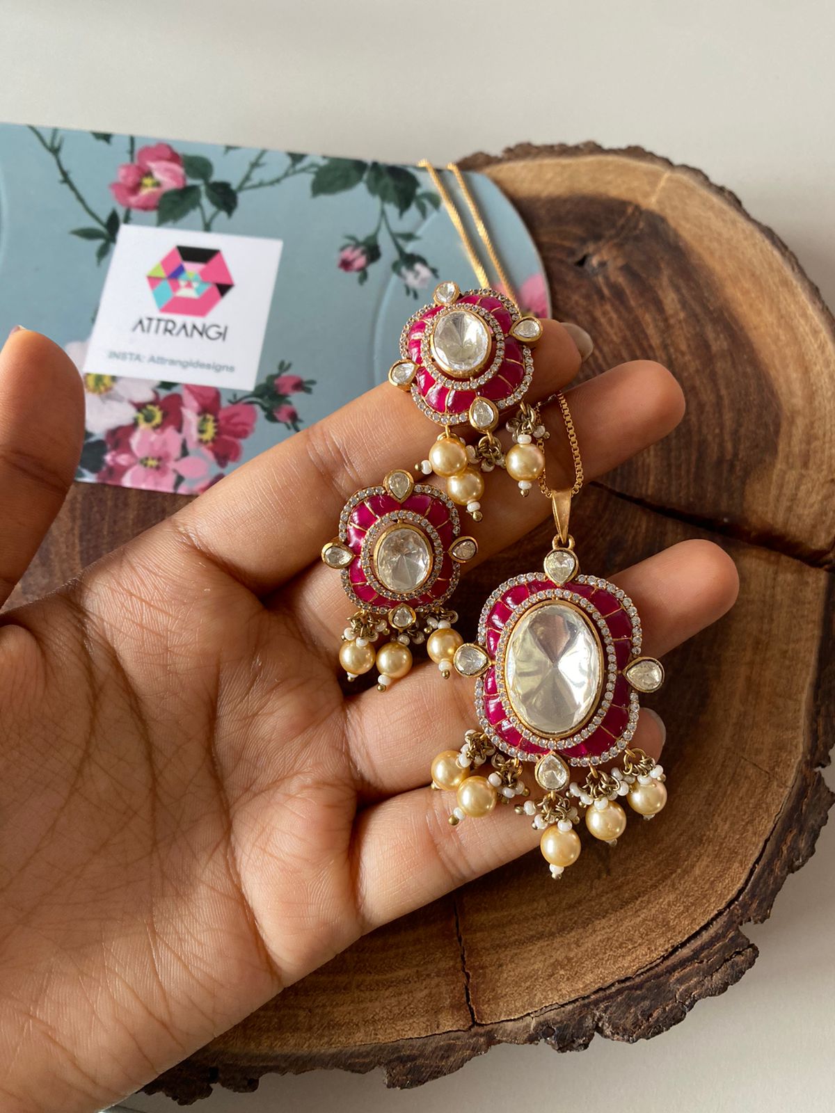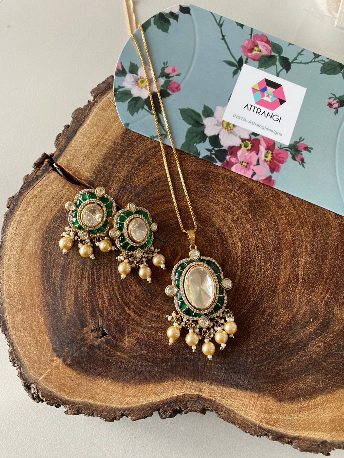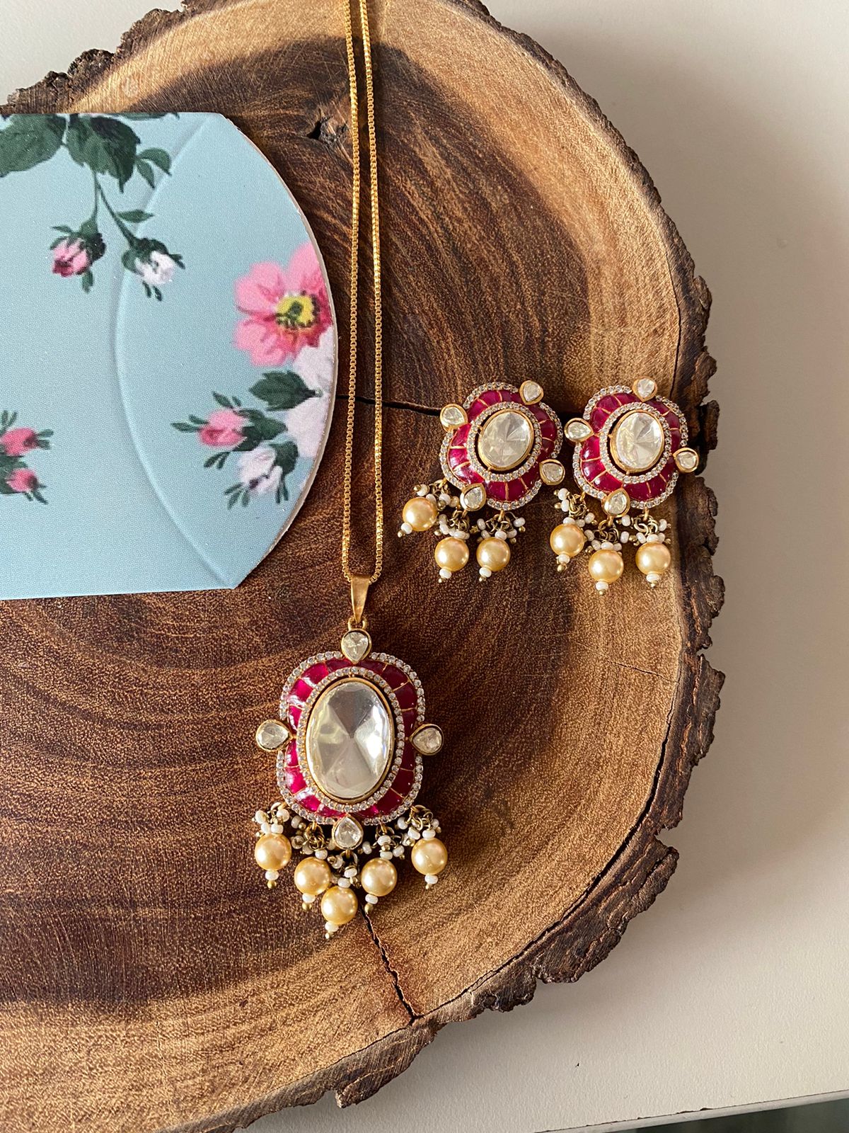 An Indian pendant set with Meenakari detailing on the corners and Polki Moissanite in the center along with a chain in gold polish and studs that look dreamy by themselves.