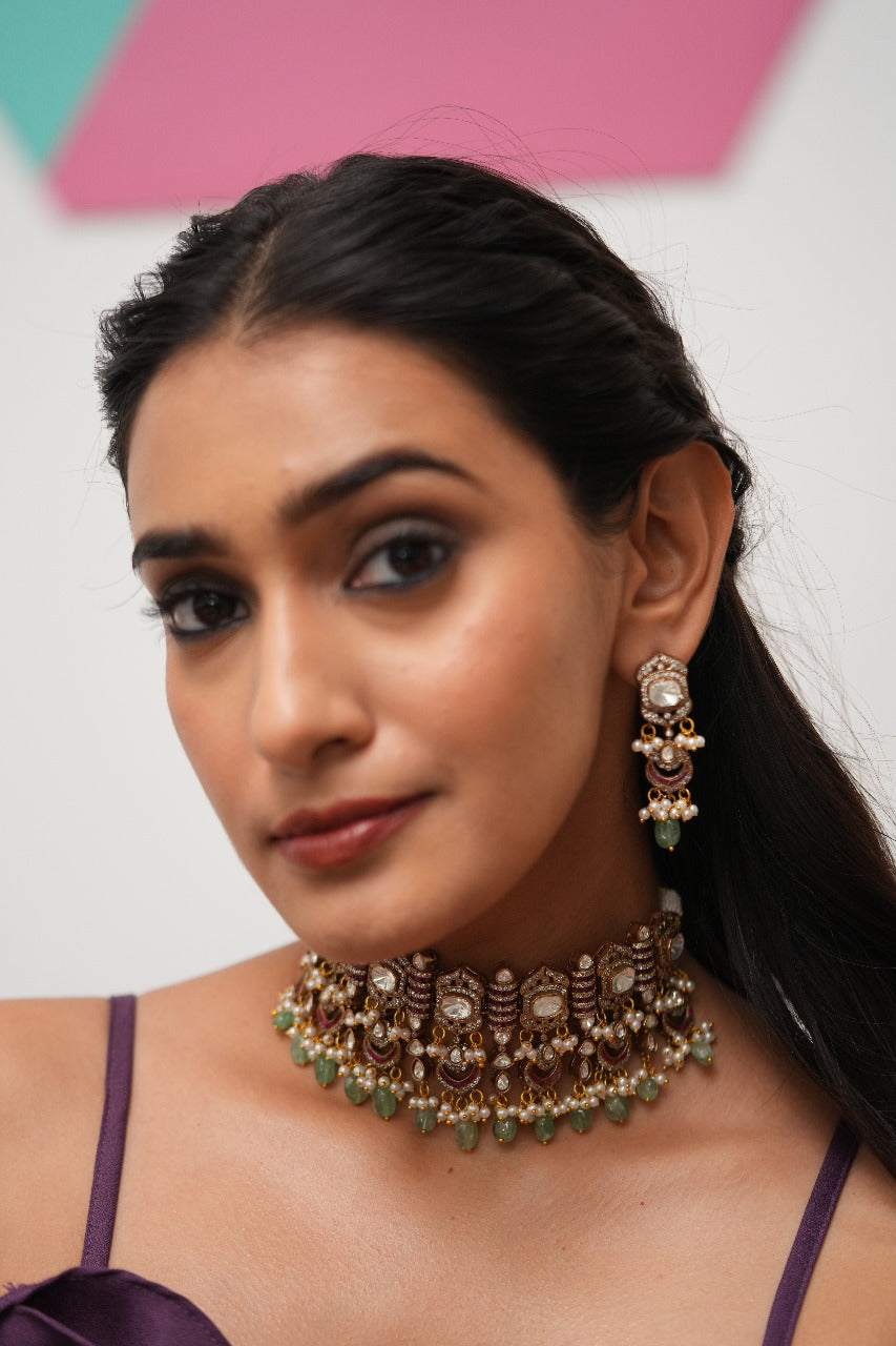 A polki choker set with the highest quality of uncut diamonds surrounded by rubies and emerald drops and diamonds with the best finish. A choker set so elegant that you can style in multiple ways