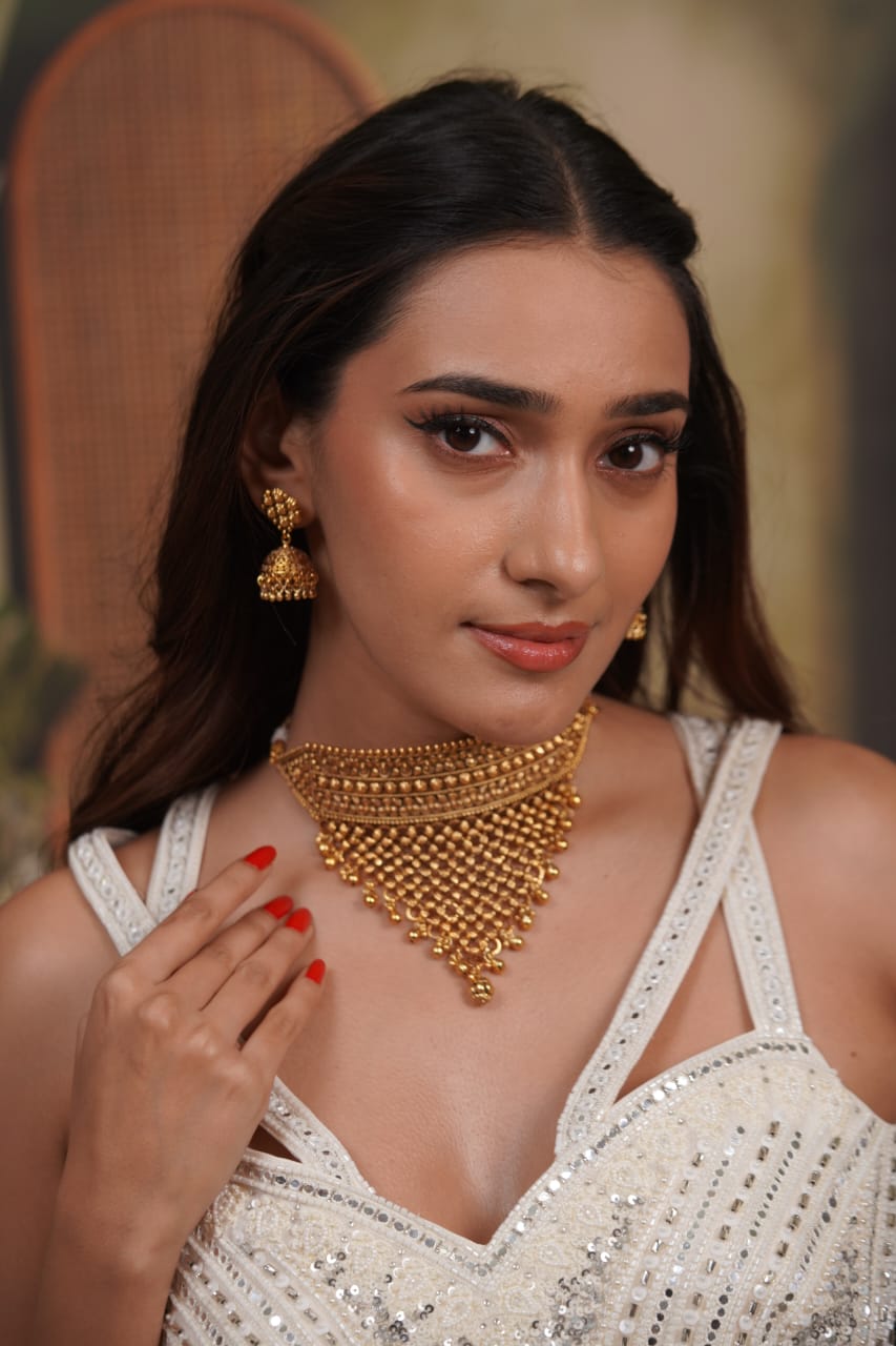 A classic Rajputana-inspired Aad set with intricate traditional motifs and a rich gold-plated finish that gives a true heirloom jewellery feel. Paired with statement jhumkas, it brings timeless elegance and a grand next-to-real look perfect for festive and occasion wear.