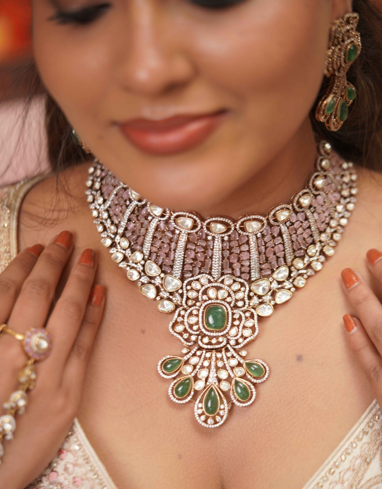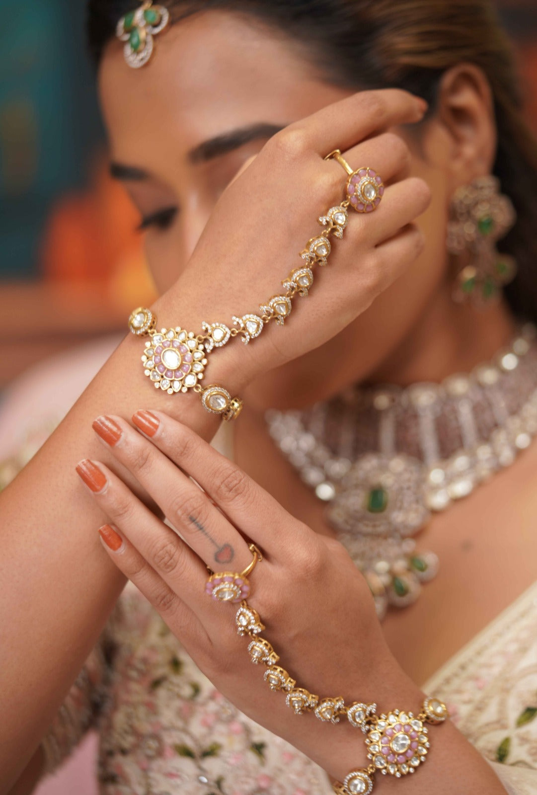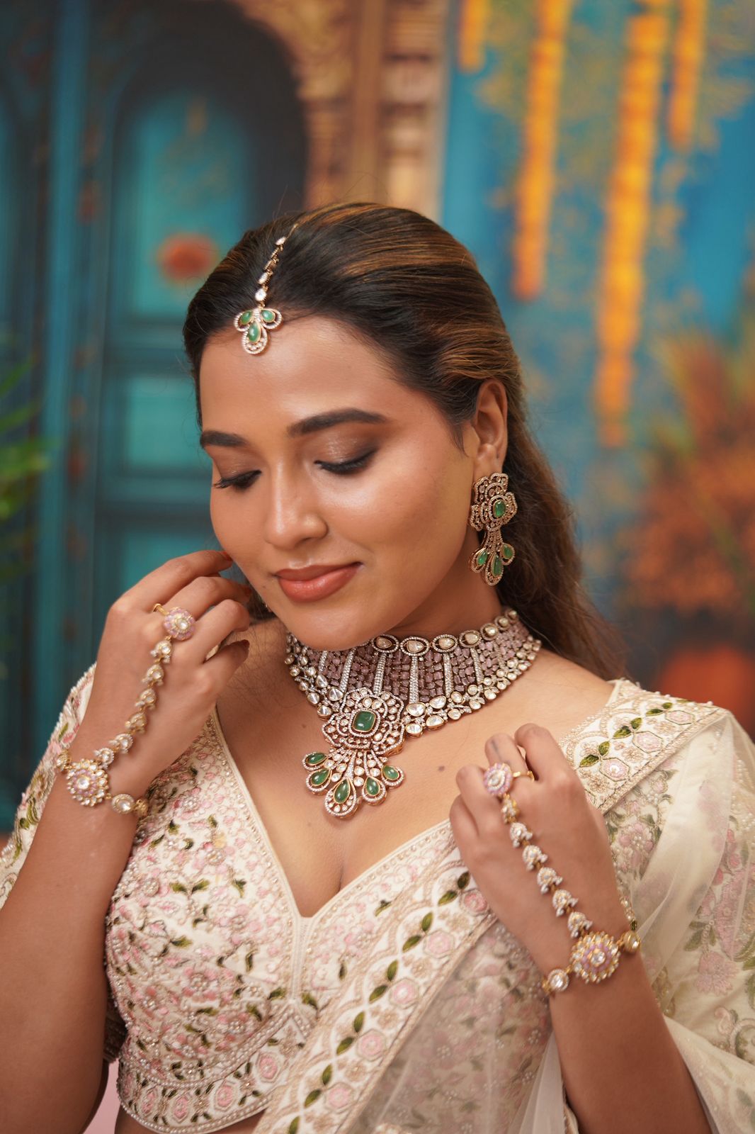A bridal set for the most contemporary bride. A bride who has style and taste. Made with clustered coloured stones in pastel hues, this one comes with hathpans that match its demeanour and name. If You are looking for a set with some touches of mint and pink don't fail to opt for this set, and reach out to us personally for customizations.
