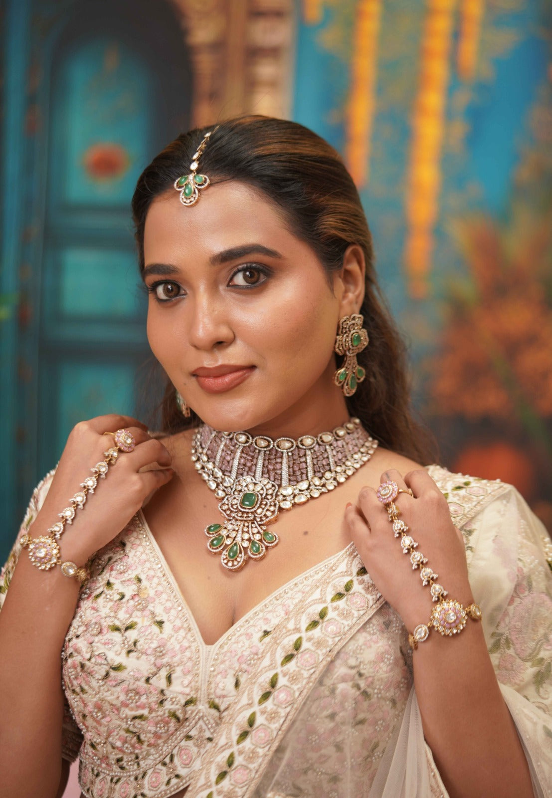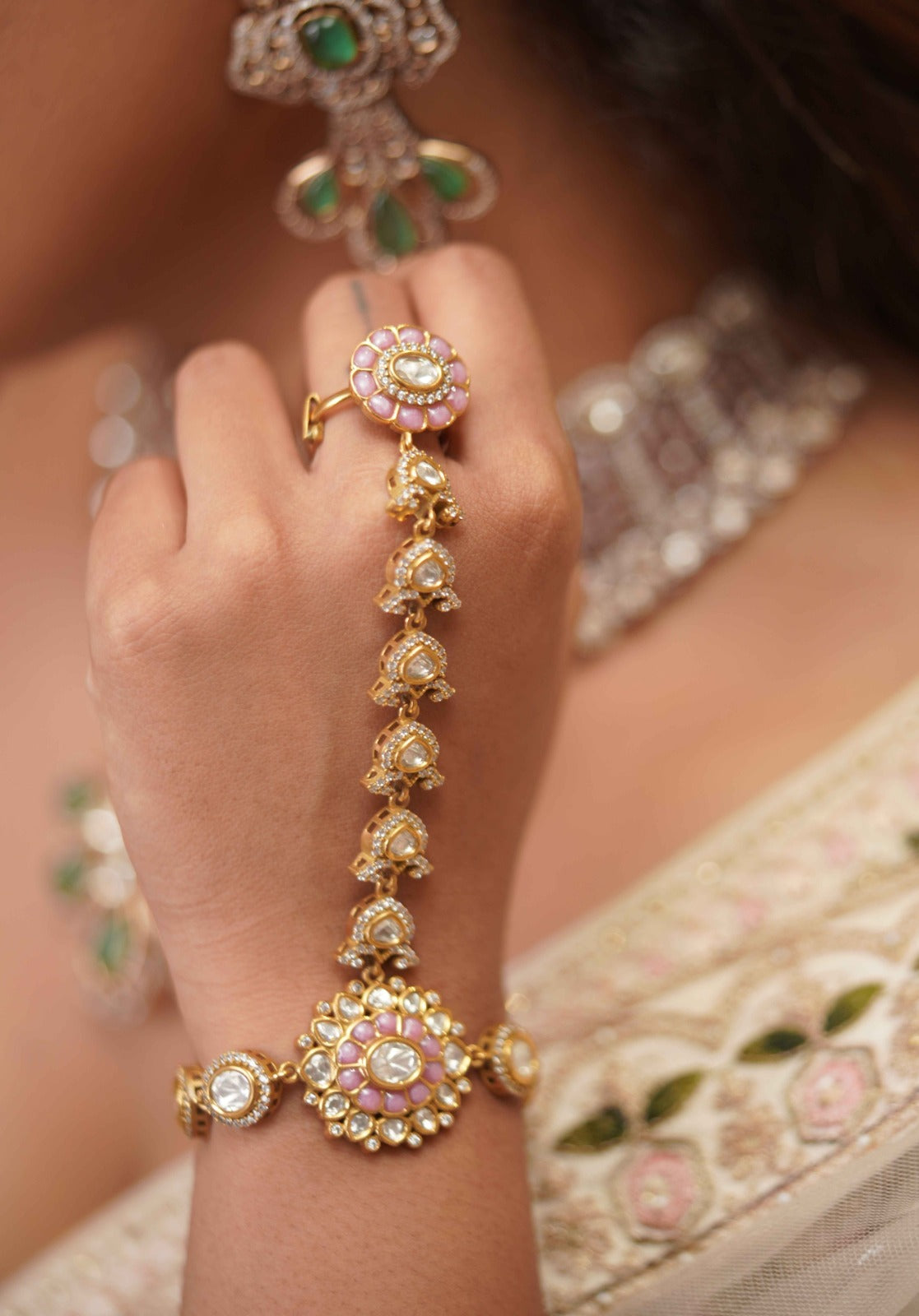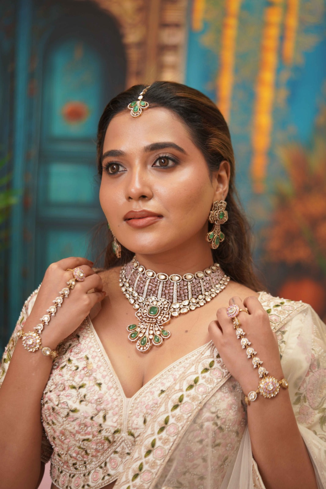 A bridal set for the most contemporary bride. A bride who has style and taste. Made with clustered coloured stones in pastel hues, this one comes with hathpans that match its demeanour and name. If You are looking for a set with some touches of mint and pink don't fail to opt for this set, and reach out to us personally for customizations.