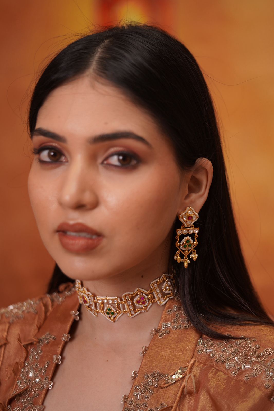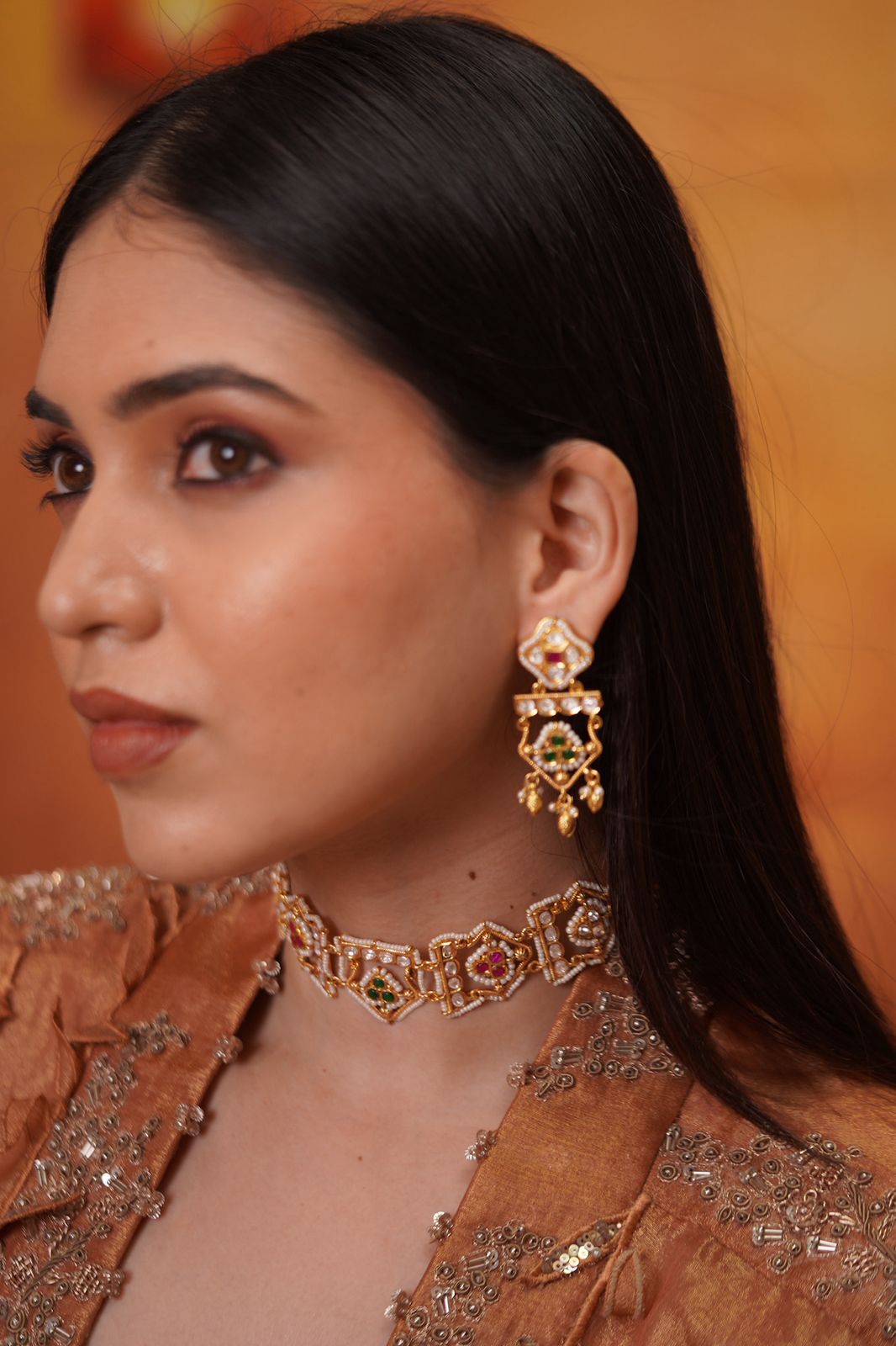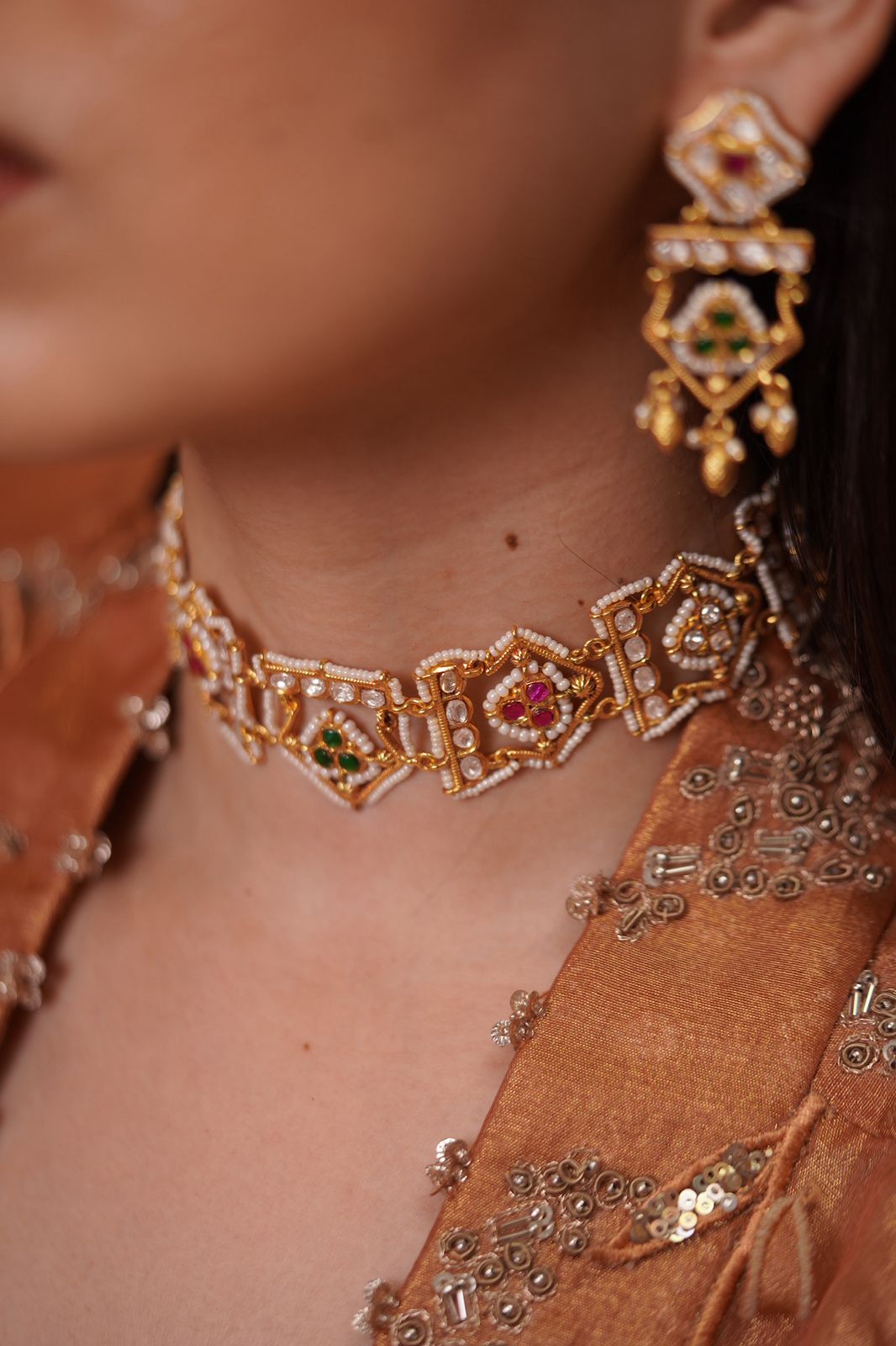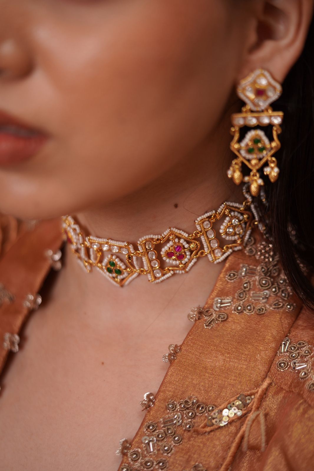 A pretty indo western choker set with a fusion of colours of ruby and emeralds put together with light weight earrings. This easy to match set perfect describes - tribal meets pretty.