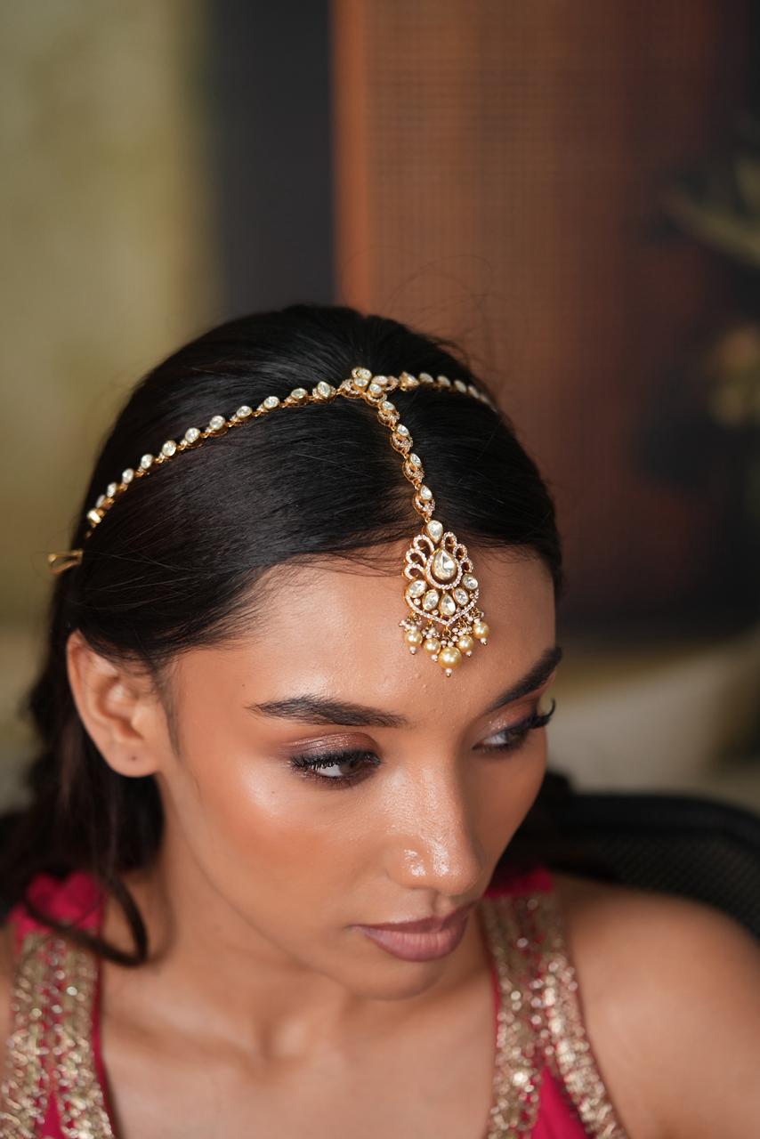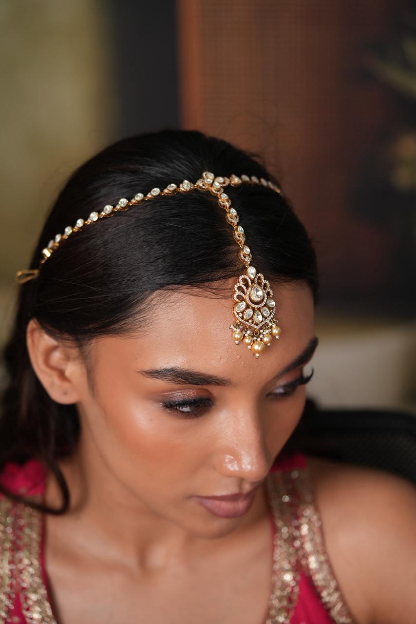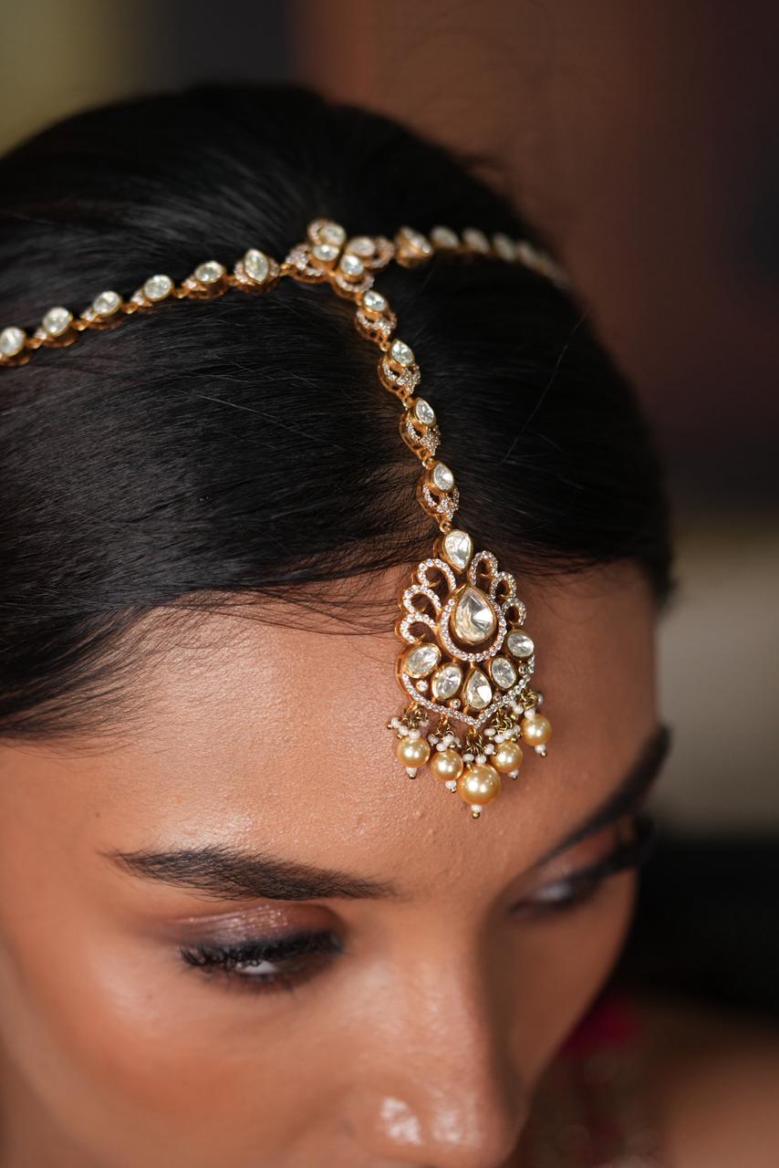 A sheeshpatti you can’t go wrong with. Made with moissanites and uncut diamonds surrounding your hair with grace, this one drops with the most beautiful pearls and fine finish. Not only very effective this design is the most loved too!