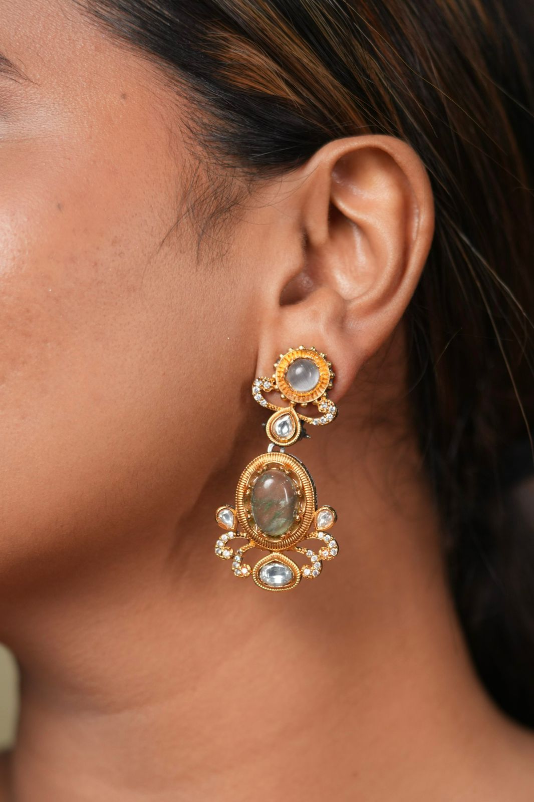 Earrings that have neautral undertones and real gemstones that make it look like royalty. Simple but so elegant, no?