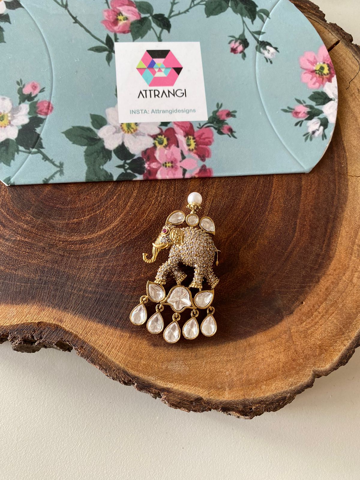 A diamond studded elephant with minute Polki detailing and pearl on top and dangling Polki drops at the bottom. This mid sized brooch, is literally art turned to jewellery.