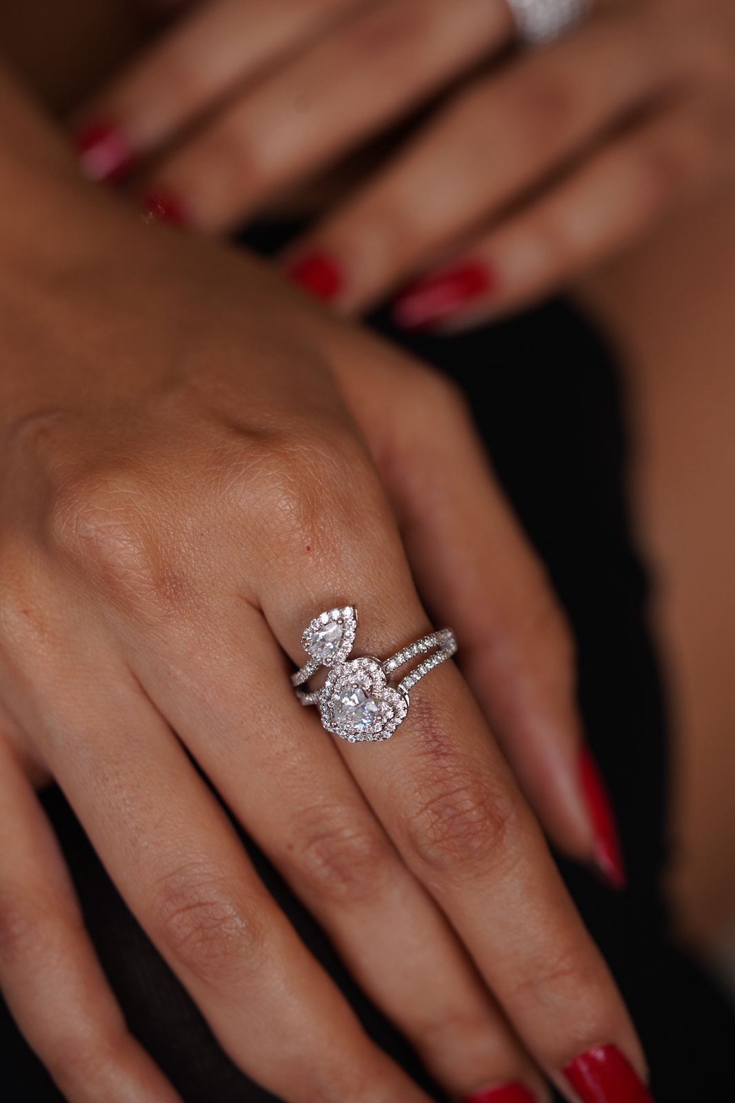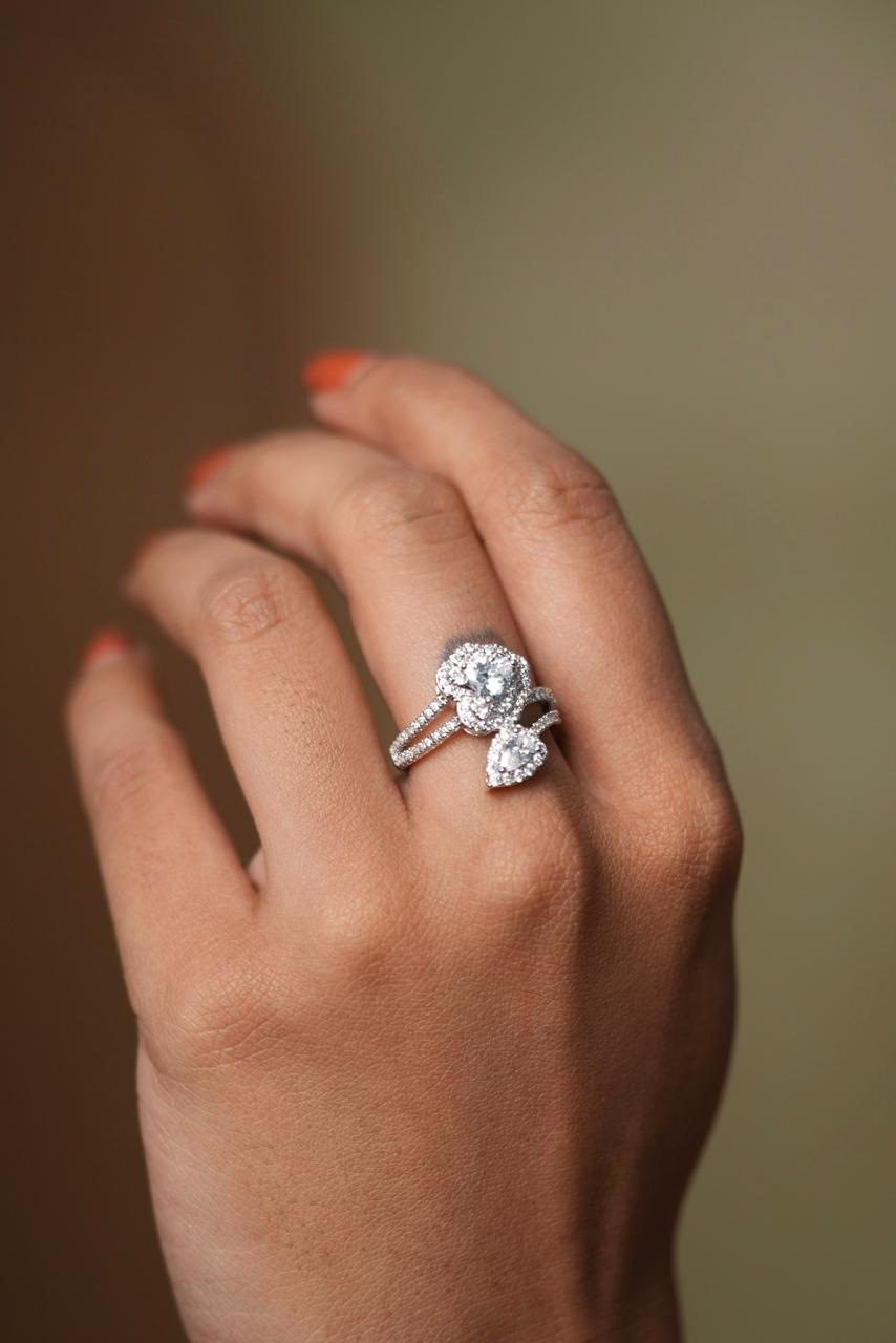 A gorgeous ring with an almost 2 carat heart shaped soltiaires with halo and a pear shaped soltiaire at the bottom. This wrap style dual soltiaire ring has the most offbeat design, that is perfect for someone who loves big soltiaires.