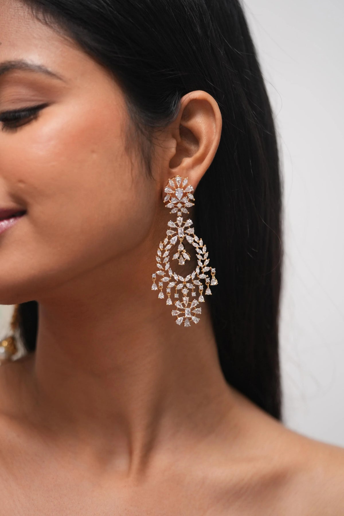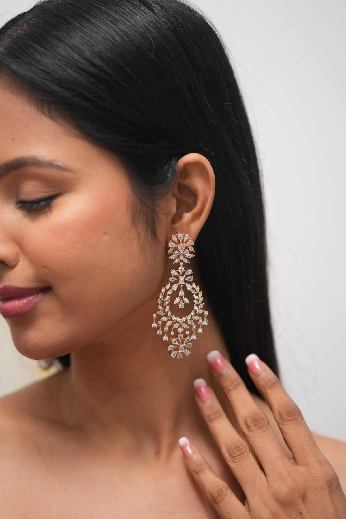 A dazzling symphony of sparkle and elegance, the Jhilmil Long Diamond Earrings are designed to turn heads. Featuring a cascading silhouette crafted with precision-set diamonds and finished in radiant gold polish, these earrings bring festive glamour to any ensemble.