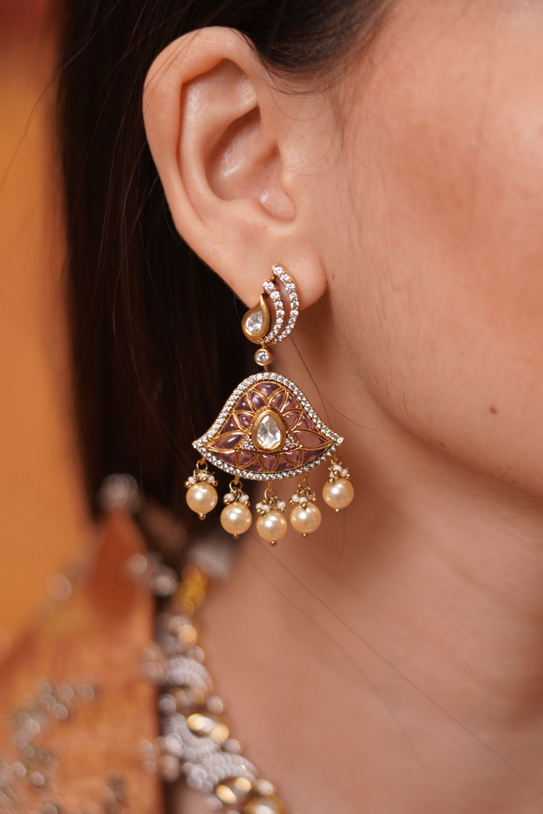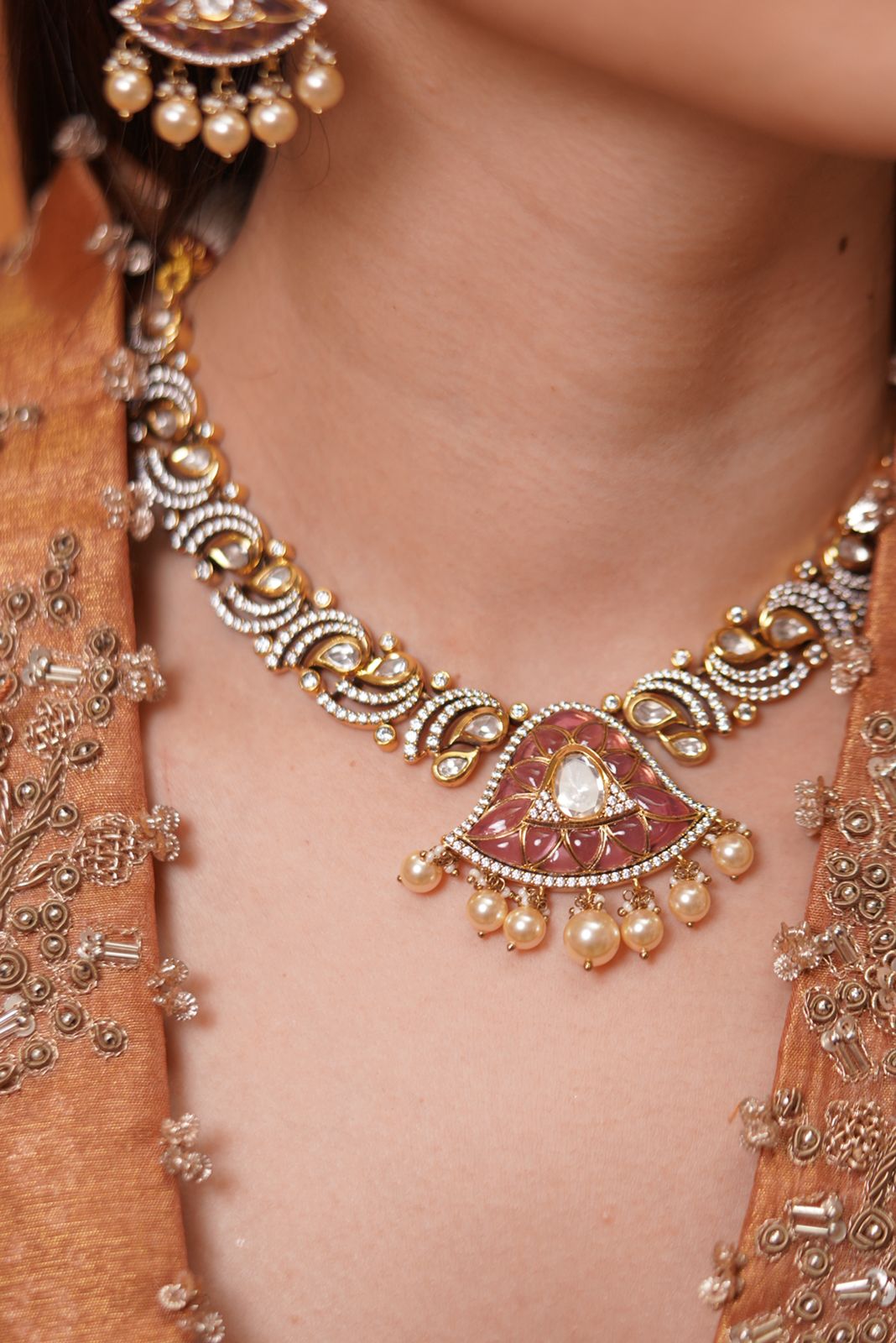 The most classic uncut diamond set with a broad pendant in the center that has epoxy Meenakari detailing and uncut diamonds assembled leading to the pendant. So stylish and offbeat, this set sincerely serves the most designer look.