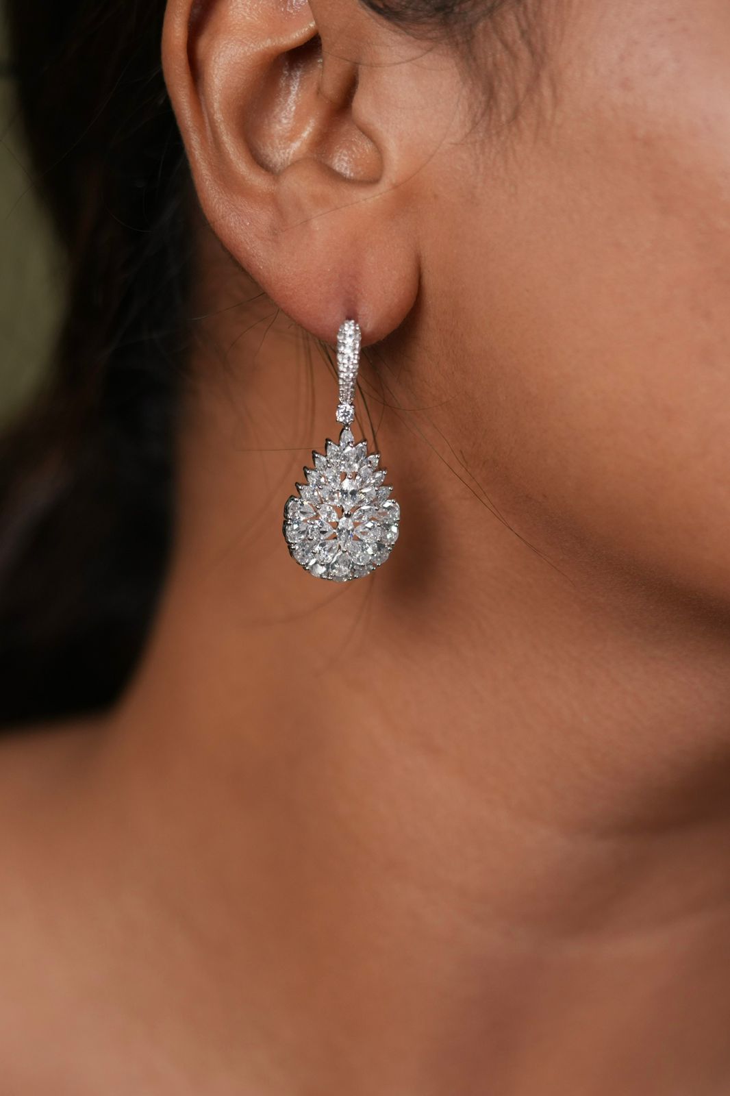 A diamond earring with a Bali style on top and clustered marquise and pear shaped solitaires.