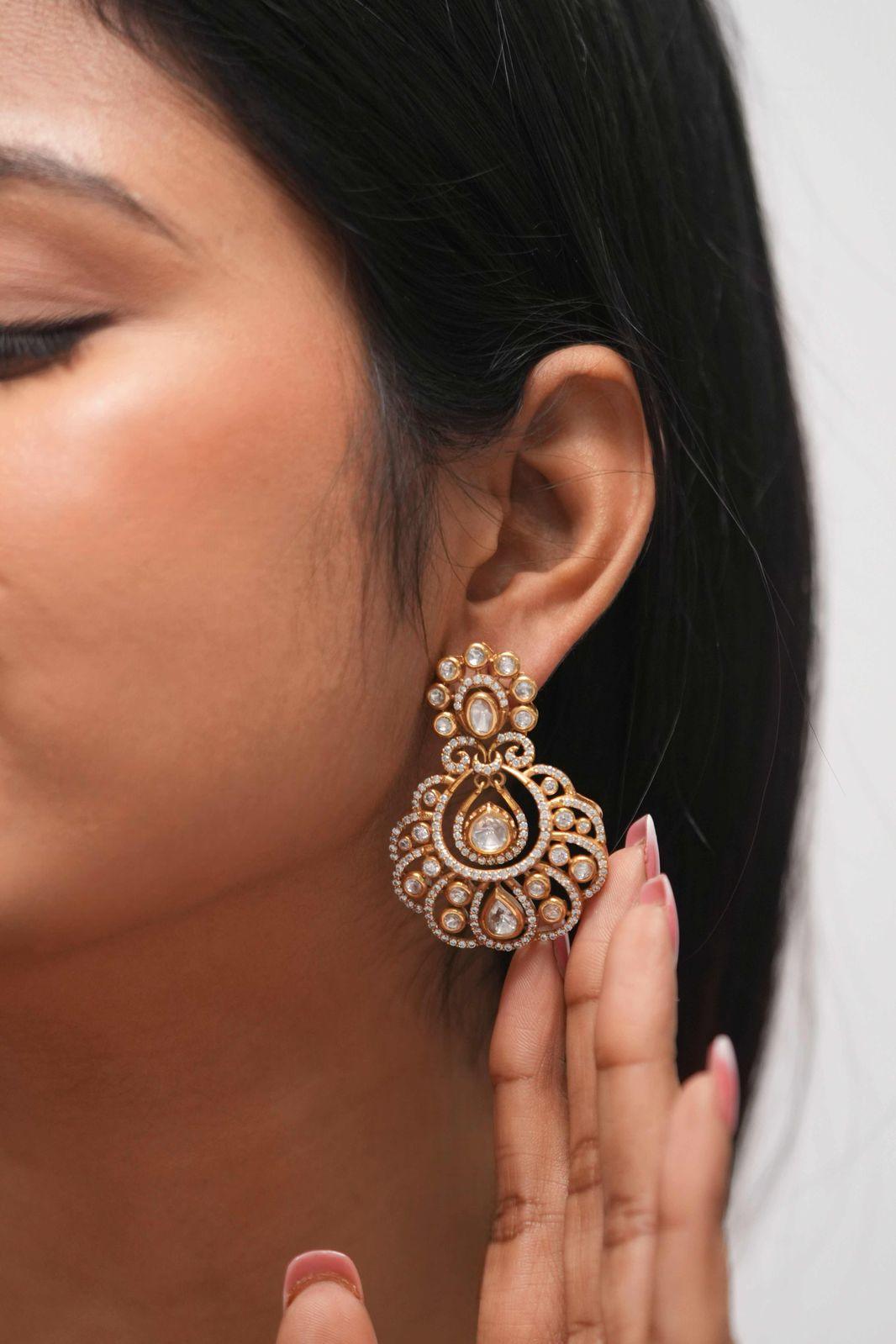 Elegant, mid-sized polki Chandbali earrings – superbly weightless with an authentic appearance, crafted with brilliant moissanites and featuring a distinctive gold polish. These versatile pieces pair beautifully with pendants or as part of a complete set. Also available in a stylish monkey color option for additional variety.